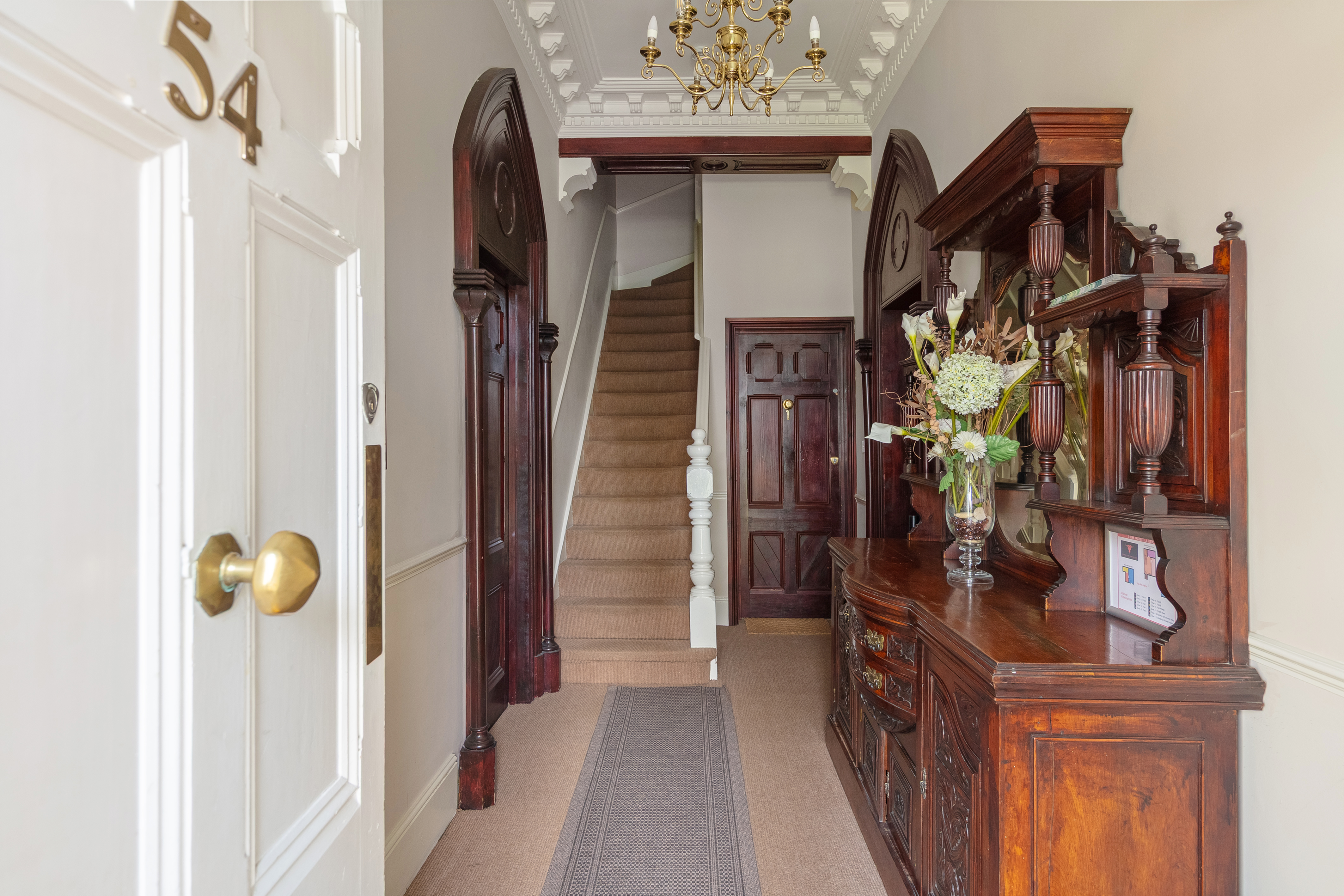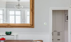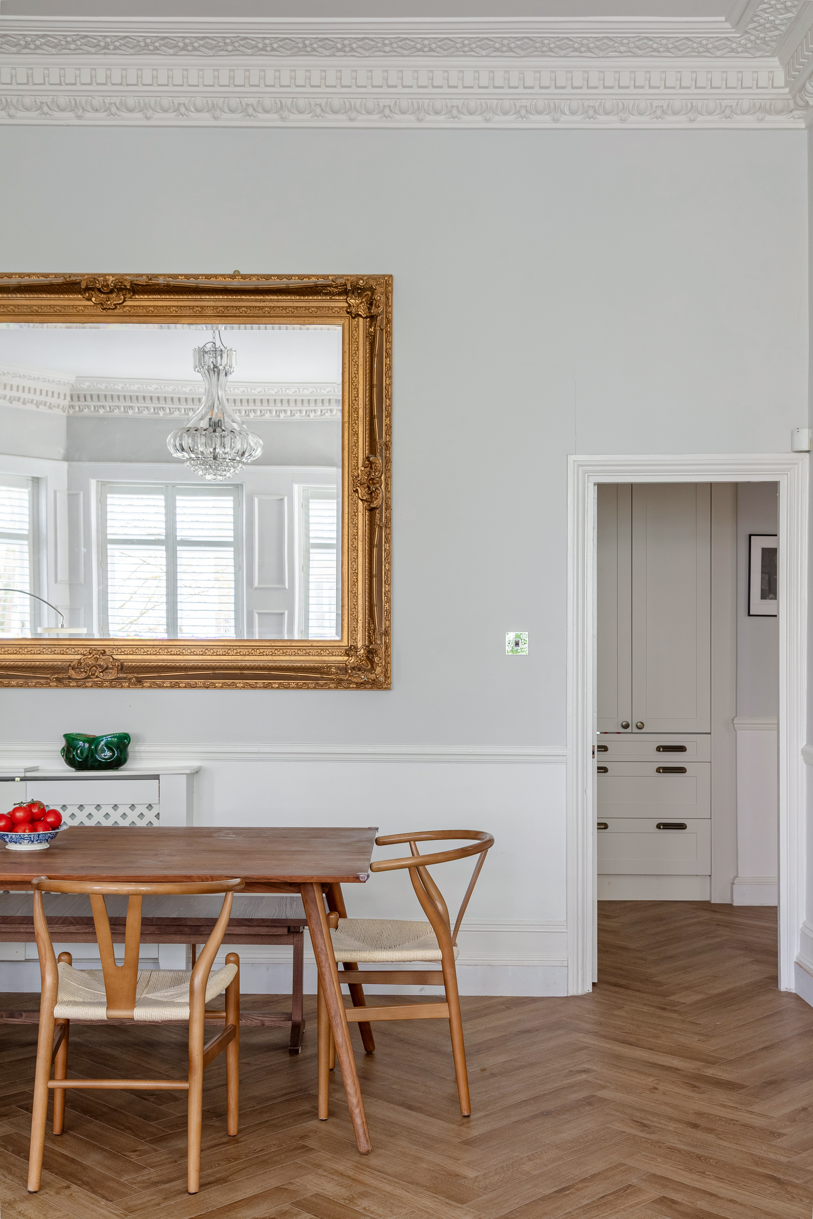 The hallway carries the same quality — herringbone flooring, full-height custom built-in storage with matching antique brass handles, dado panelling, and a picture rail. New radiators throughout the flat were installed in 2025, and the electrical circuit was fully upgraded in December 2024, including a new fuse box — so the bones are as sorted as the surfaces.