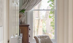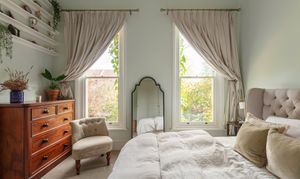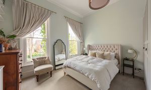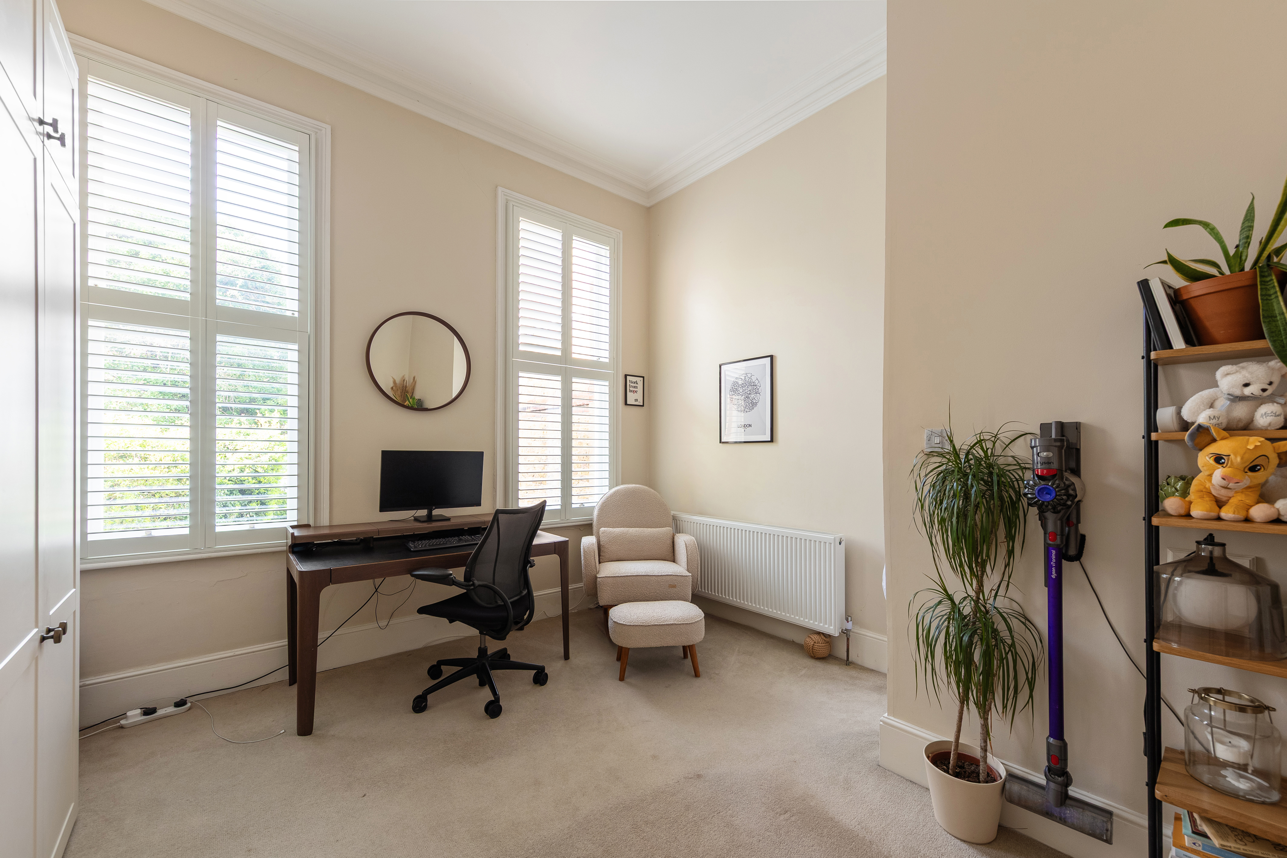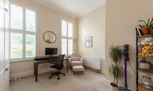 Bedroom one is a proper principal bedroom with the same ceiling height and plasterwork as the reception room. Two tall FINEO-glazed sash windows face the garden, and the room takes a large bed with generous space either side along with freestanding storage without any compromise. Bedroom two is equally generous — a full double with its own bay window, bespoke shutters, and the same ceiling detail. The extra-tall custom built-in wardrobes that run along one wall have been designed to use every centimetre of the ceiling height — proper storage rather than an afterthought. Guest room, nursery, or home office, it handles all three without much effort; the current owners use it as a nursery and study, and it's a very good one.