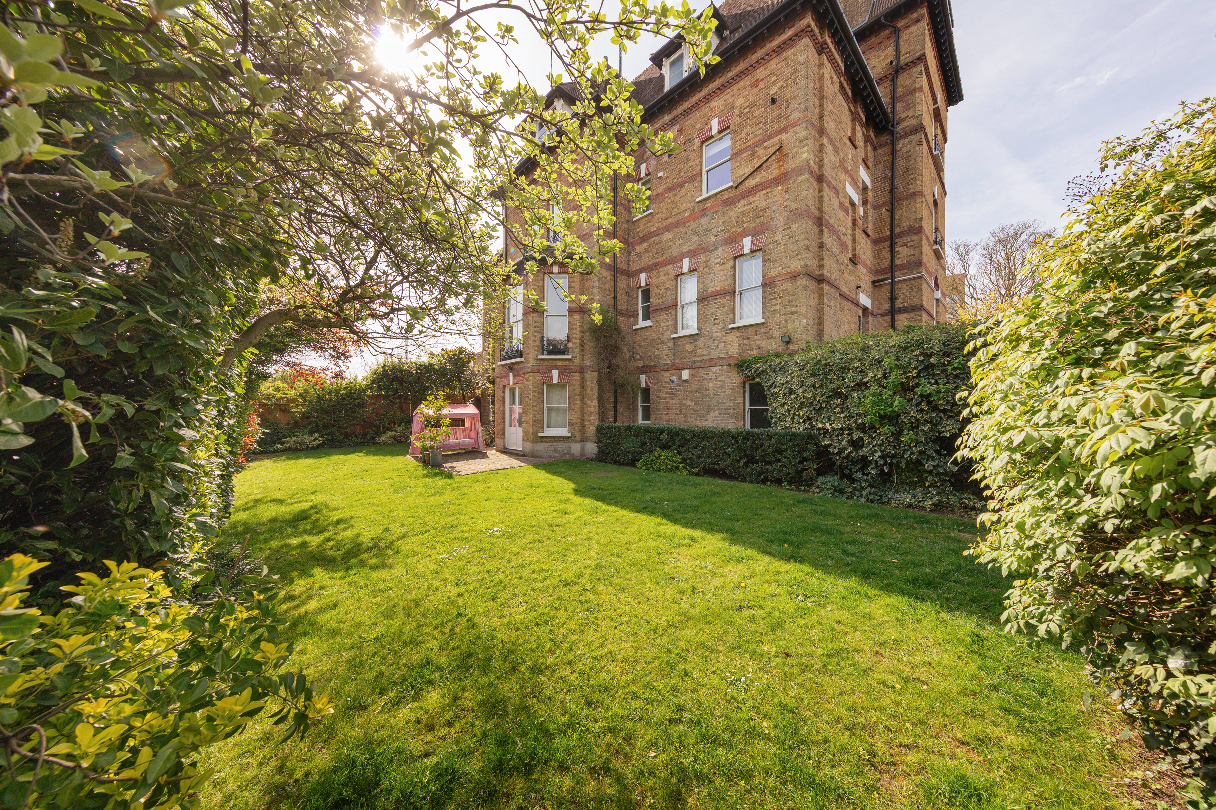 Outside, the communal garden is a proper one — a large, well-maintained lawn with mature planting and genuine privacy. Off-street parking is included. On Beulah Hill, that matters.