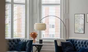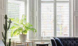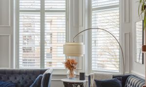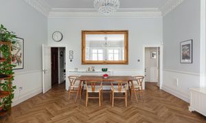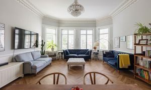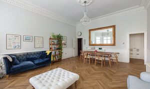 Step inside, and it only gets better. The reception room is the standout space, and it's hard to overstate just how impressive it is at 22'3 x 18'1. The ceiling height is what you'd hope for from a Victorian raised-ground-floor reception, the period coving runs the full perimeter in remarkable condition, and the ornate ceiling rose is impressively intact. Herringbone luxury vinyl tile runs throughout — installed in 2025, elegant underfoot and built to last — and the bay window, surrounded by wood panelling, now fitted with state-of-the-art FINEO glass delivering triple glazing performance in a slimmer, lighter unit, faces the front and pulls in generous light from the south. Bespoke wooden shutters, custom-fitted throughout the flat in 2025, finish the windows beautifully. The current owners run a large twelve-seat dining table at one end and a full sofa arrangement at the other, with floor space left over. You could reconfigure this room a dozen different ways, and it would work every time, such is the vast amount of space on offer.