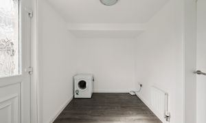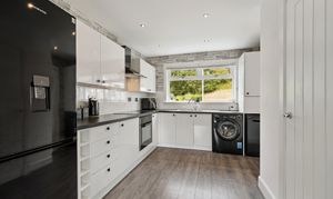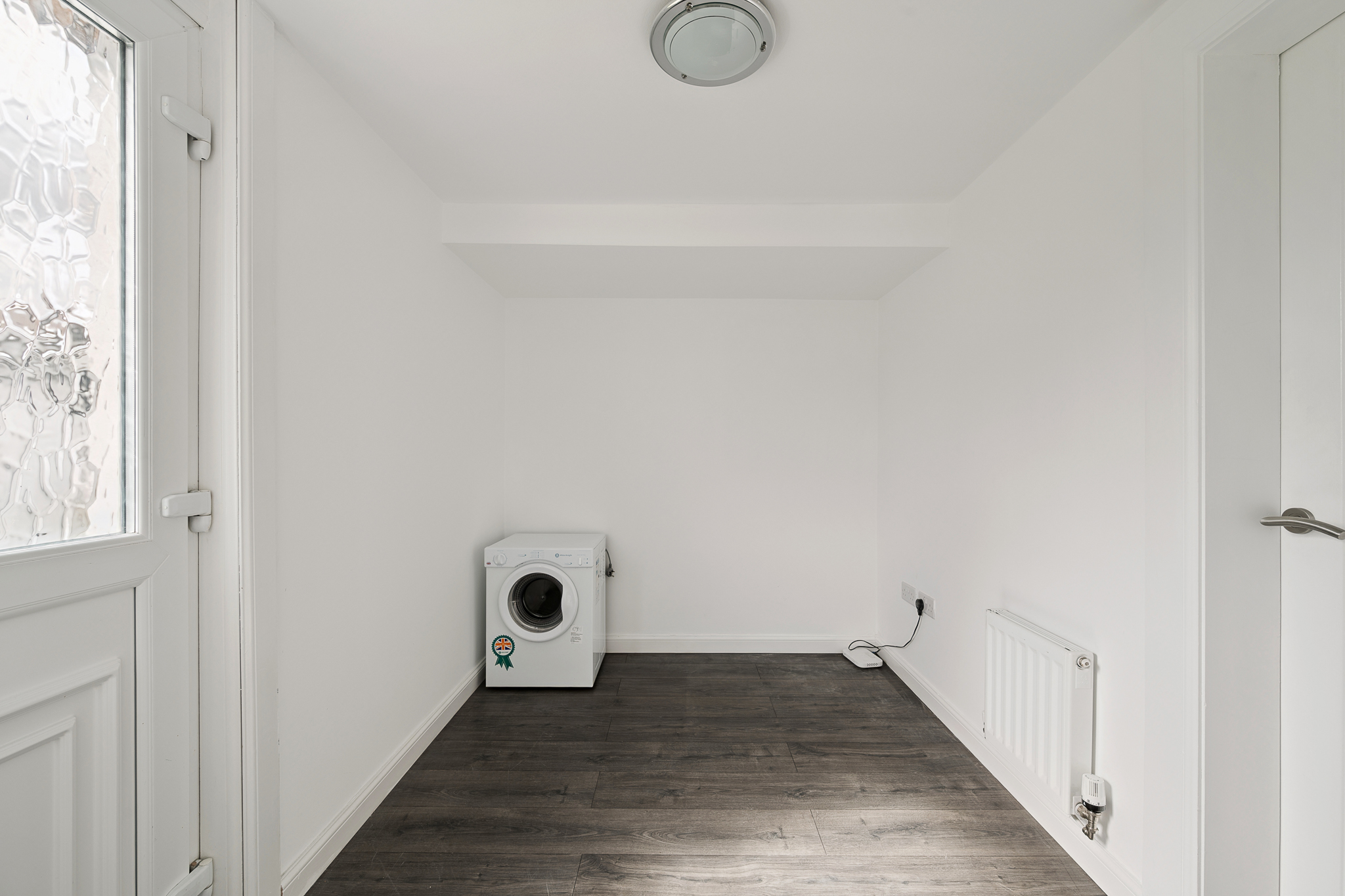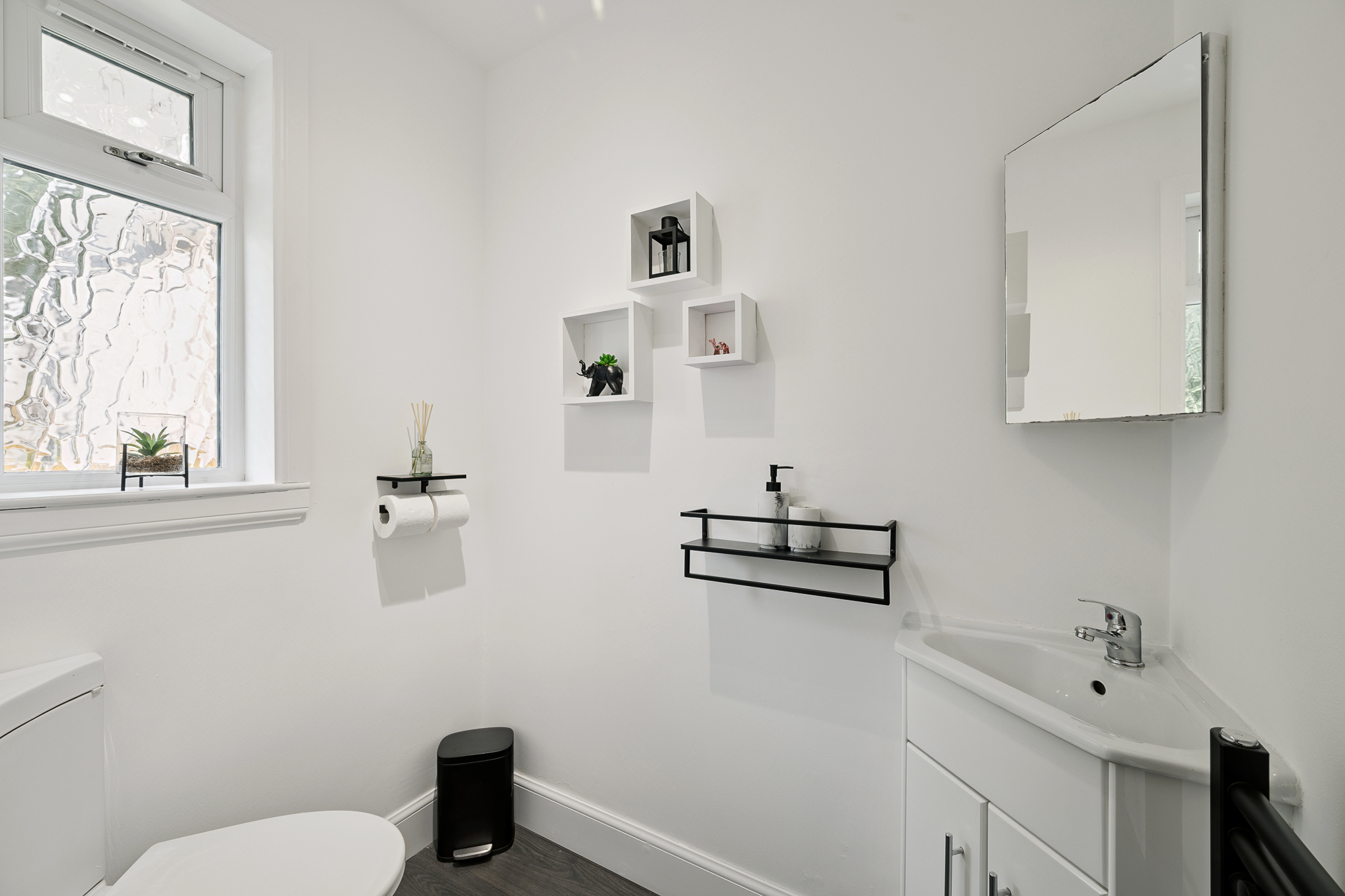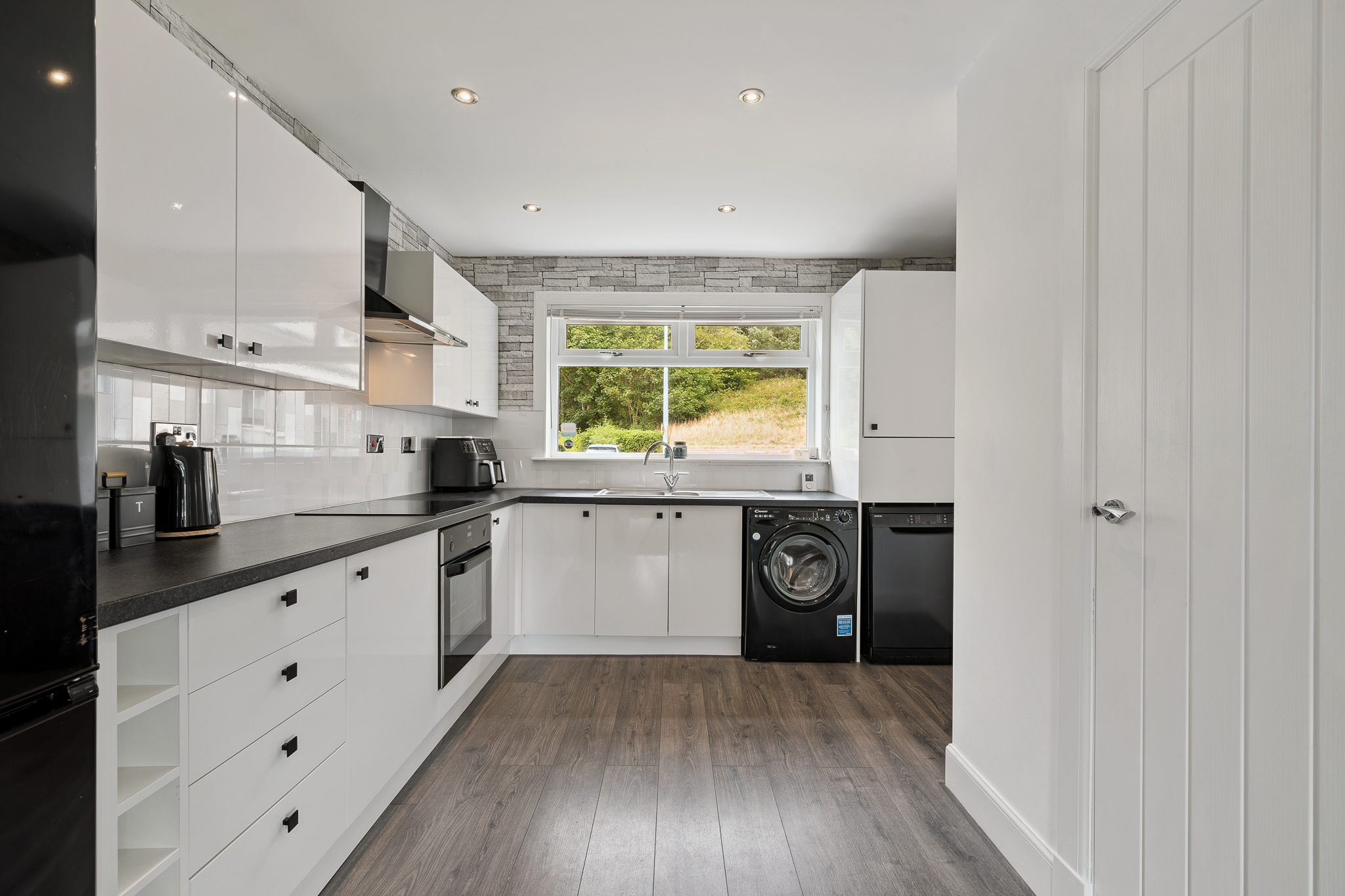 The modern kitchen is designed with both style and practicality in mind, fitted with white gloss cabinetry, black worktops, and splashback tiling. Integrated appliances include an oven and four-point induction hob, with additional space for a fridge freezer, washing machine, and dishwasher. A separate storage cupboard ensures space for everyday essentials. Completing the ground floor is a bright WC finished with chrome accents, alongside a utility room providing further storage and room for additional appliances.