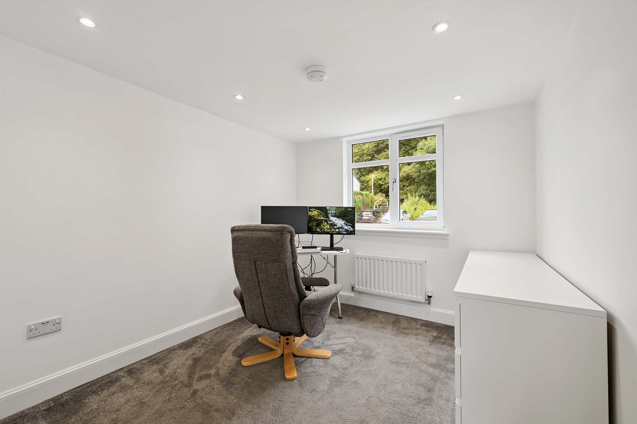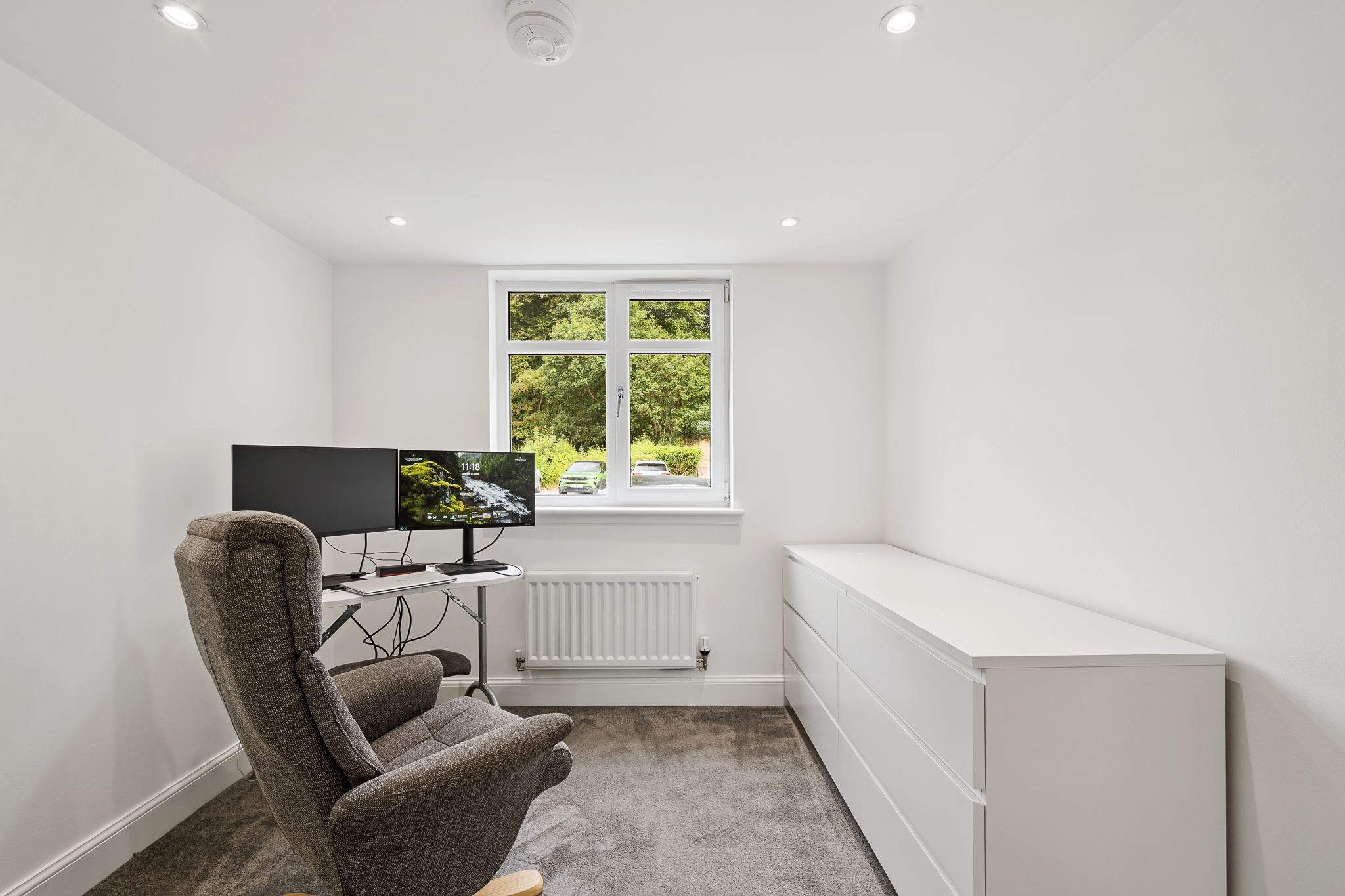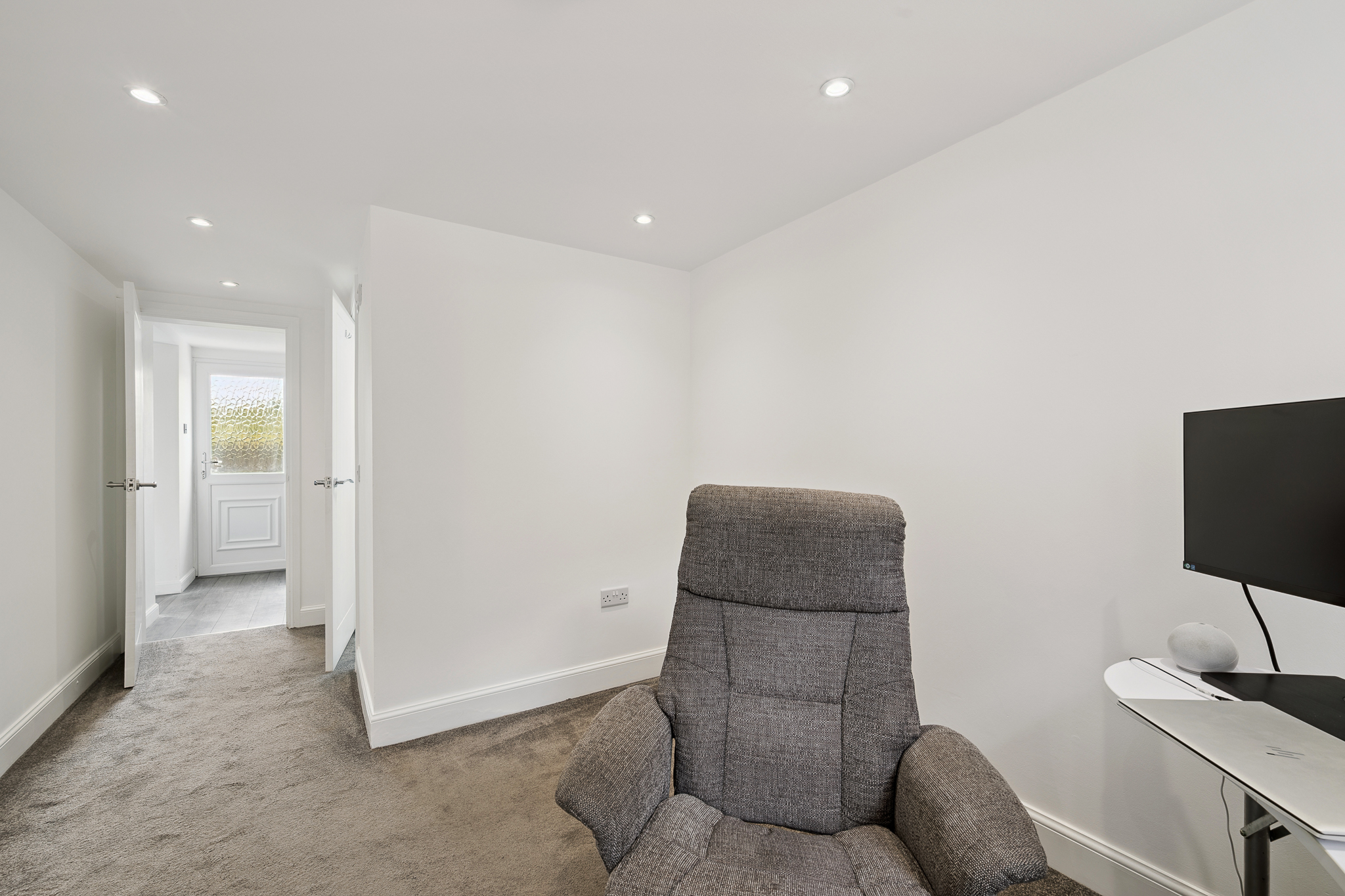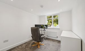 The property also benefits from a garage conversion, currently set up as a home office but equally versatile as a fourth bedroom. This spacious room enjoys its own en-suite shower room finished with contemporary grey panelling, chrome accents, a heated towel rail, and a large standing shower.