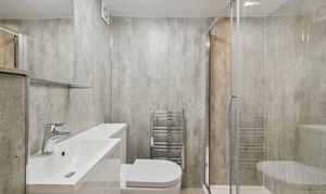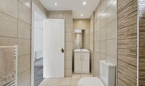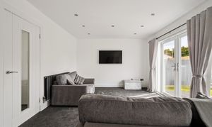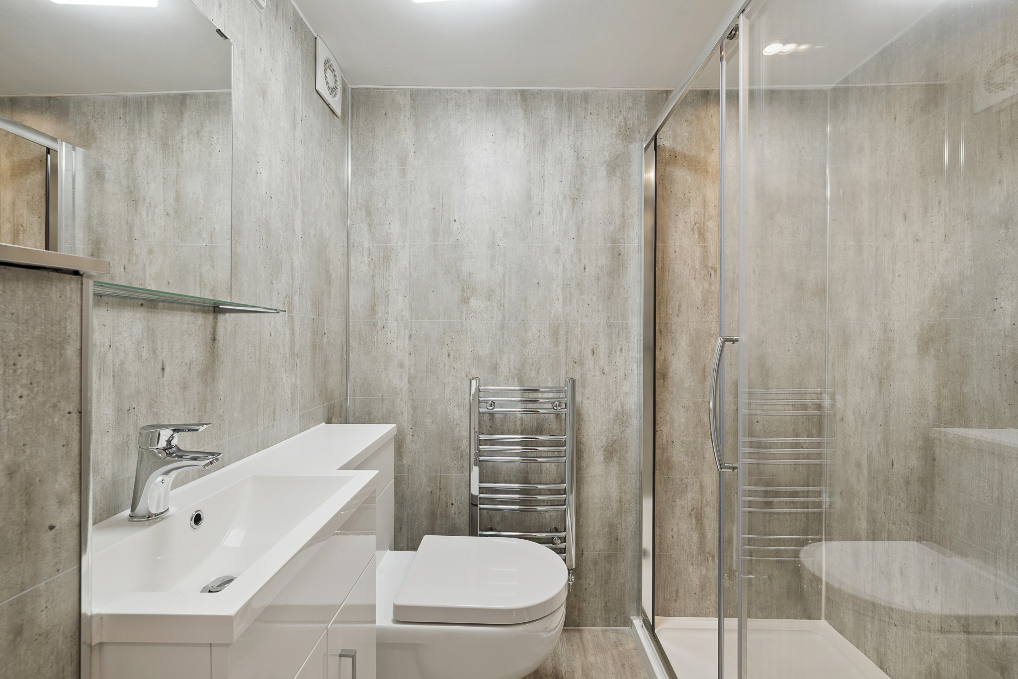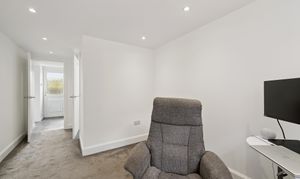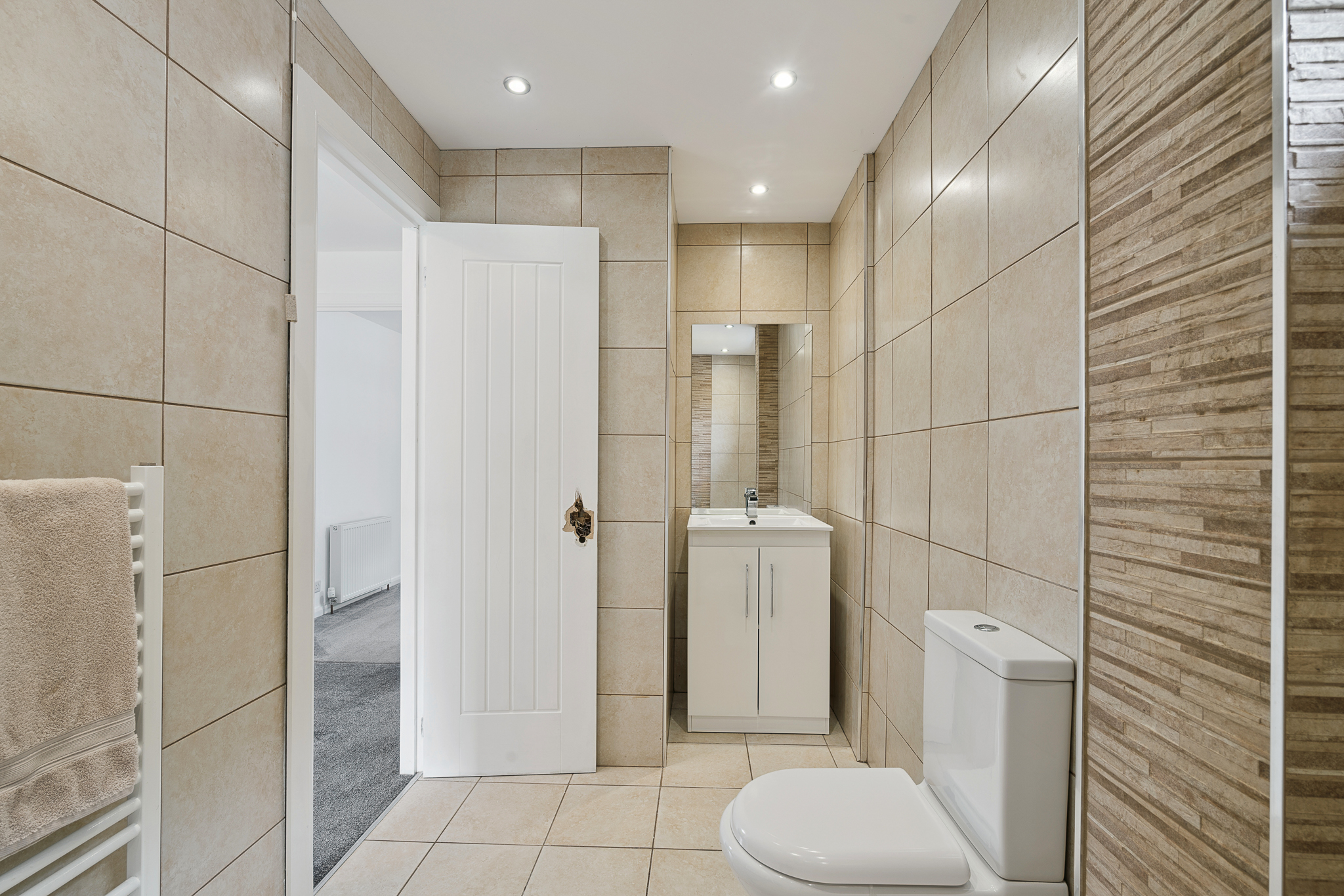 The property also benefits from a garage conversion, currently set up as a home office but equally versatile as a fourth bedroom. This spacious room enjoys its own en-suite shower room finished with contemporary grey panelling, chrome accents, a heated towel rail, and a large standing shower.