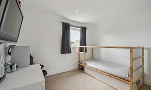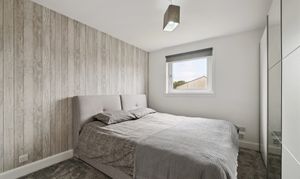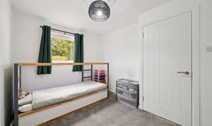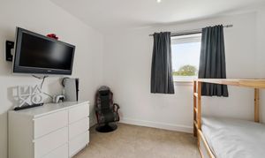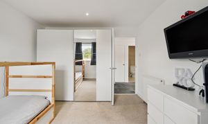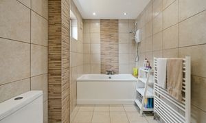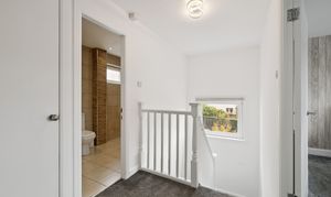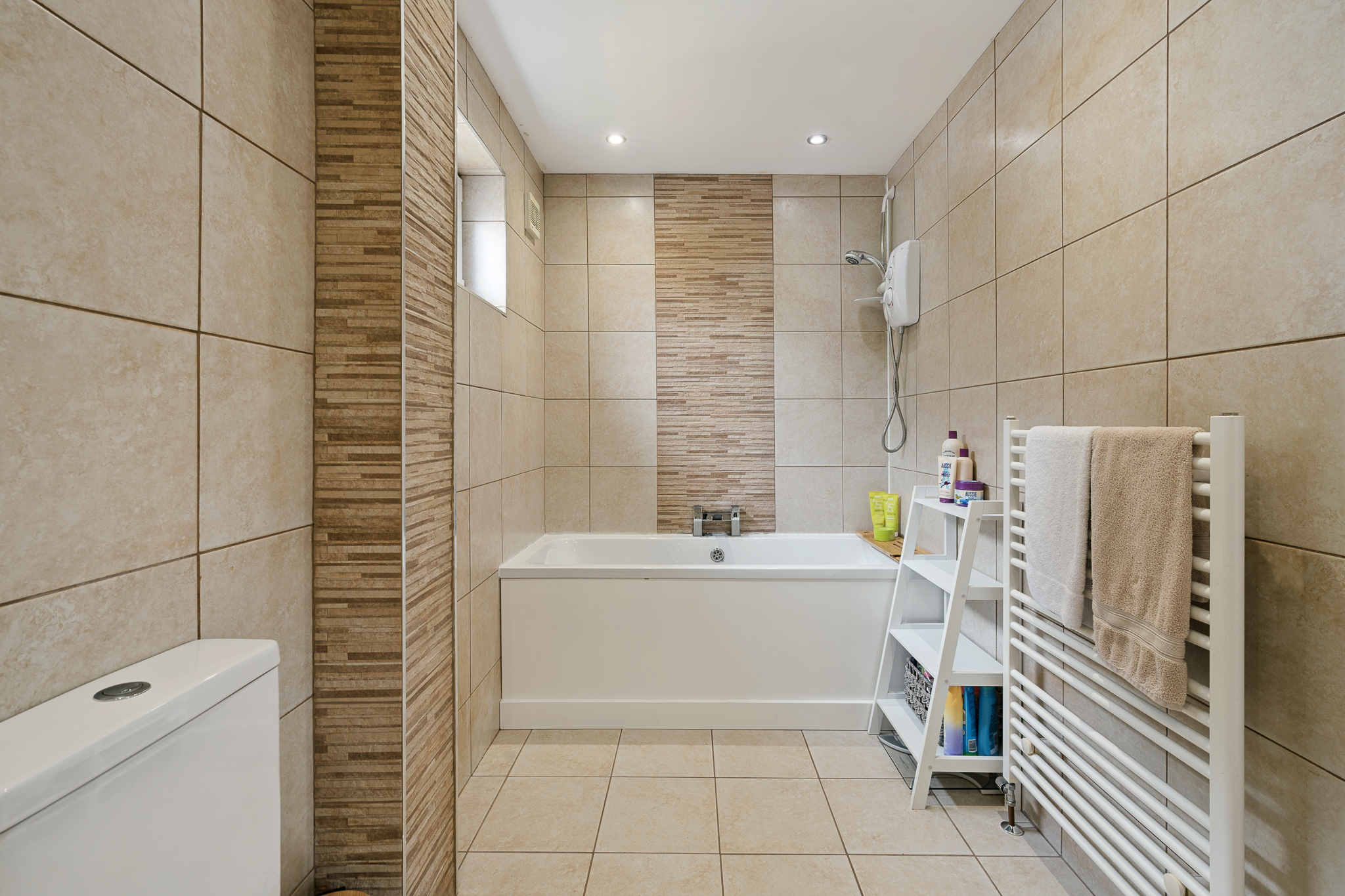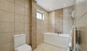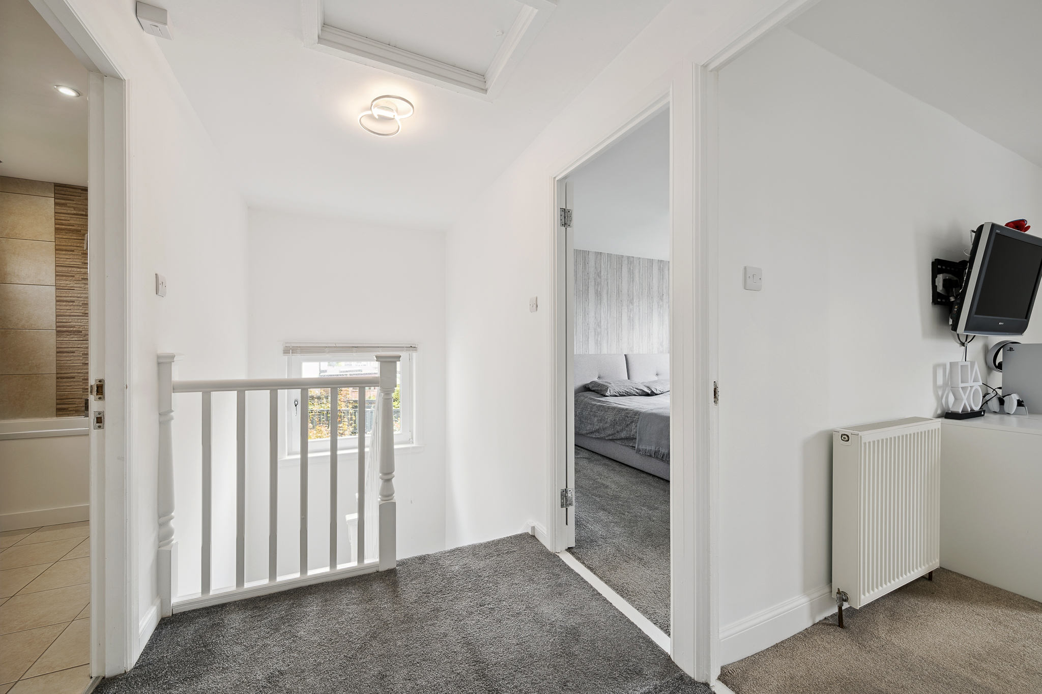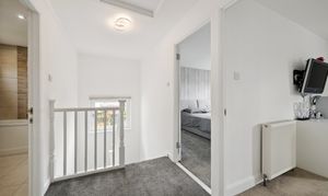 Upstairs, the landing is filled with natural light from a large window. The principal bedroom is a luxurious retreat, able to host a super king-sized bed alongside wardrobes, bedside tables, and additional storage. Two further bedrooms are also generously proportioned, each comfortably accommodating a king or super king bed with space for wardrobes and other furniture. The stylish family bathroom completes the upper level, fully tiled with a bathtub, overhead electric shower, chrome fittings, and a fitted wall mirror.