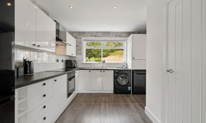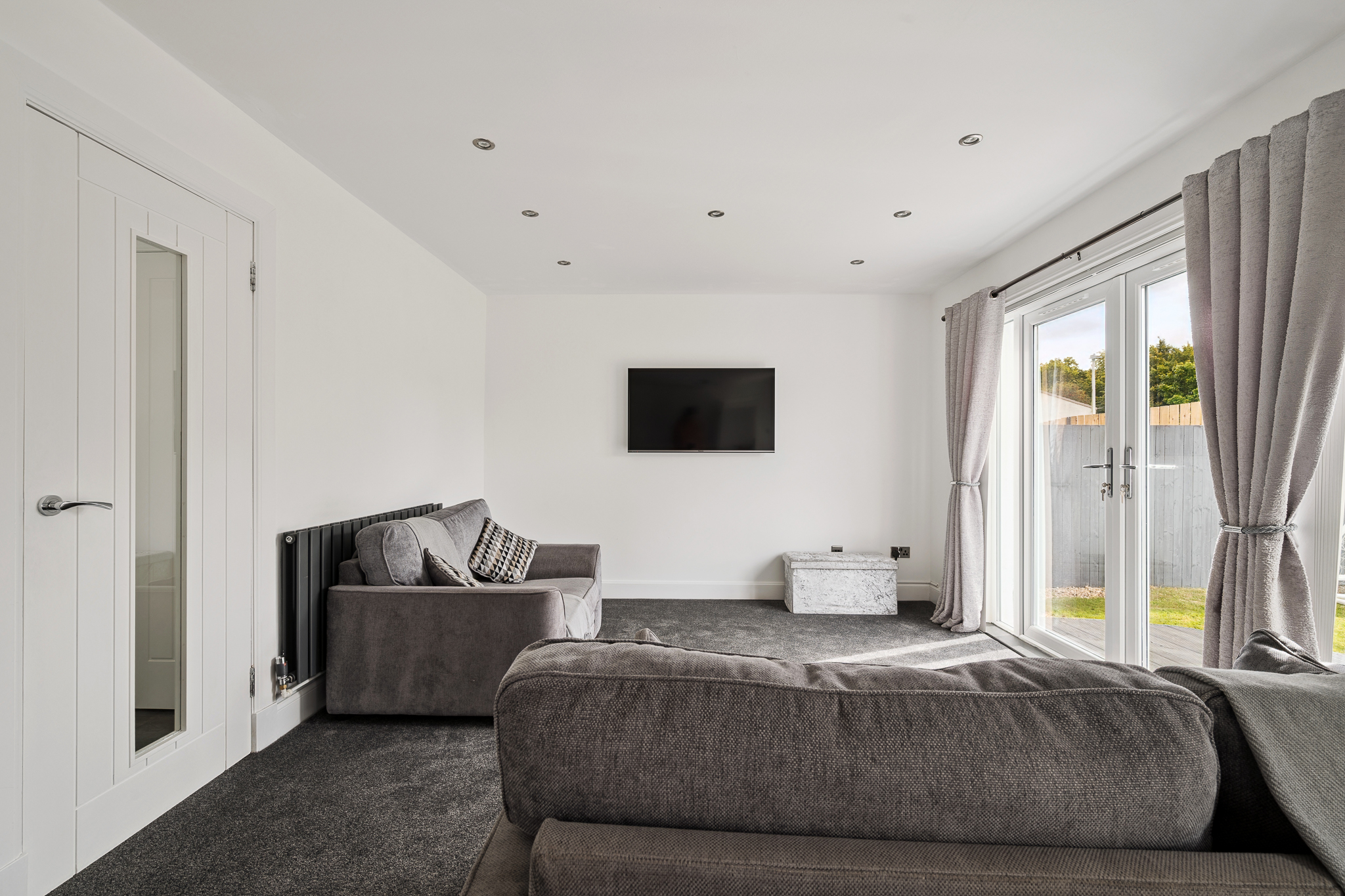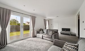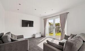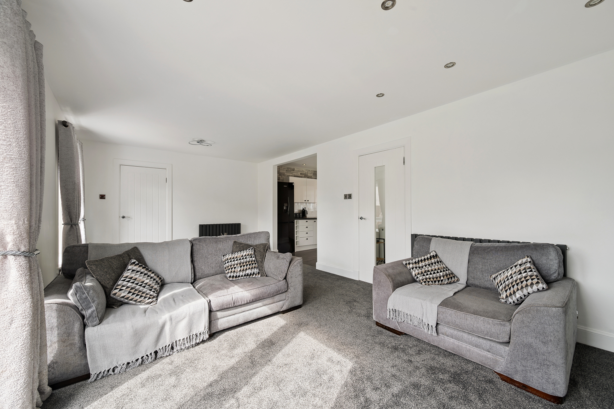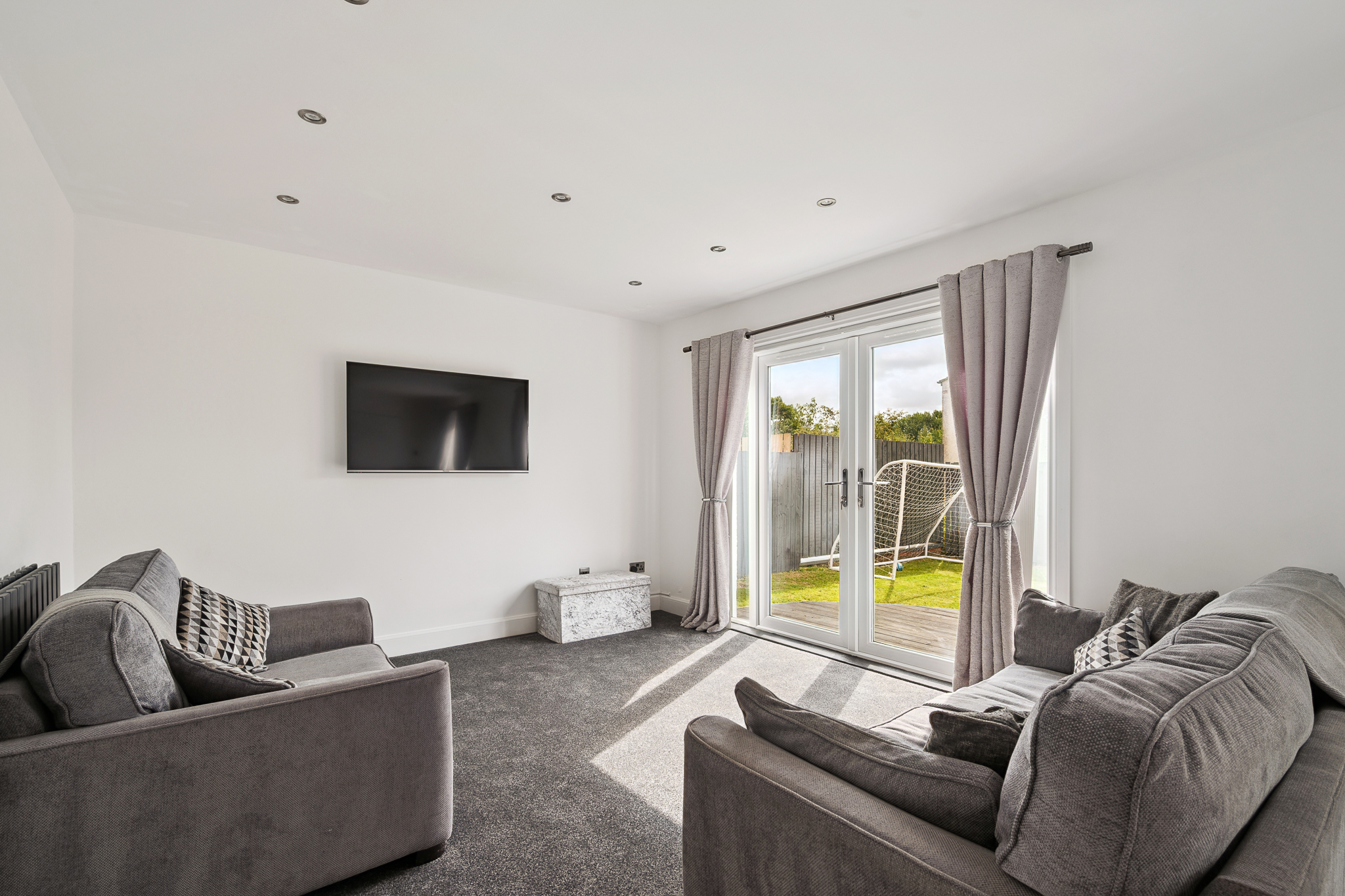 As you enter, you are greeted by a bright and welcoming hallway with handy storage under the stairs. The heart of the home is the open-plan lounge and dining area, a spacious and versatile setting that comfortably accommodates two large sofas and a family dining table. Patio doors flood the room with natural light and open directly onto the landscaped rear garden, seamlessly blending indoor and outdoor living.
