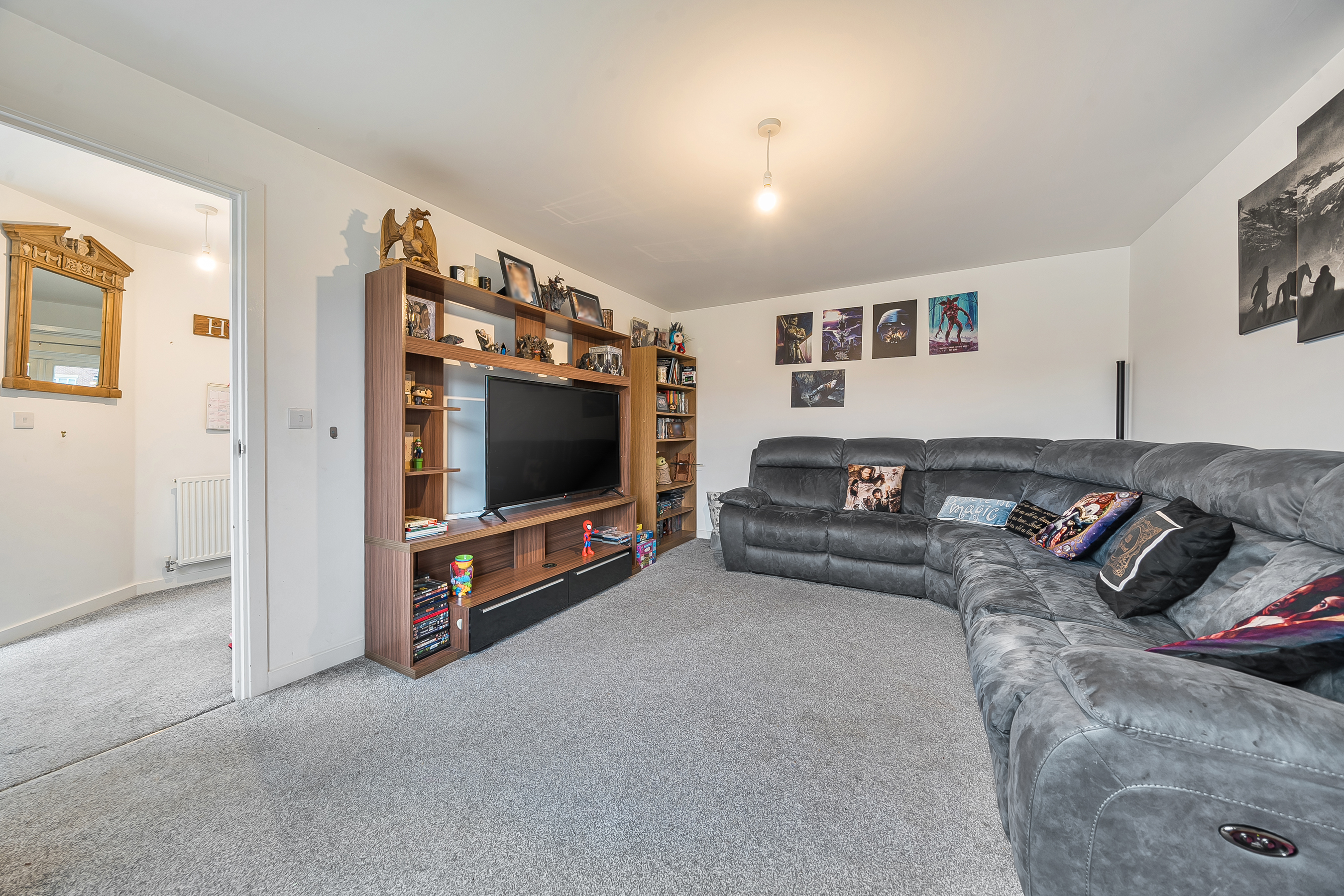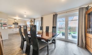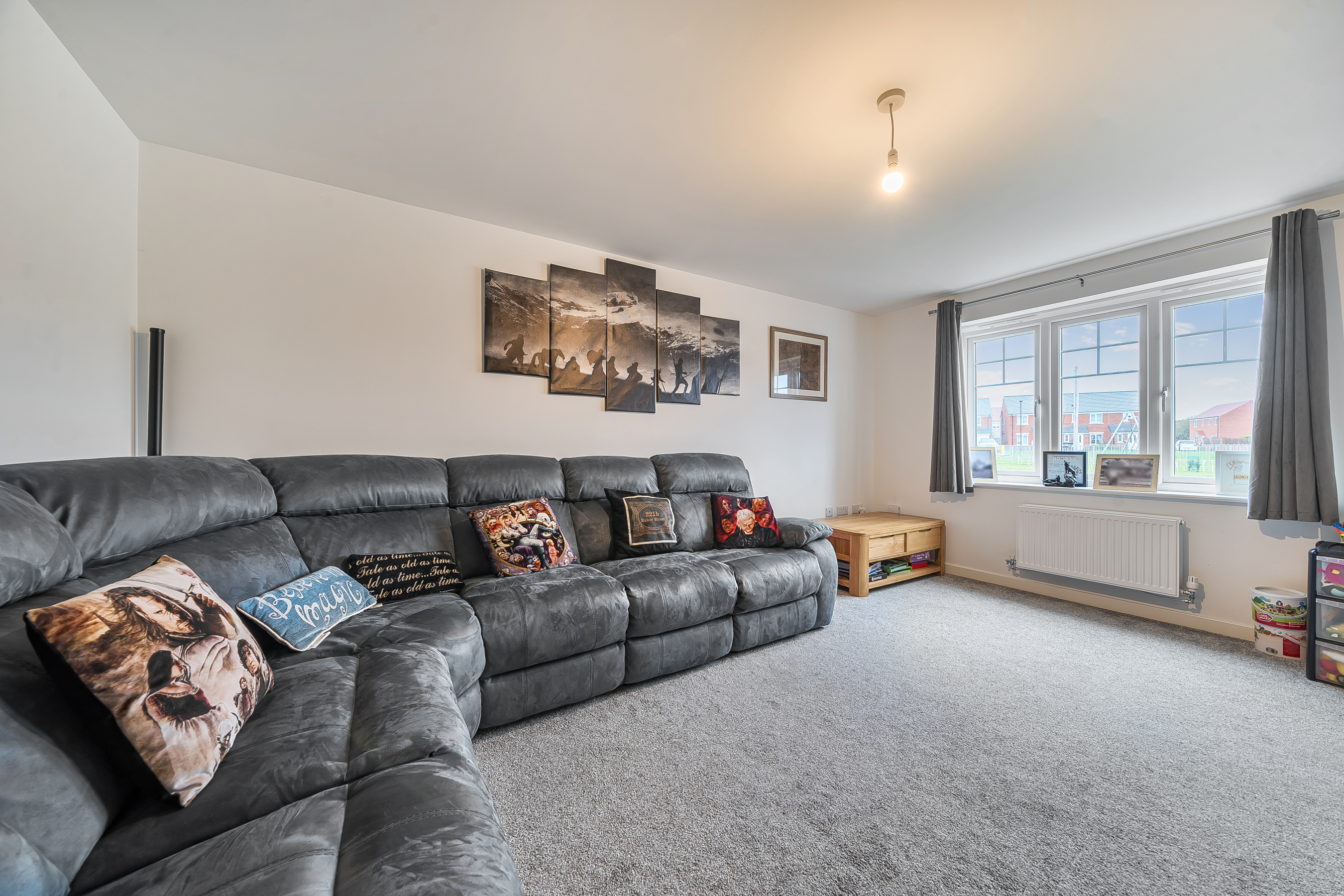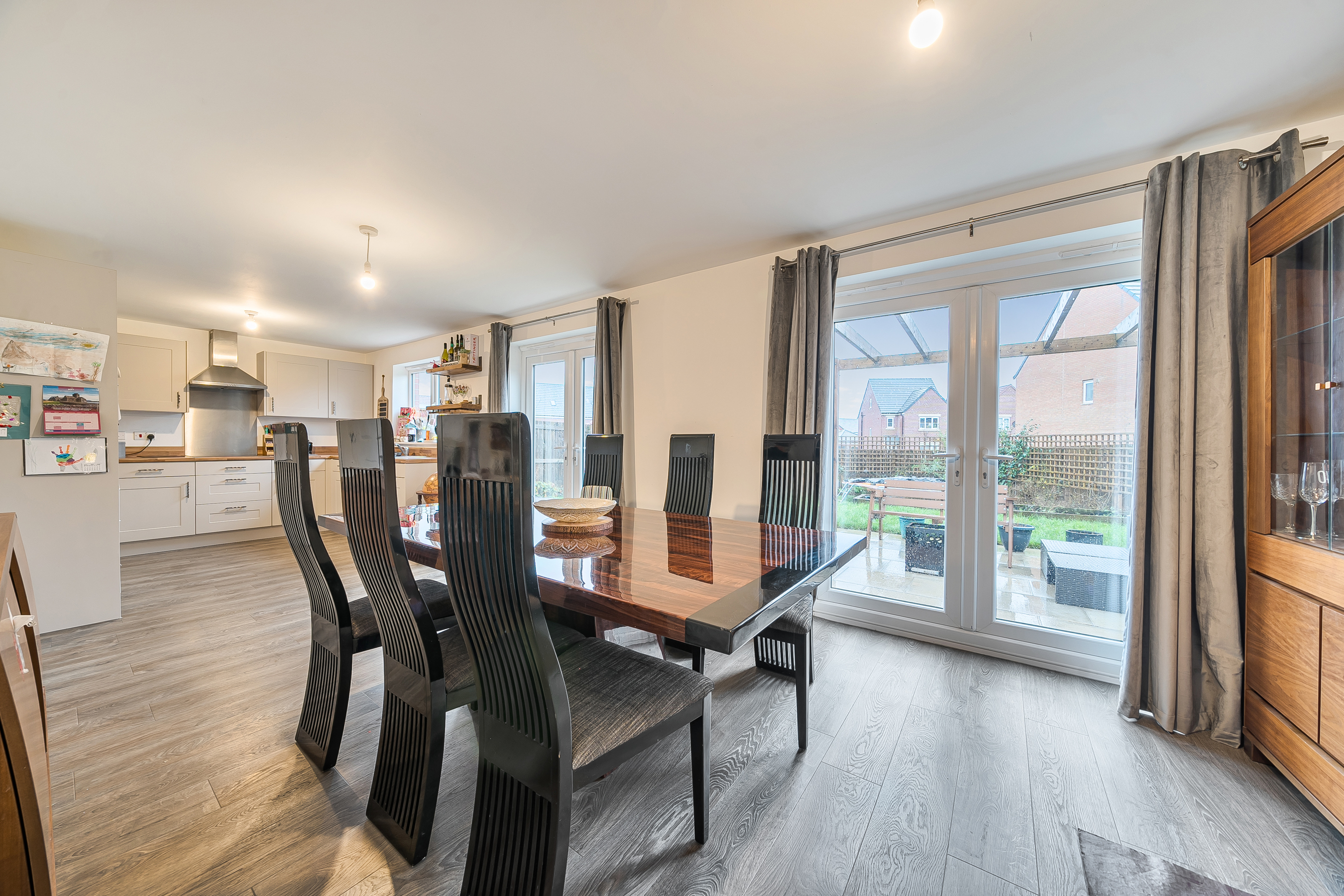 The property is approached via a well-kept front lawn and a driveway with space for two vehicles, with further parking available in the front-access garage. The front door opens into an inviting entrance hallway, complete with a useful storage cupboard and downstairs WC. Internal access to the garage is also granted from here. To the right lies a bright and welcoming reception room, ideal for family relaxation. Spanning the rear of the property is the true heart of the home: a fantastic open-plan modern kitchen/diner offering ample fitted storage, generous worktop space and room for a dining table and chairs. Twin sets of French doors open directly onto the rear garden.