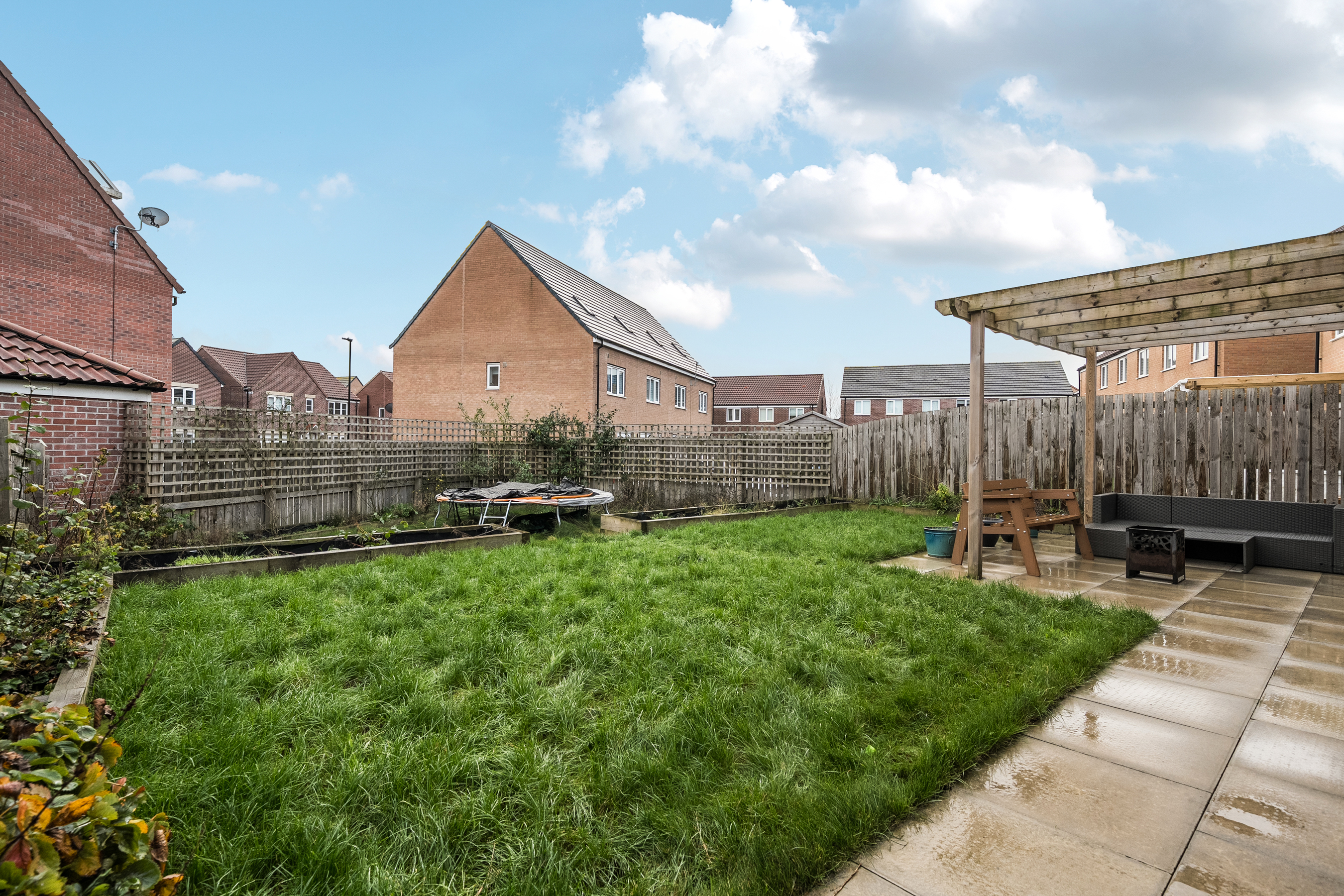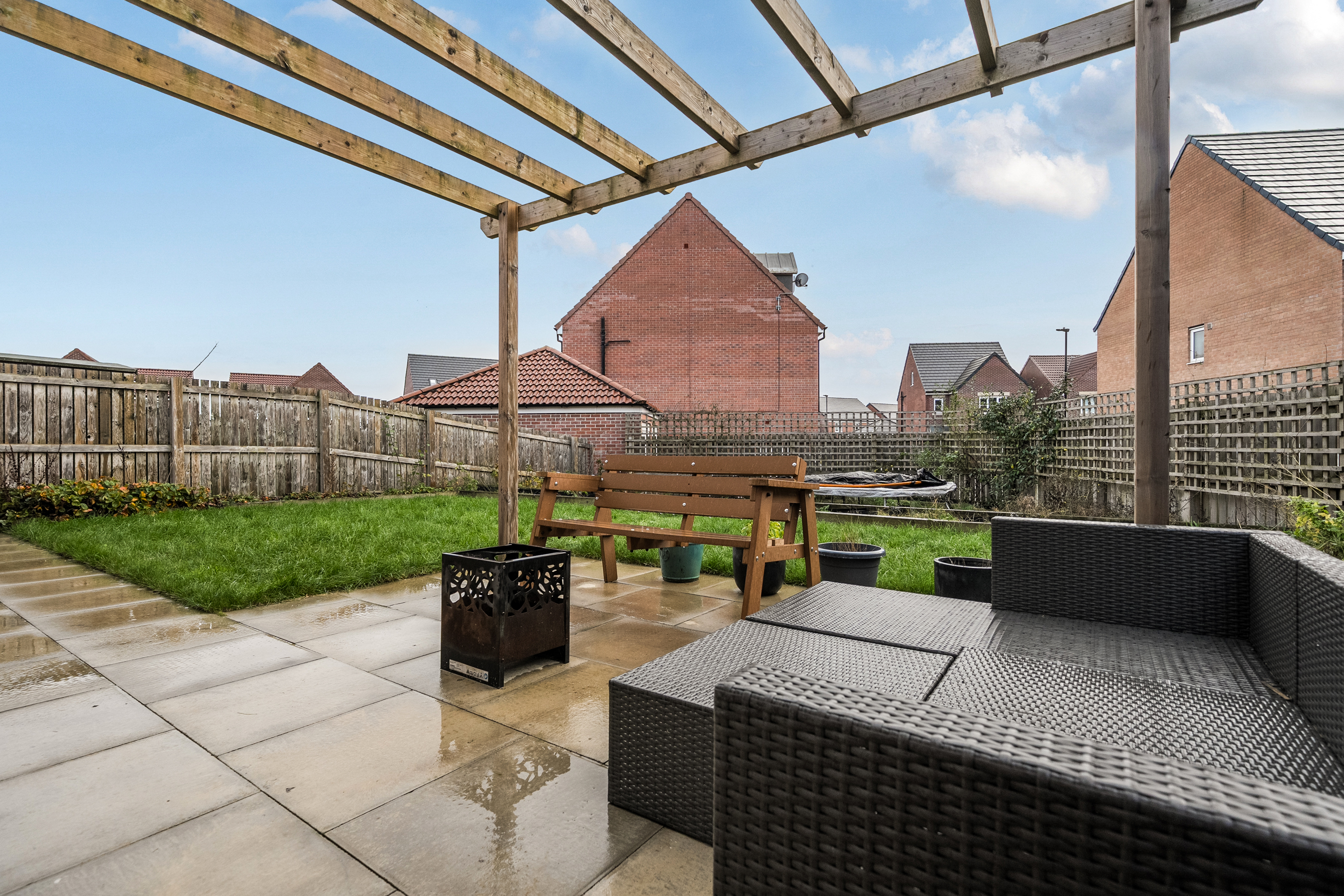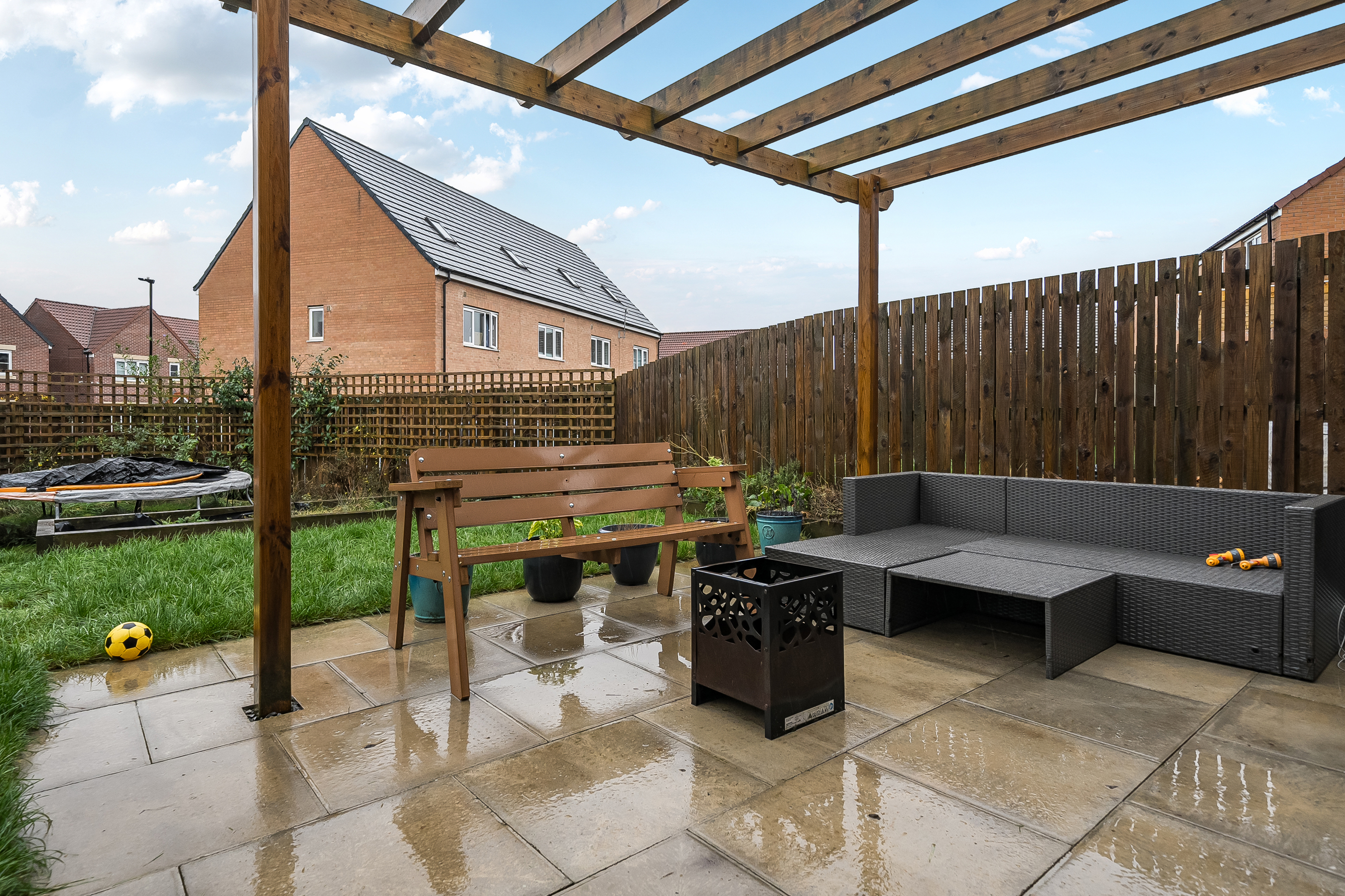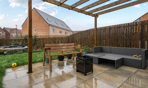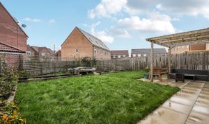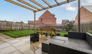 Outside, the private, enclosed rear garden is bordered by tall fencing and laid mostly to lawn, featuring a spacious patio seating area and an attractive pergola.