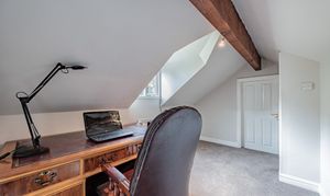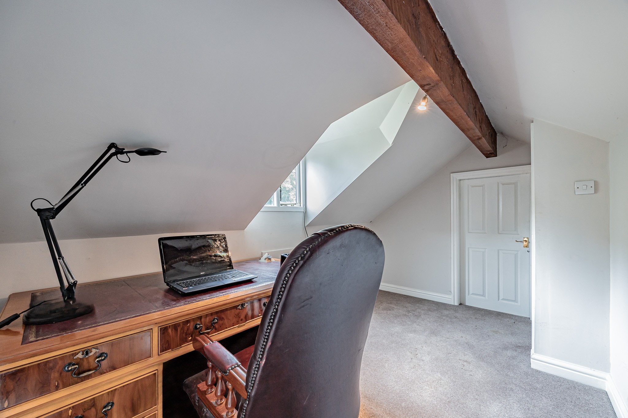Upstairs, four generously sized bedrooms are accessed from the spacious landing, with a useful storage cupboard, along with a tiled family bathroom complete with a bath and separate shower. Two of the bedrooms benefit from ensuite facilities, one with a shower, and the principal with a bath and shower. The principal bedroom is extremely impressive in scale, with built-in wardrobes, dual aspect dormer windows, space for a super-king bed, and its own private ensuite. The room also provides access to walk-in storage space. The second bedroom with an ensuite is impressive in size with views to the rear garden and courtyard. A further staircase rises to a loft, where you’ll find two additional rooms currently used as a study/office, with exposed beams, the space offers excellent flexibility for growing families or those working from home. More storage is provided within the roof space.