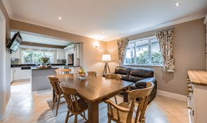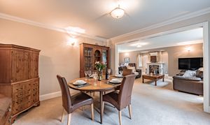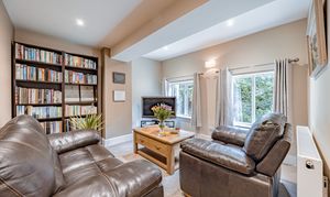 The expansive living/dining room can be reached via the kitchen or hallway. A log burner set within an inglenook creates a cosy focal point, while an archway leads through to the dining space. Dual aspect windows within the living room look onto the large rear private garden and south facing courtyard. Both rooms are light and airy with lots of natural light. The size of the room provides scope for a study area, piano or additional seating, making it a wonderfully versatile living space.