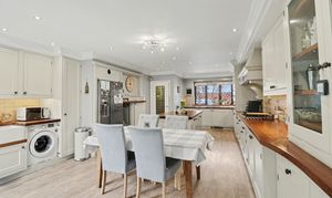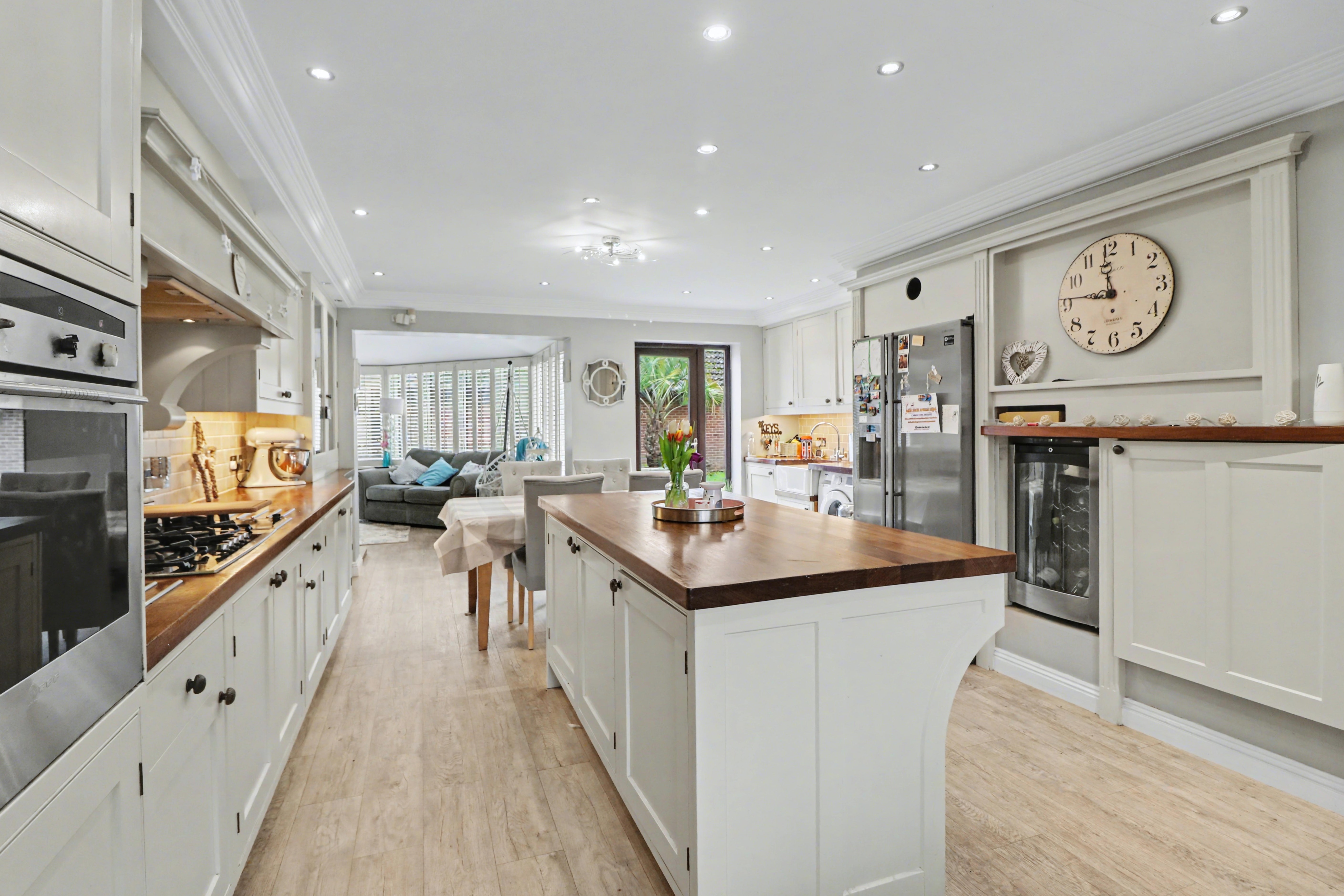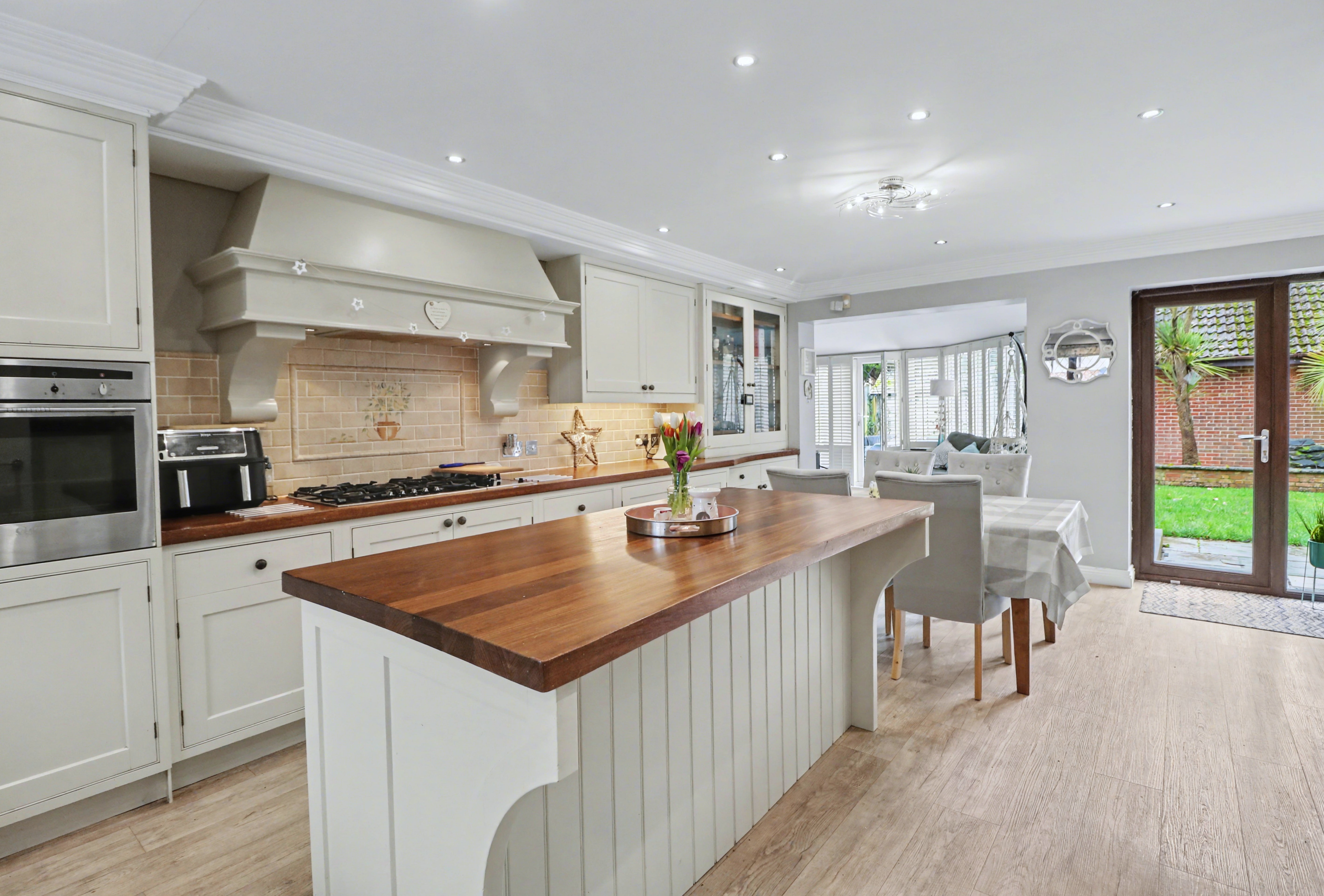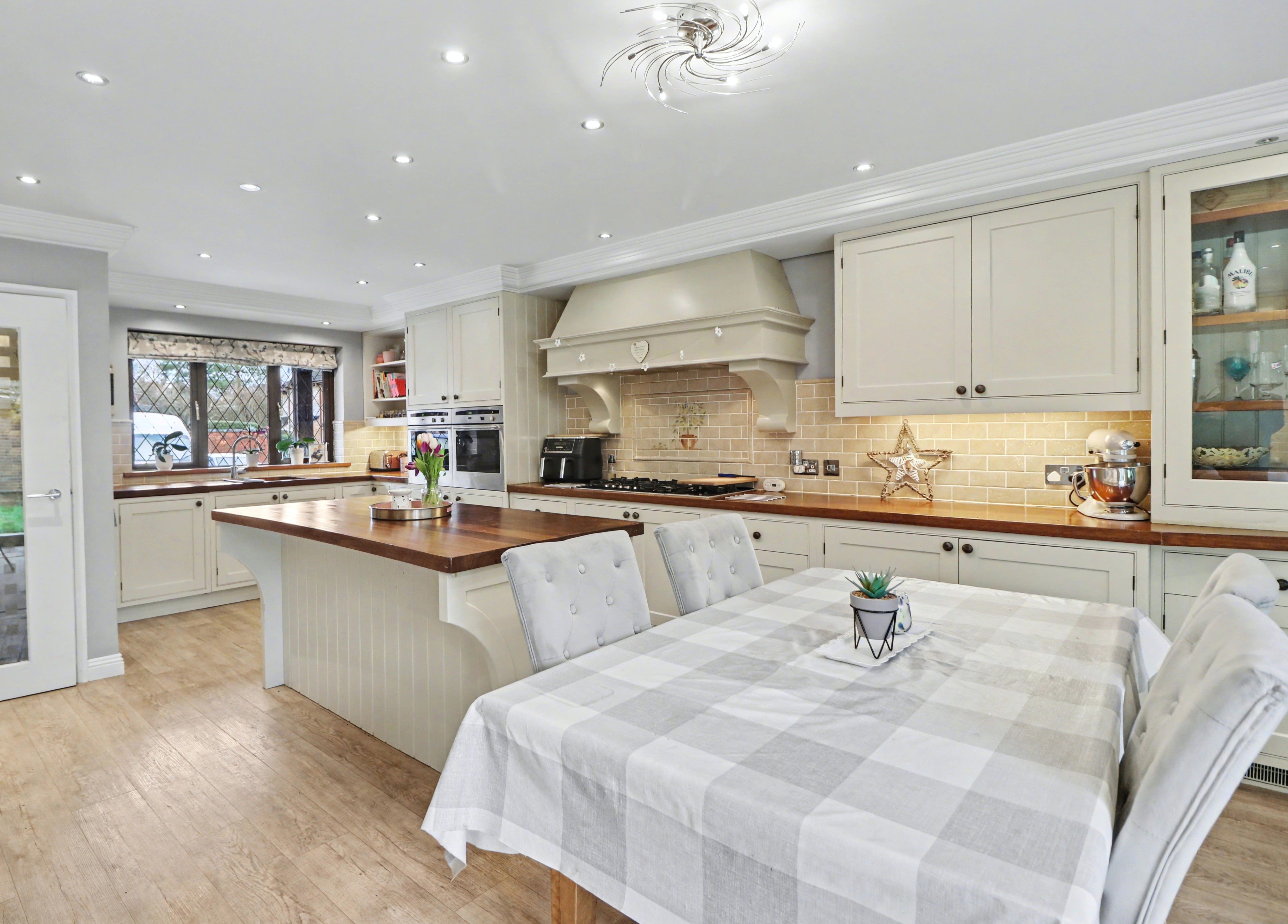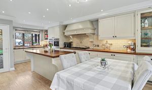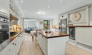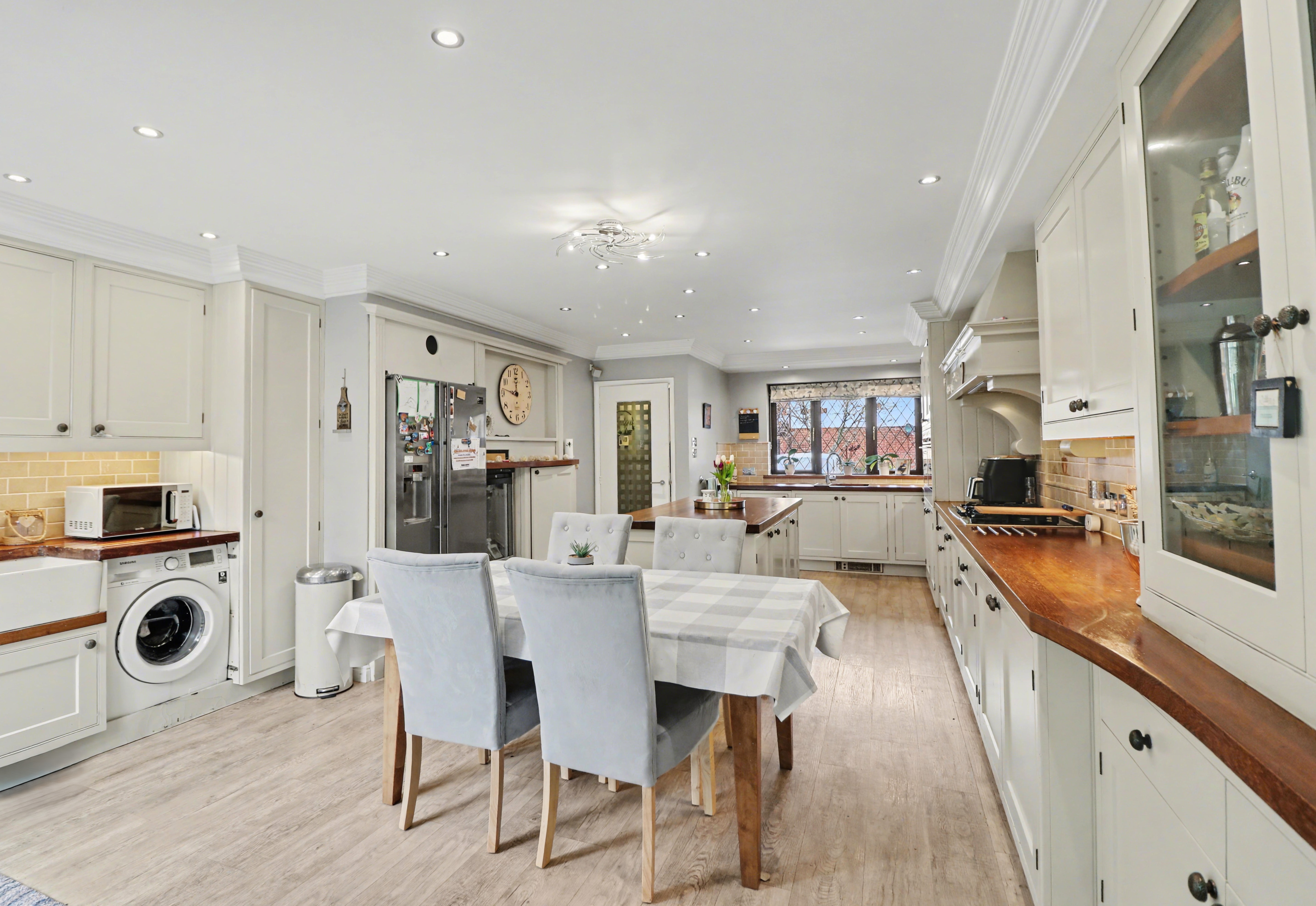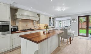 The beautiful, open plan kitchen/diner enjoys a dual aspect with a door leading out to the rear garden and has been fitted with a range of cottage style wall and base units, including a central island incorporating a breakfast bar. There are two built-in ovens, a five ring gas hob with extractor over, an integrated dishwasher and space for a wine cooler and American style fridge/freezer.