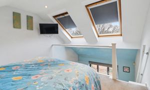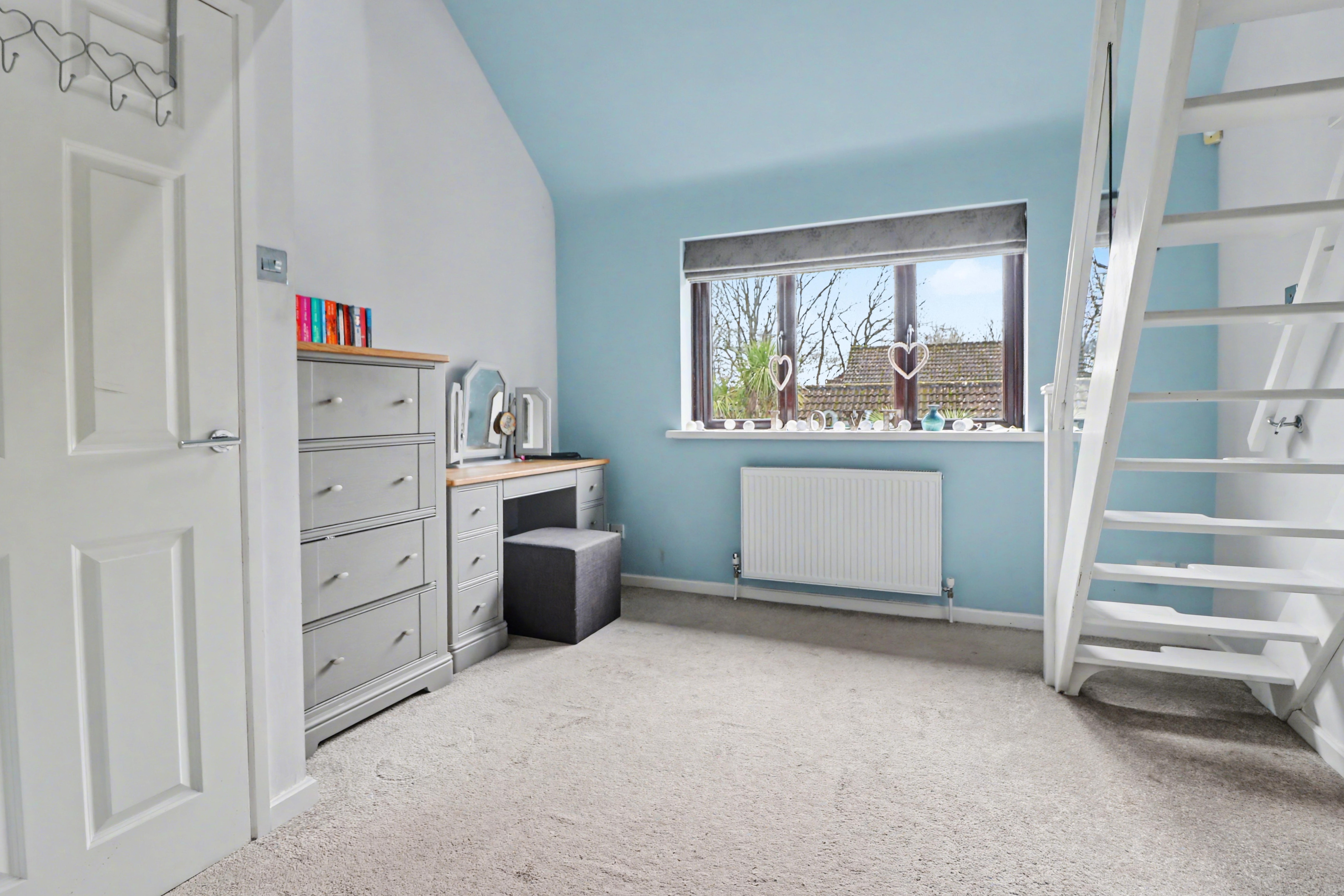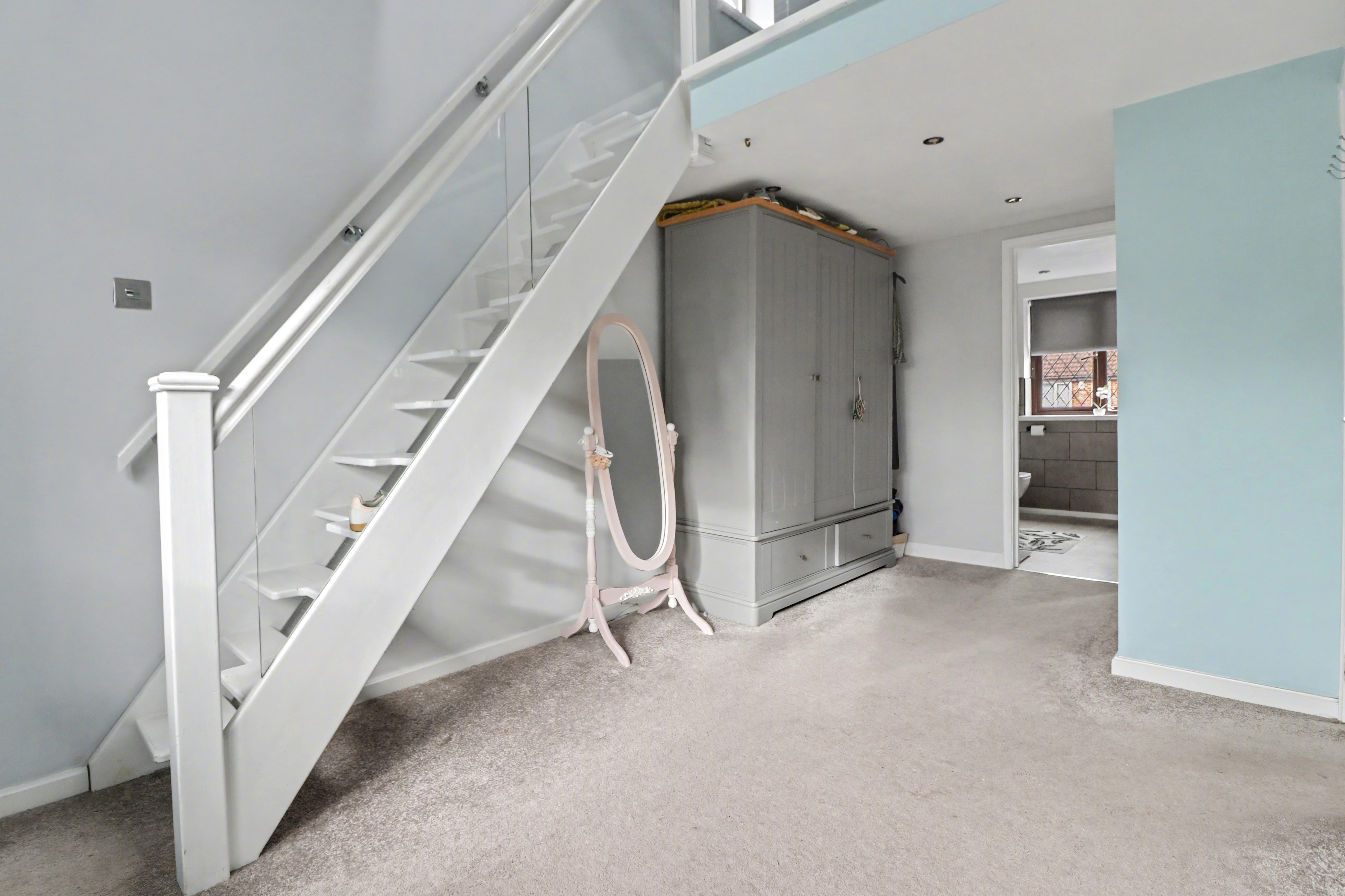 The impressive master bedroom overlooks the rear garden and has a mezzanine floor with a vaulted ceiling and skylight windows, as well as a stylish, en-suite shower room.