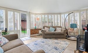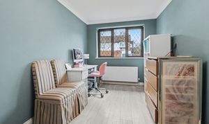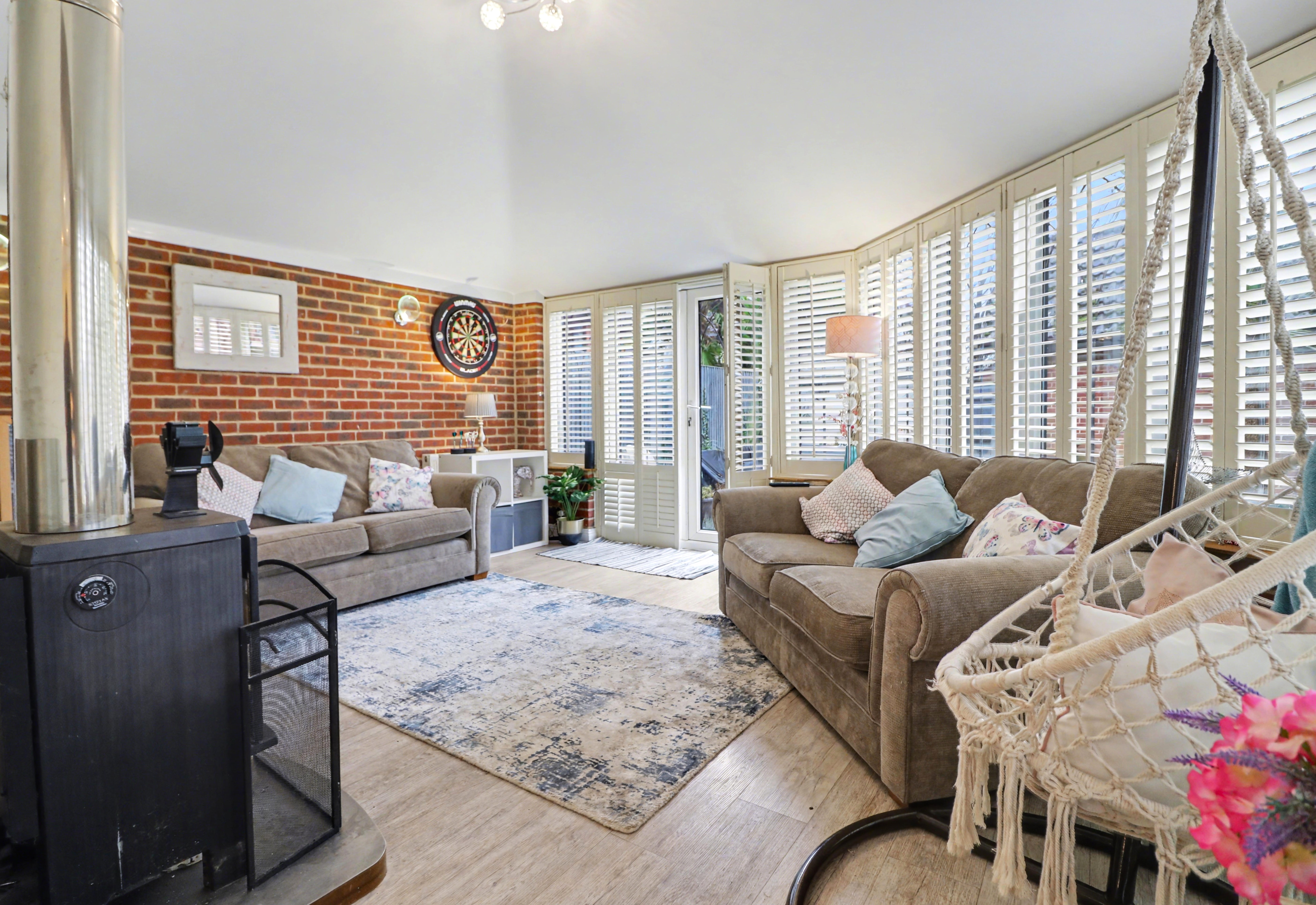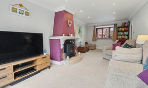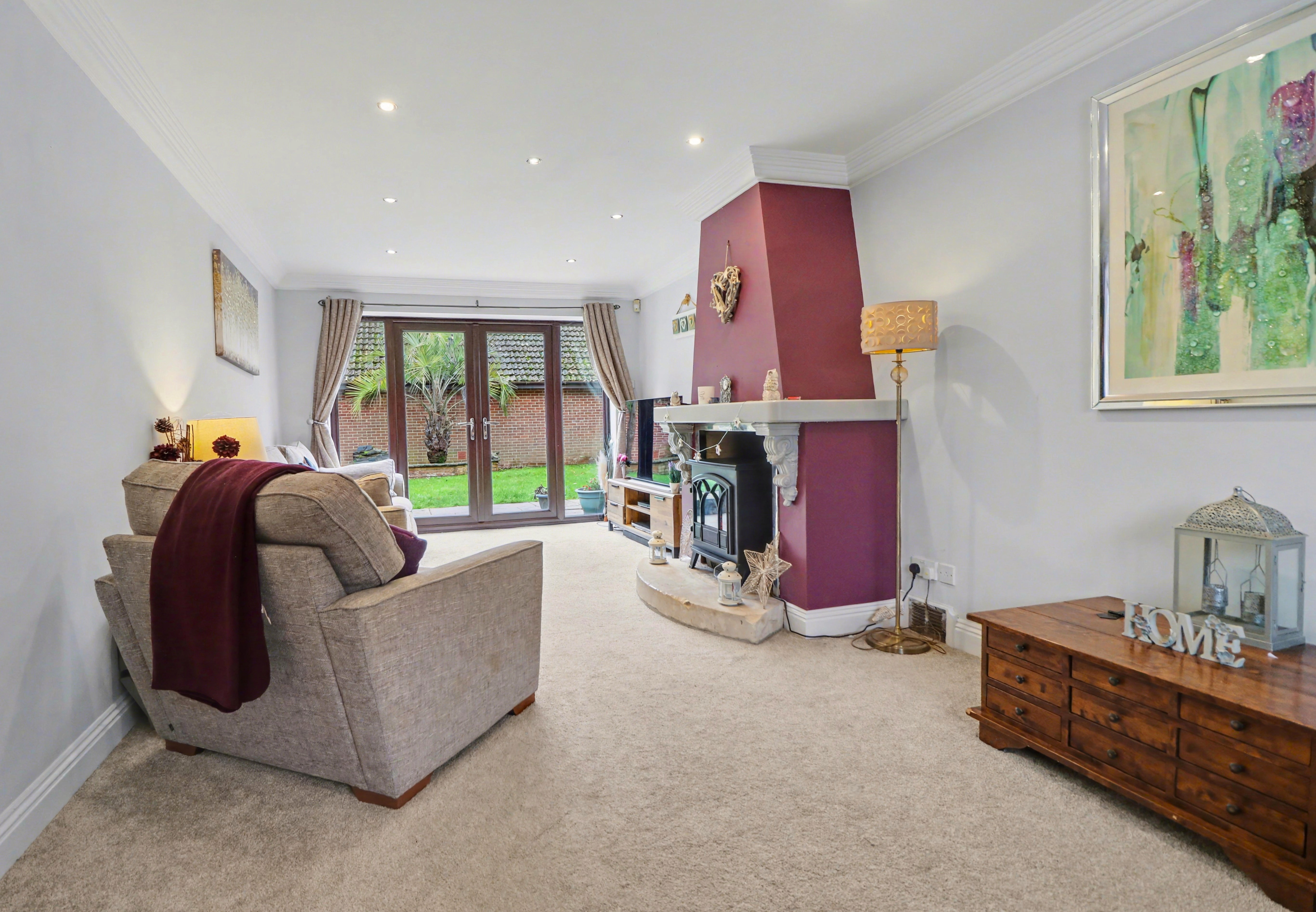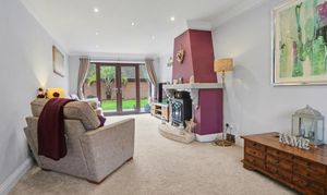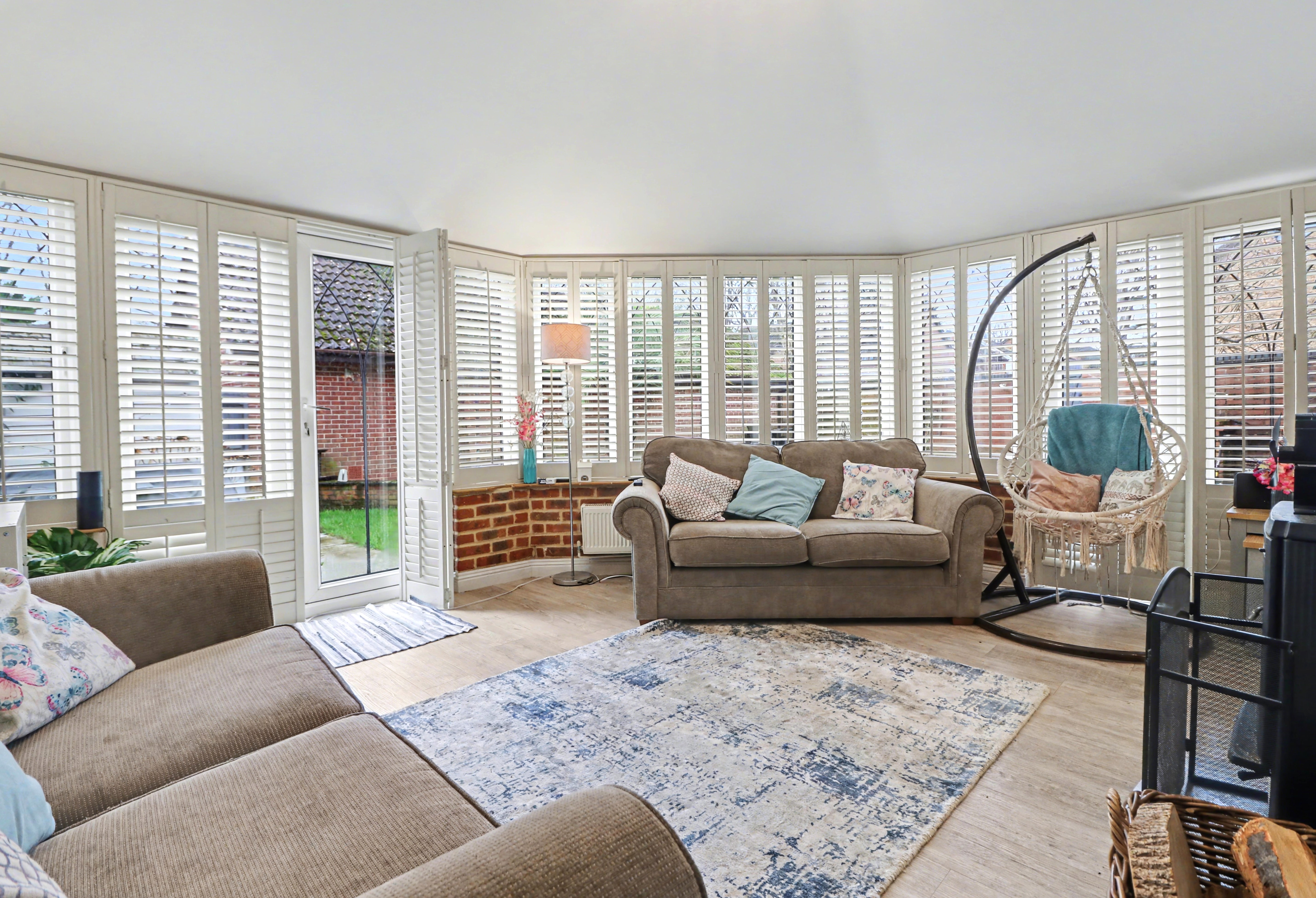 An opening flows through to the family room extension which features a vaulted ceiling, wood burning stove, colonial shutter blinds and two sets of French doors to the rear garden. This room also provides access to the good-sized office, which was previously the garage.
