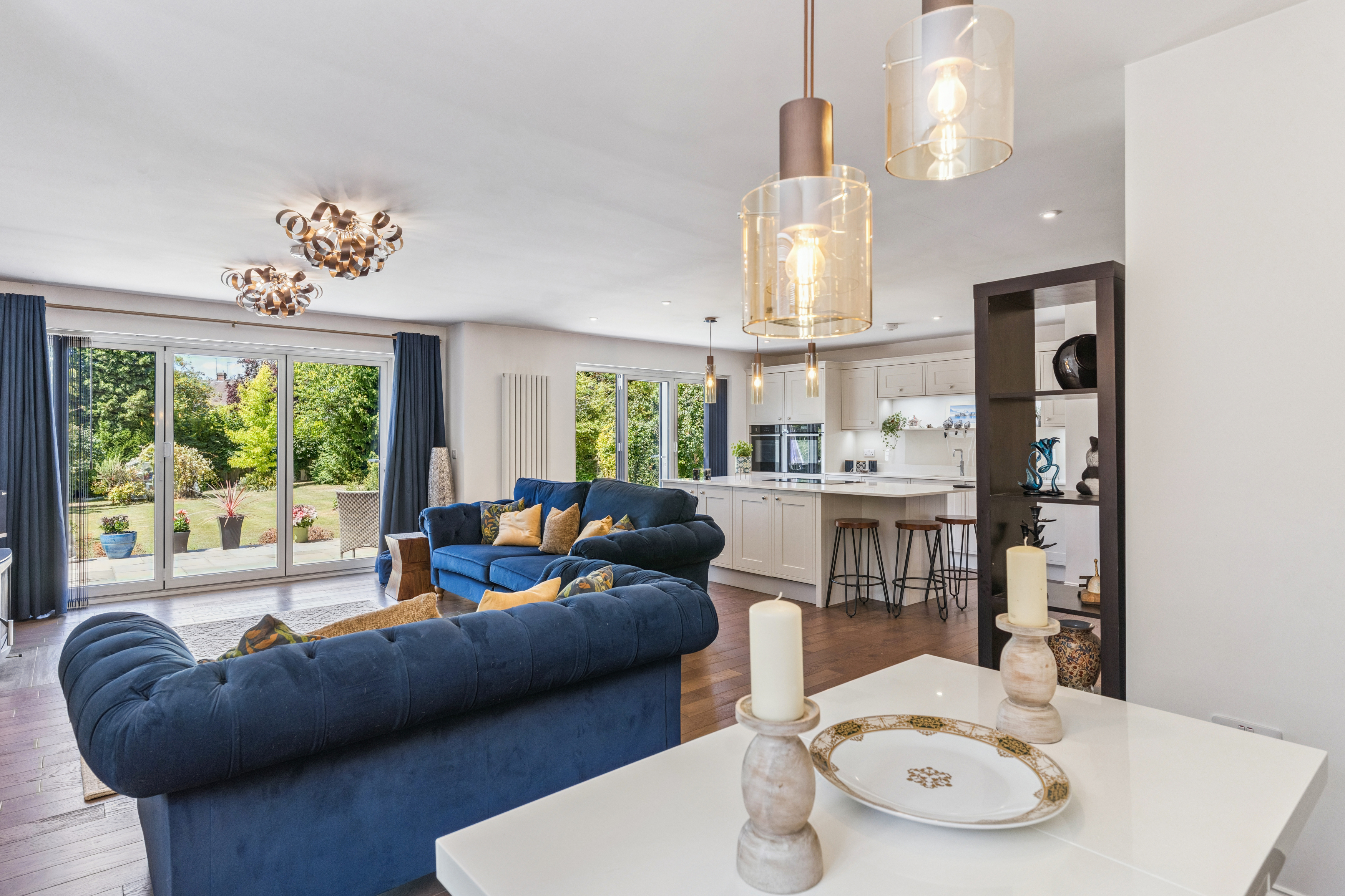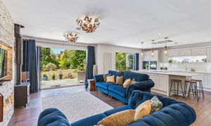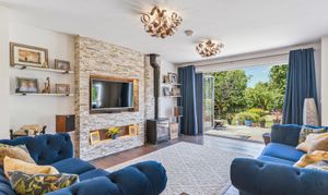 The open-plan living area brings together the lounge, dining space, and kitchen, creating a bright and inviting area for daily living and socialising. Large bi-fold doors open directly to the back garden, creating an effortless connection between indoors and outdoors, ideal for relaxing or hosting gatherings during the warmer months.