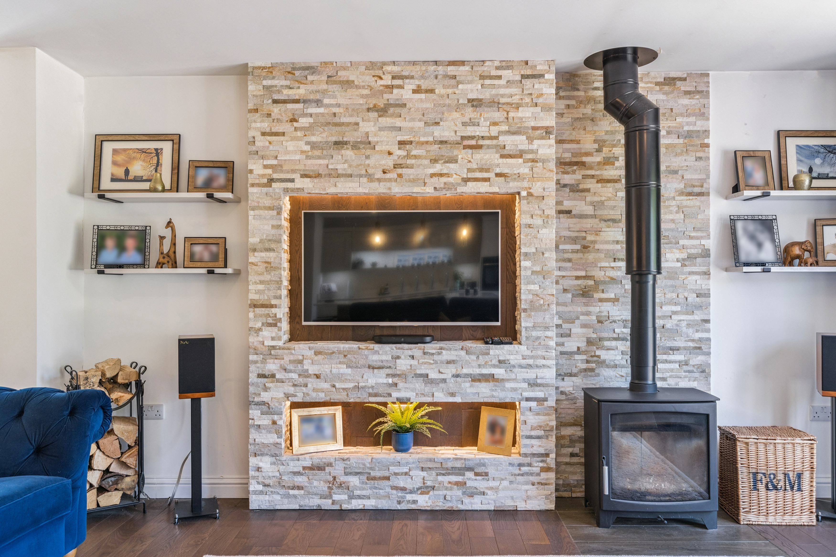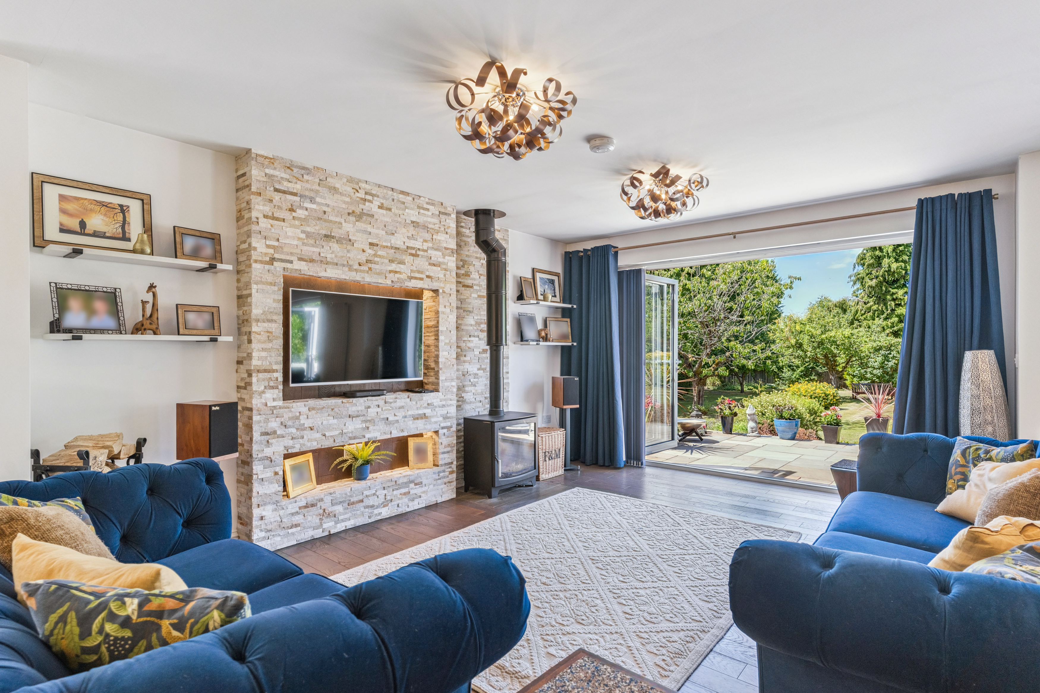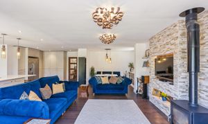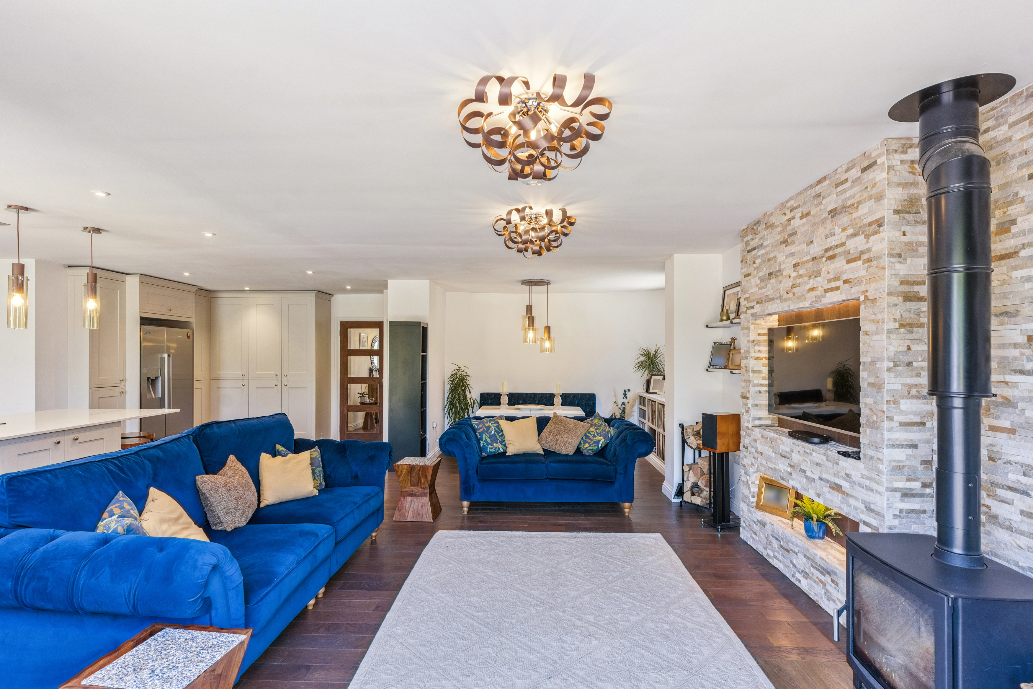 A working log burner in the living room adds a cosy touch, perfect for those colder evenings. It creates a warm, inviting atmosphere that complements the home’s modern style.