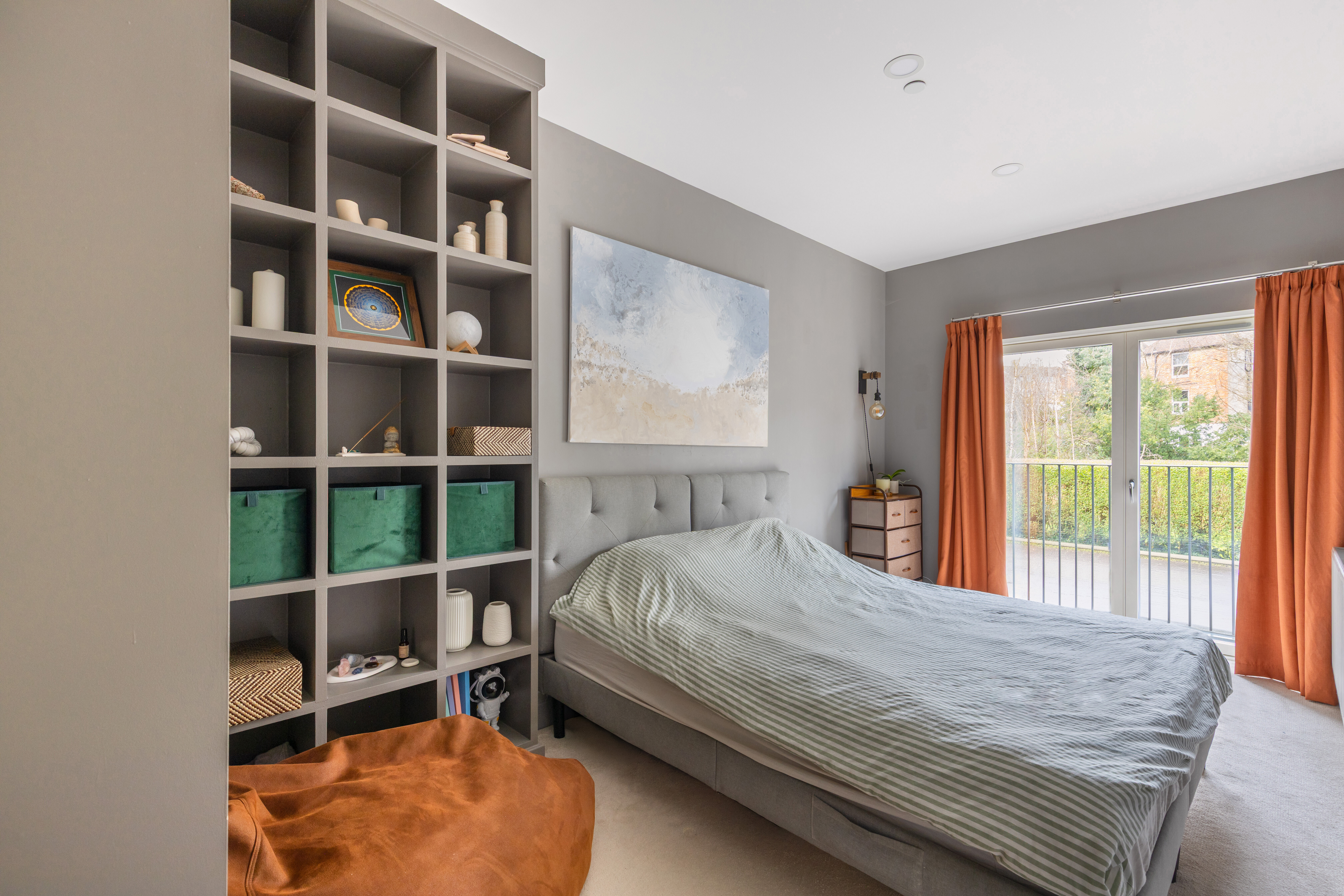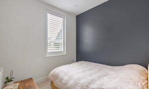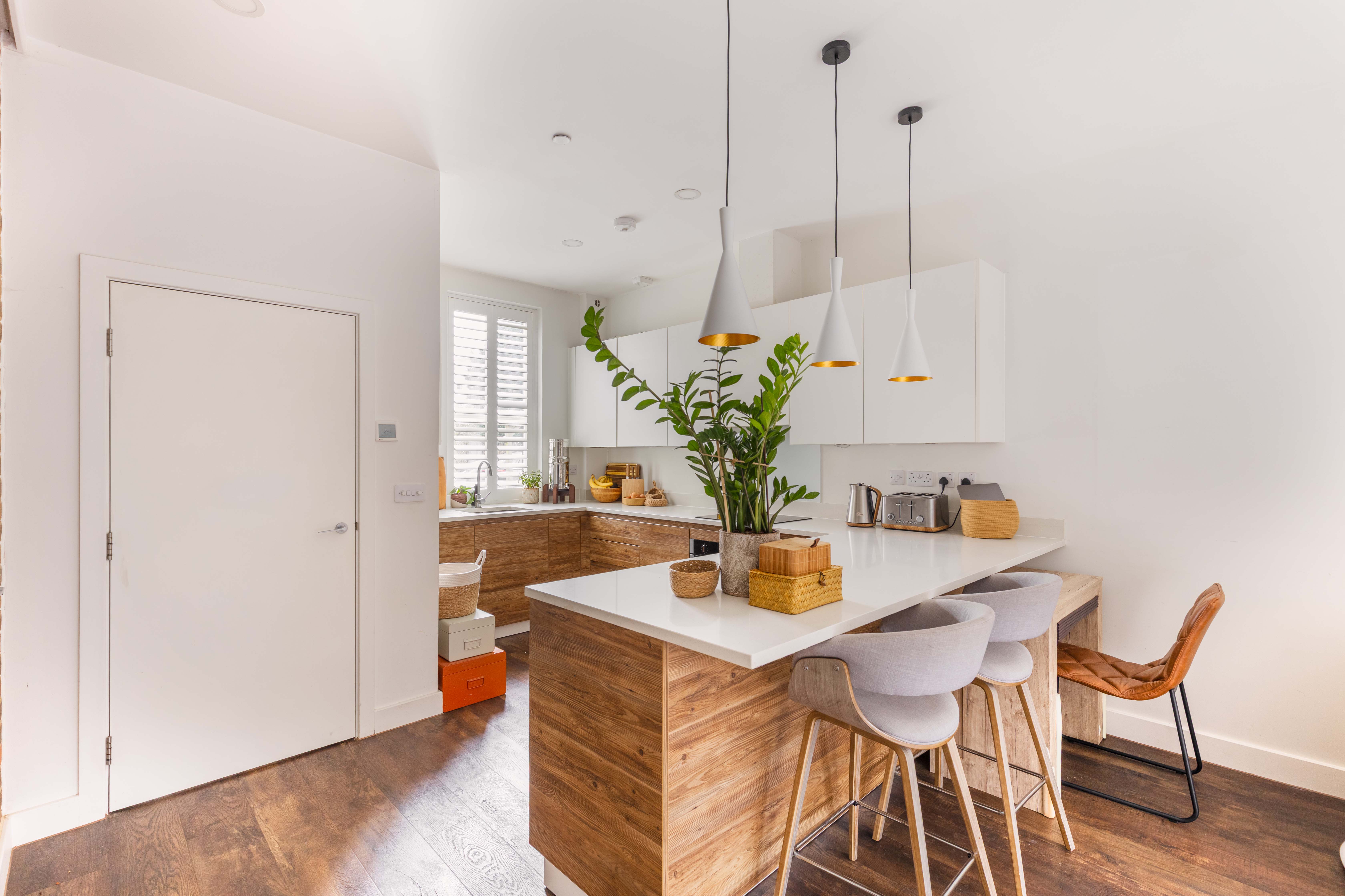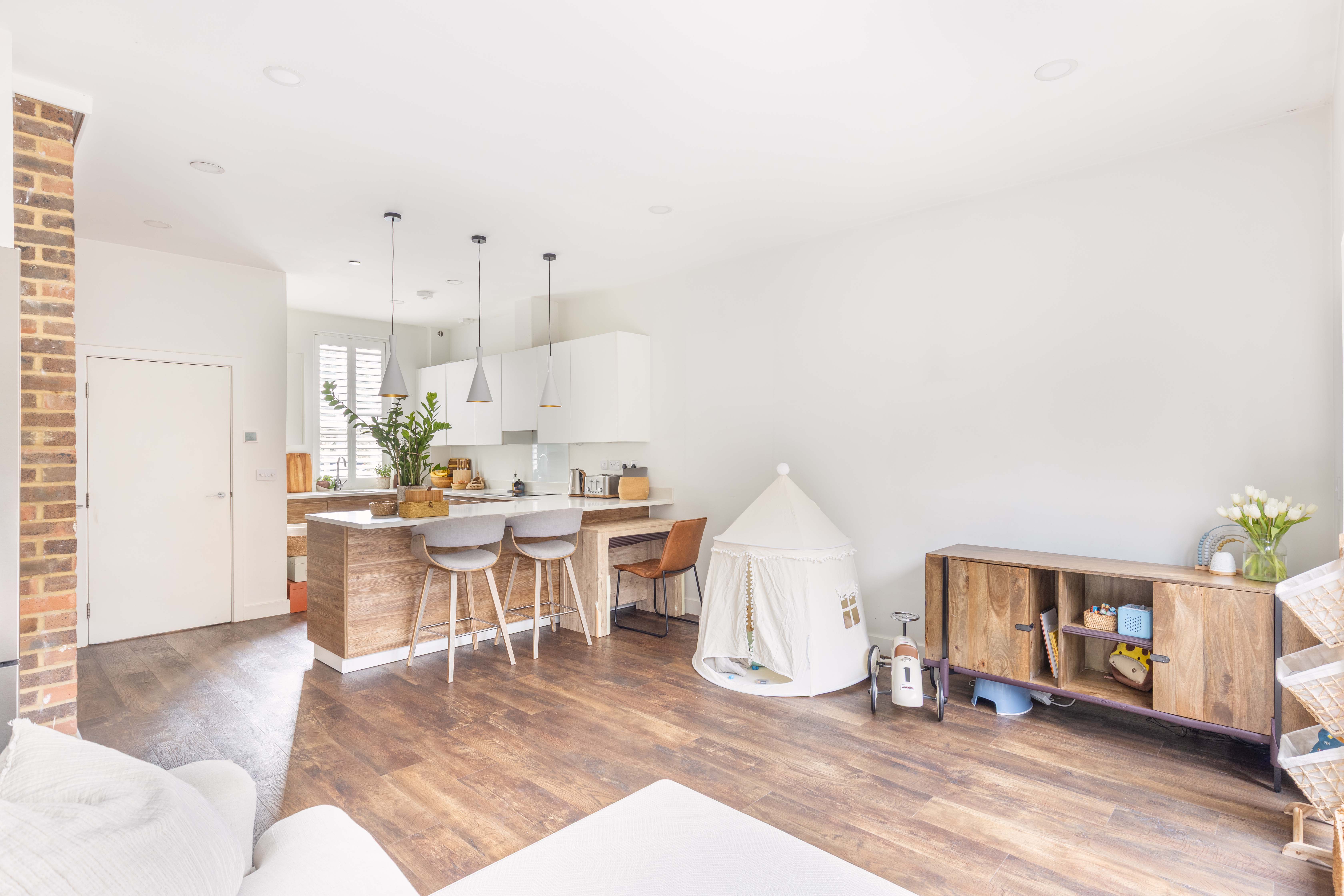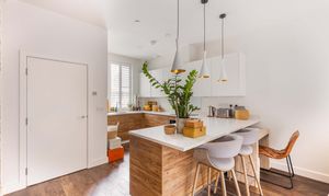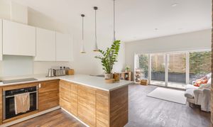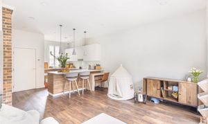 The ground floor, which enjoys underfloor heating throughout, features an expansive open-plan kitchen, dining, and living area. This versatile space is perfectly suited to both everyday living and entertaining. Large sliding glass doors open seamlessly onto the courtyard garden, extending the living area outdoors during warmer months. The kitchen itself is sleek and contemporary, fitted with handleless cabinetry and a range of high-end integrated appliances. A long breakfast bar subtly zones the kitchen from the rest of the room, providing a practical space for casual dining or socialising. A convenient downstairs cloakroom completes this level.
