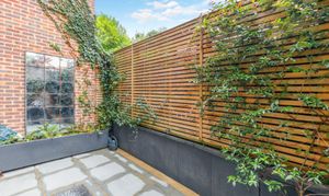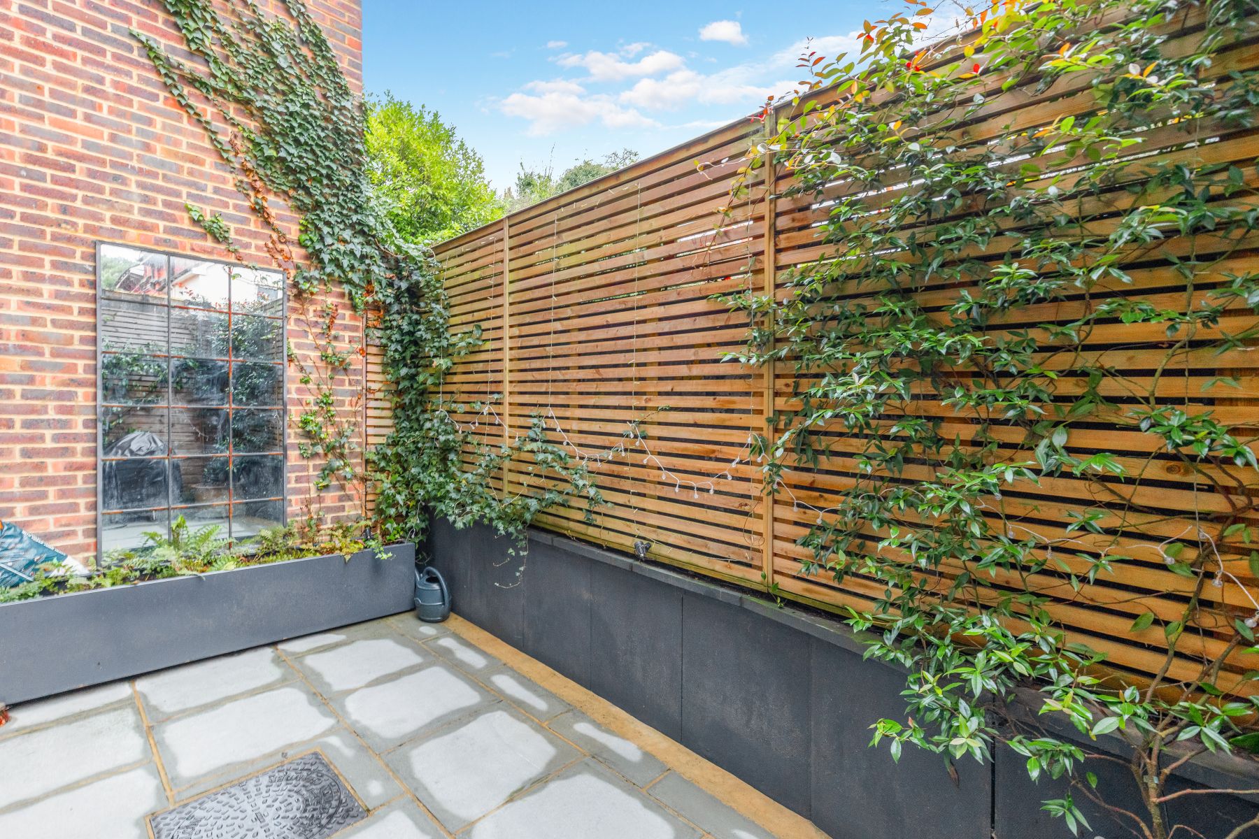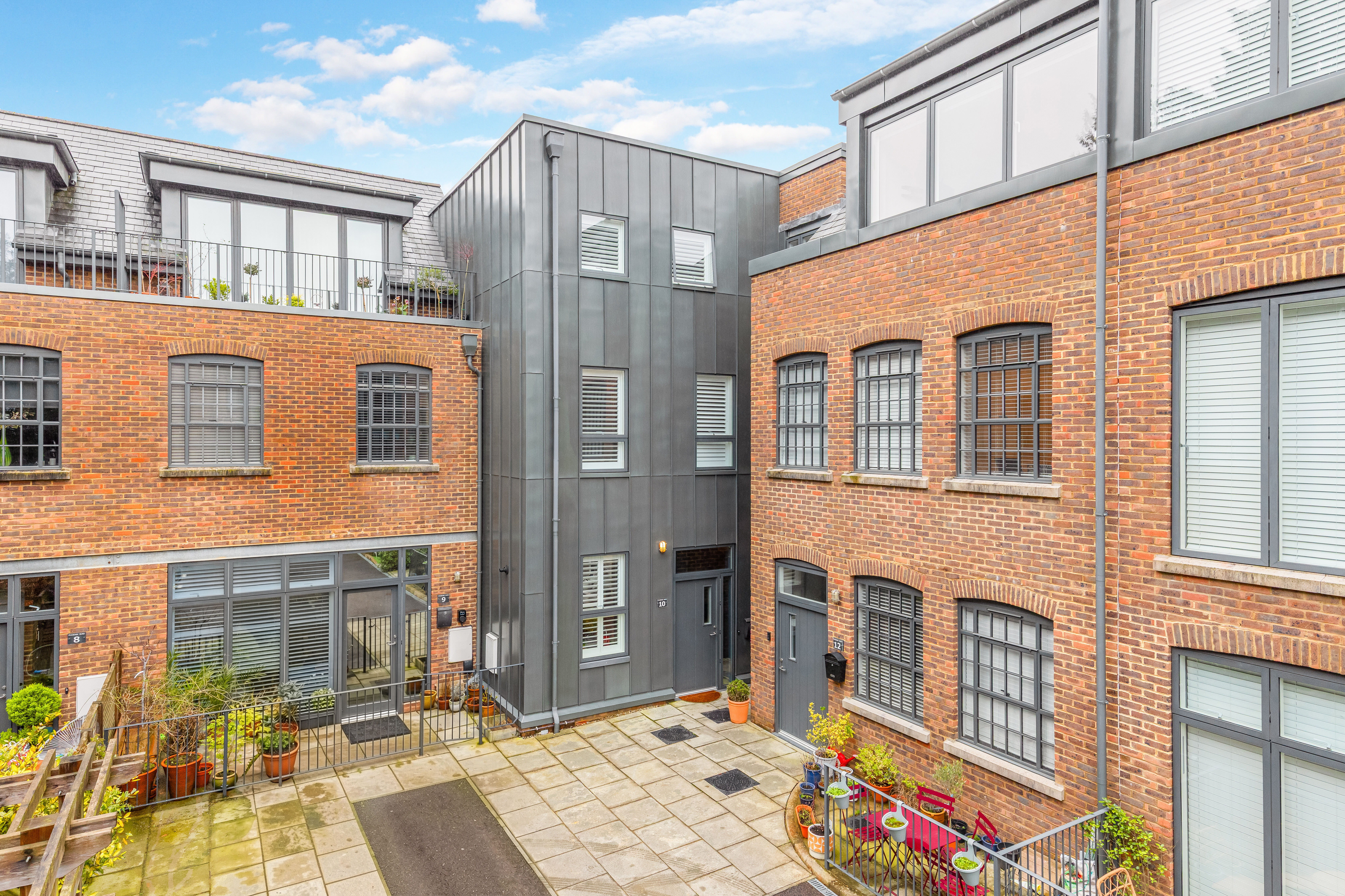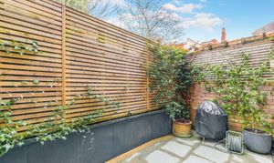Outside, the home benefits from a beautifully enclosed courtyard garden, framed by brick walls that echo the exposed brick detailing found inside the property. This private outdoor space is both low-maintenance and highly versatile, equally suited to relaxed seating or al fresco dining.