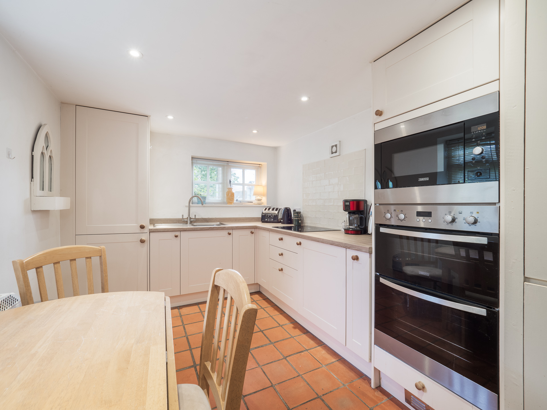 The well-equipped kitchen provides a functional space for culinary adventures, fitted with sink and drainer unit, integrated eye level oven, integrated Induction hob, fridge/freezer and microwave and a cupboard housing central heating boiler and washing machine. This room also has space for a table and chairs.