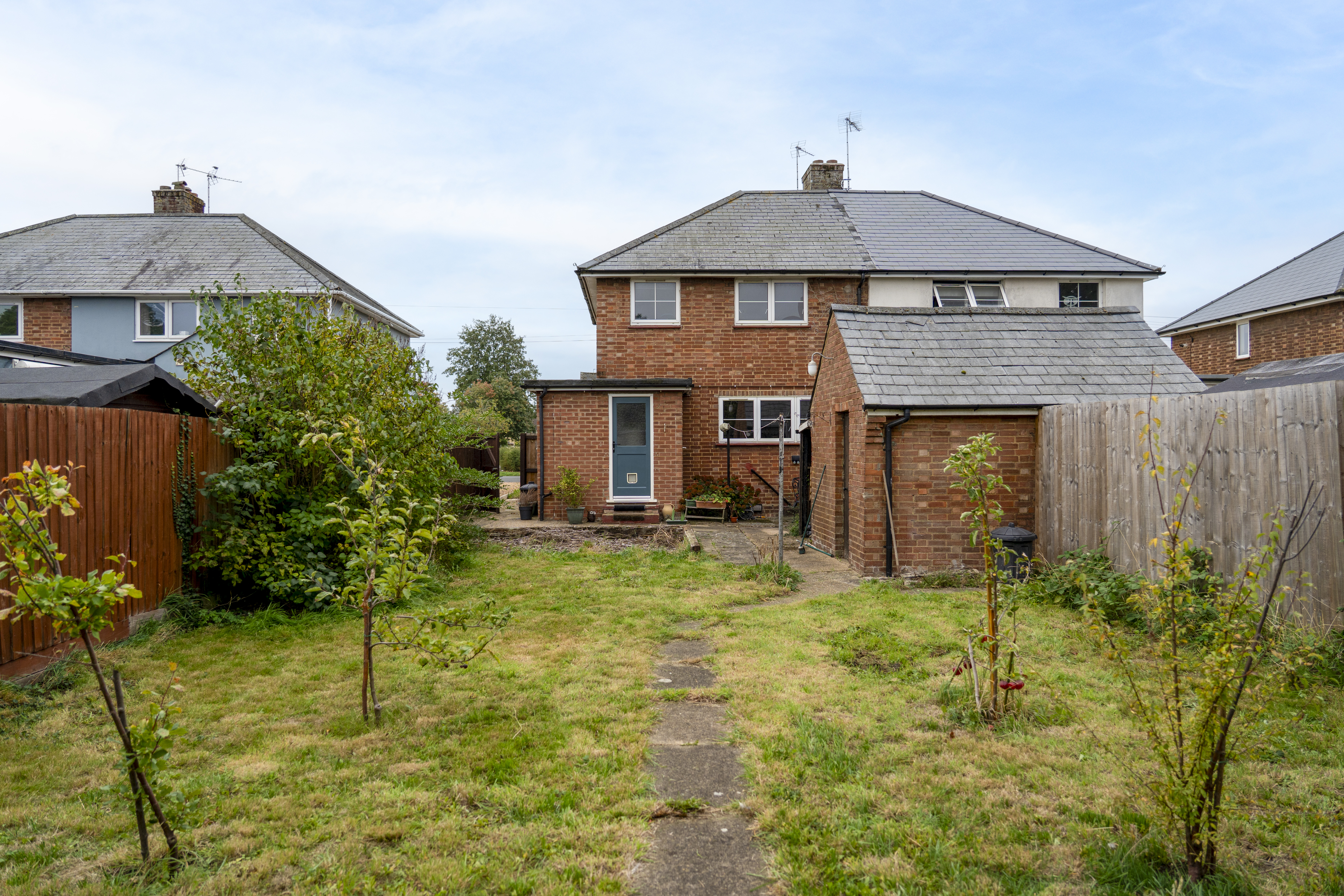 Outside, to the rear, you’ll find a generous garden, ideal for outdoor entertaining or potential expansion (subject to planning permission). The garden is accessible via both a rear door and side gate, and features multiple mature apple trees, a brick-built outbuilding, and a large shed for additional storage.