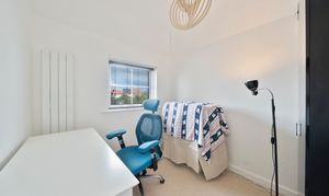 The ground floor features an inviting entryway leading into a bright and airy living room benefitting from understairs storage. To the rear, a spacious kitchen/dining room provides ample space for cooking and entertaining, with a range of wall and base units, integrated oven and space for washing machine, tumble-dryer and fridge-freezer. Additional ground floor amenities include a practical boot room and a convenient downstairs WC.
