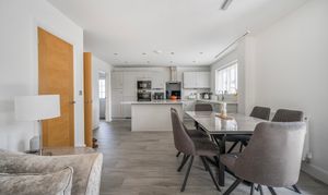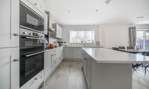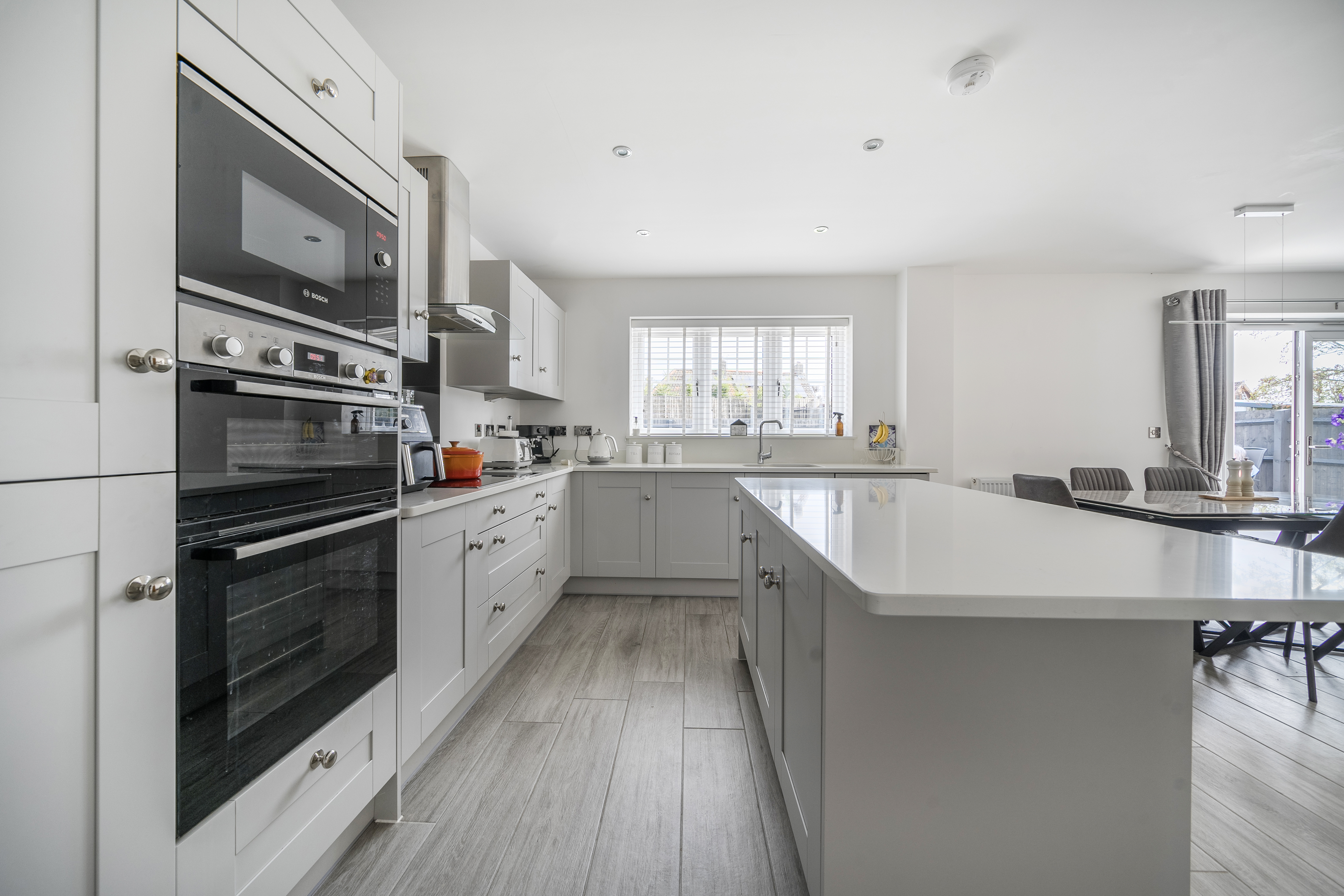 At the rear of the property is the impressive open-plan kitchen/dining/living space which is fully fitted with a range of soft-close wall, drawer and base units in dove grey, topped with quartz worktops. A central island provides breakfast seating, and BOSCH integrated appliances include a microwave, twin eye-level ovens, fridge/freezer and a dishwasher.