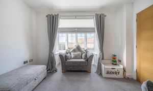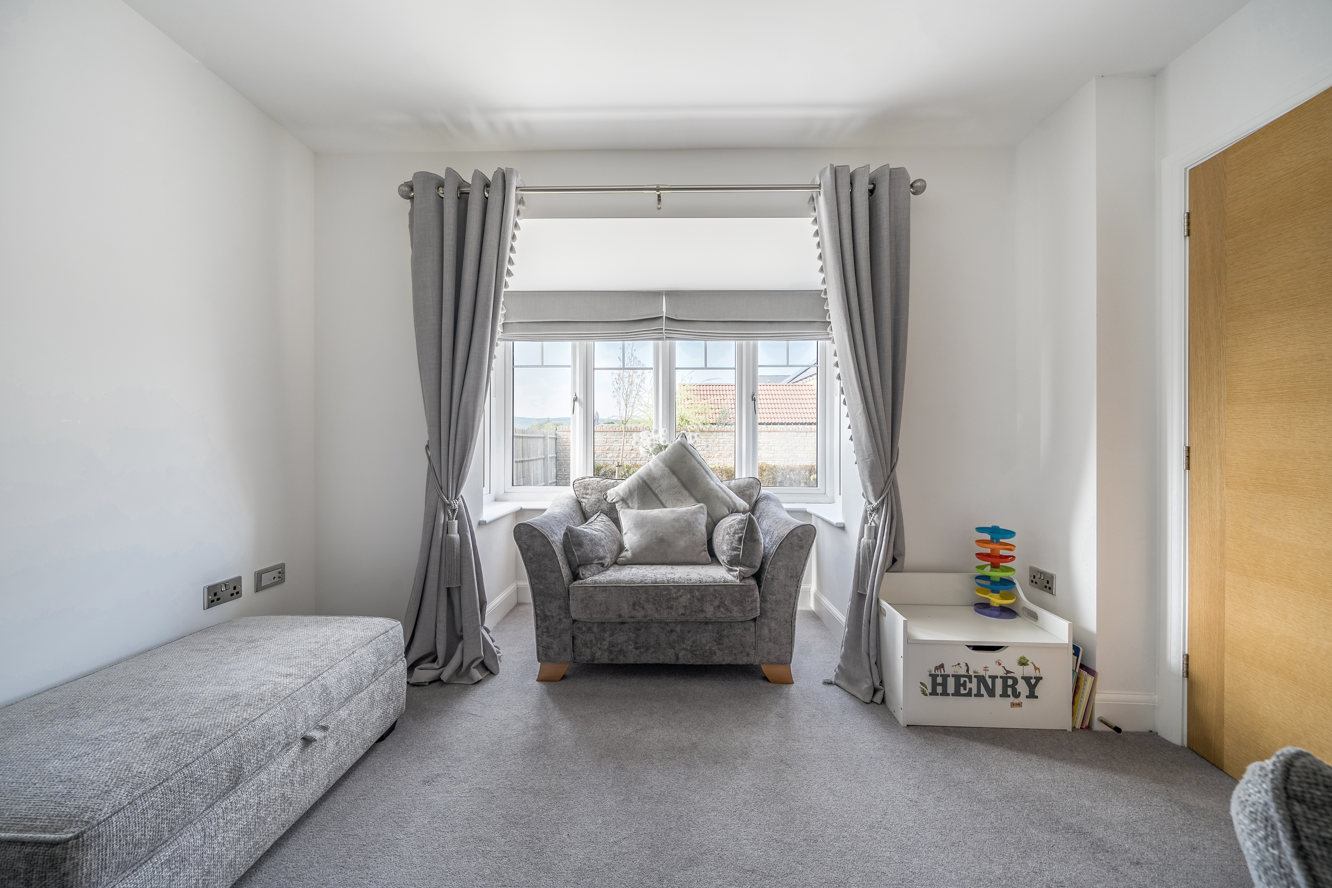 To the left is a versatile reception room; overlooking the front garden it would make an ideal study, home office or playroom. To the right, the formal sitting room is bright and airy, featuring a large bay window with exceptional views towards the Mendip Hills, and a contemporary electric living flame fire as its focal point.
