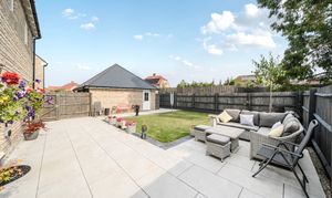 The rear garden has been beautifully landscaped, starting with a large porcelain-tiled patio ideal for outdoor dining and relaxation. The remainder is laid to lawn with raised sleeper borders, and behind the garage is a discreet alcove suitable for a garden shed or further storage.