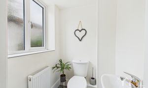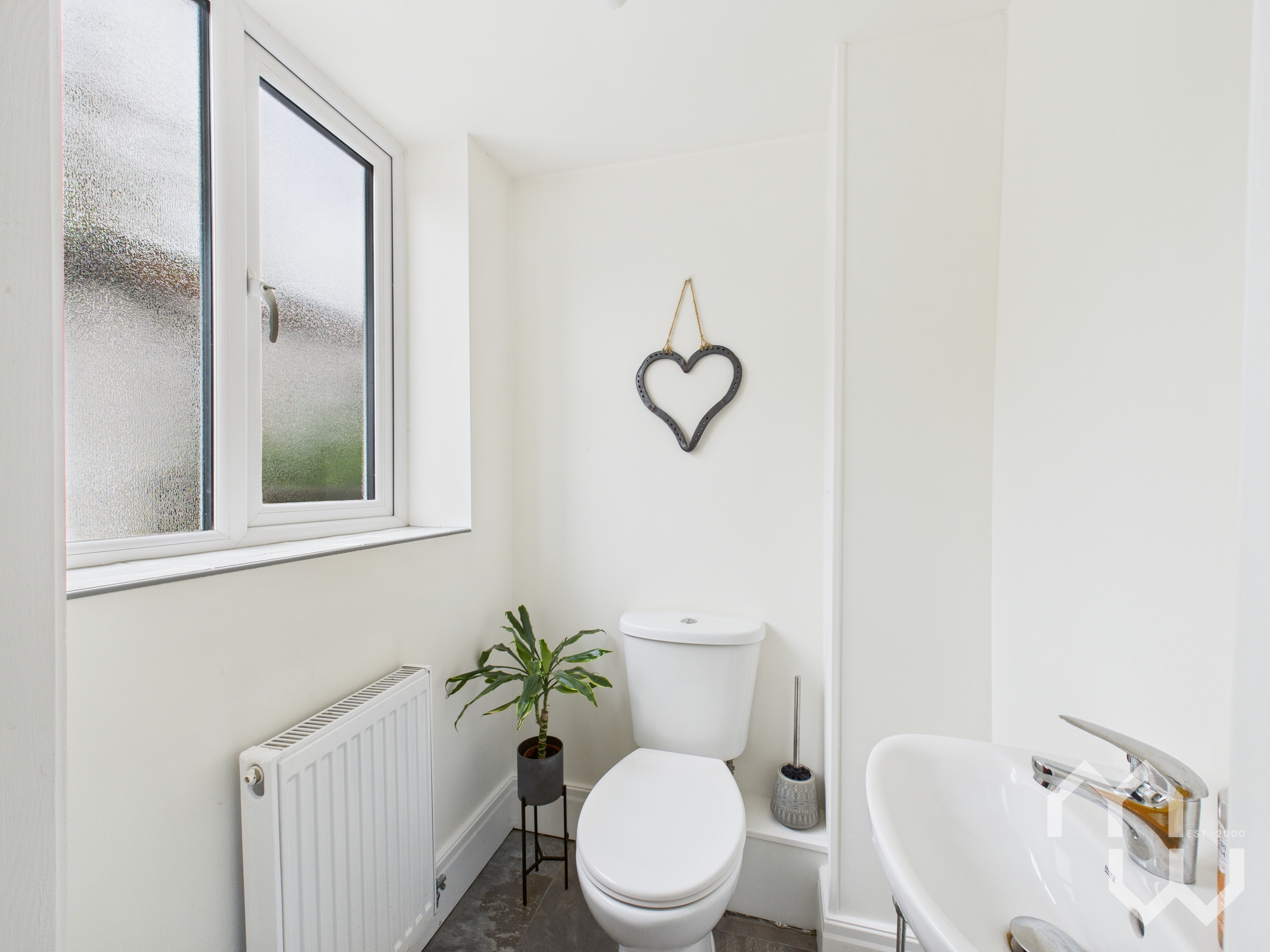 Low-level wc, pedestal wash hand basin, tiled floor. Window to rear.