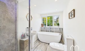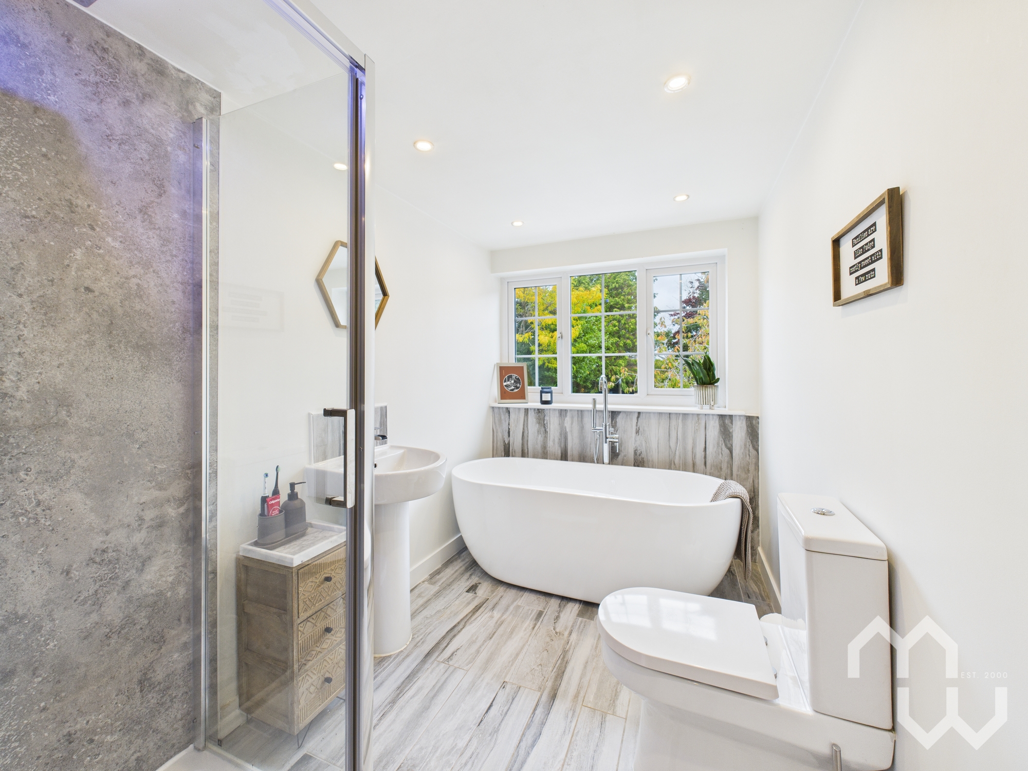 Four-piece suite comprising a free-standing bath, shower cubicle, pedestal wash hand basin, low-level wc. Tiled floor and part tiled walls. Window to the rear.