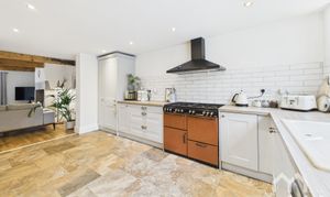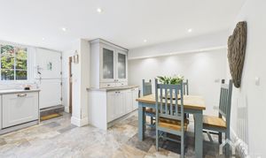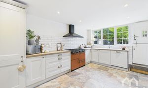 Excellent range of eye and low-level units, single porcelain sink. Integrated appliances include: dishwasher, fridge/freezer, washing machine, extractor fan, Range oven, and gas hob. Dining area. Tiled floor. Window and door to rear.