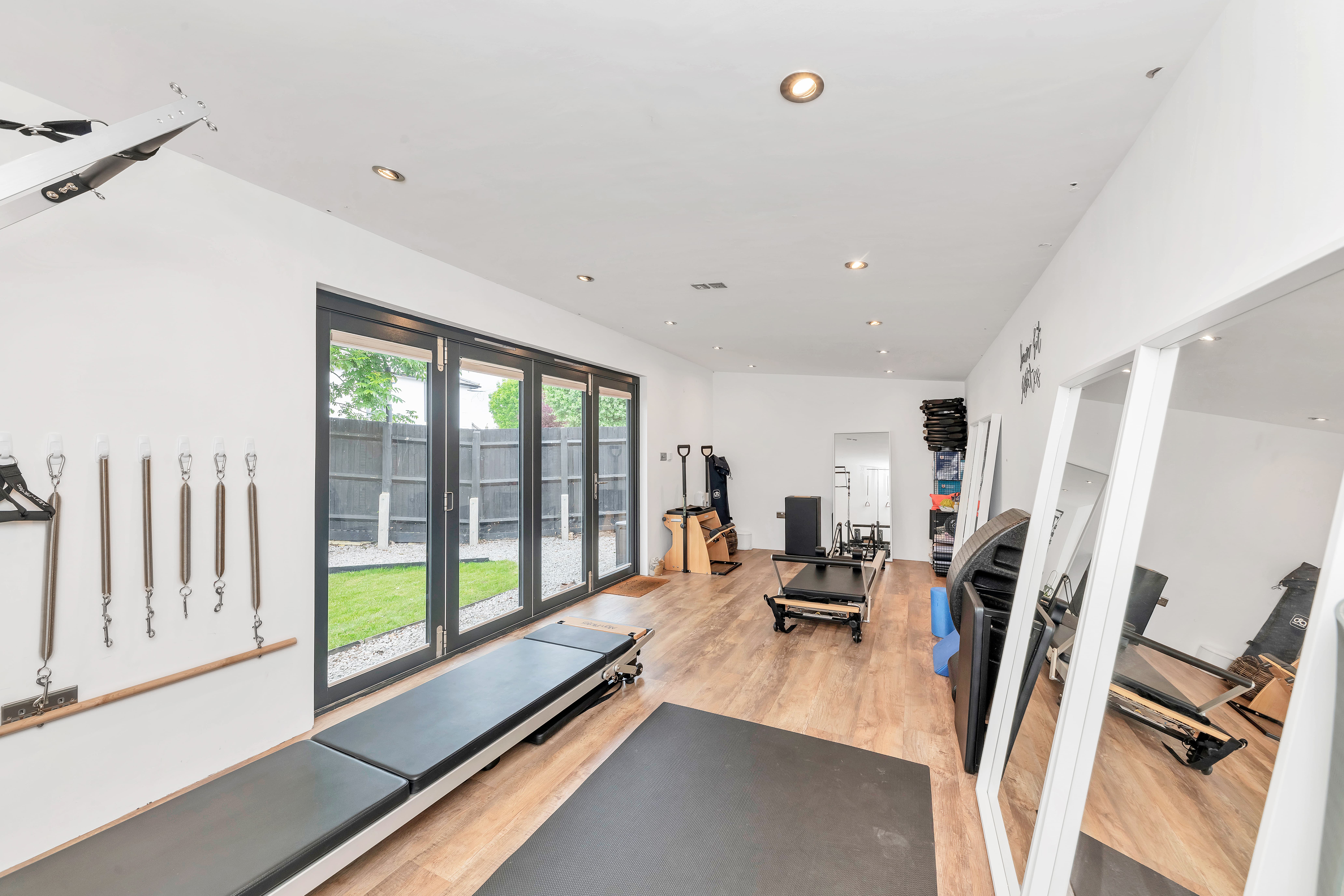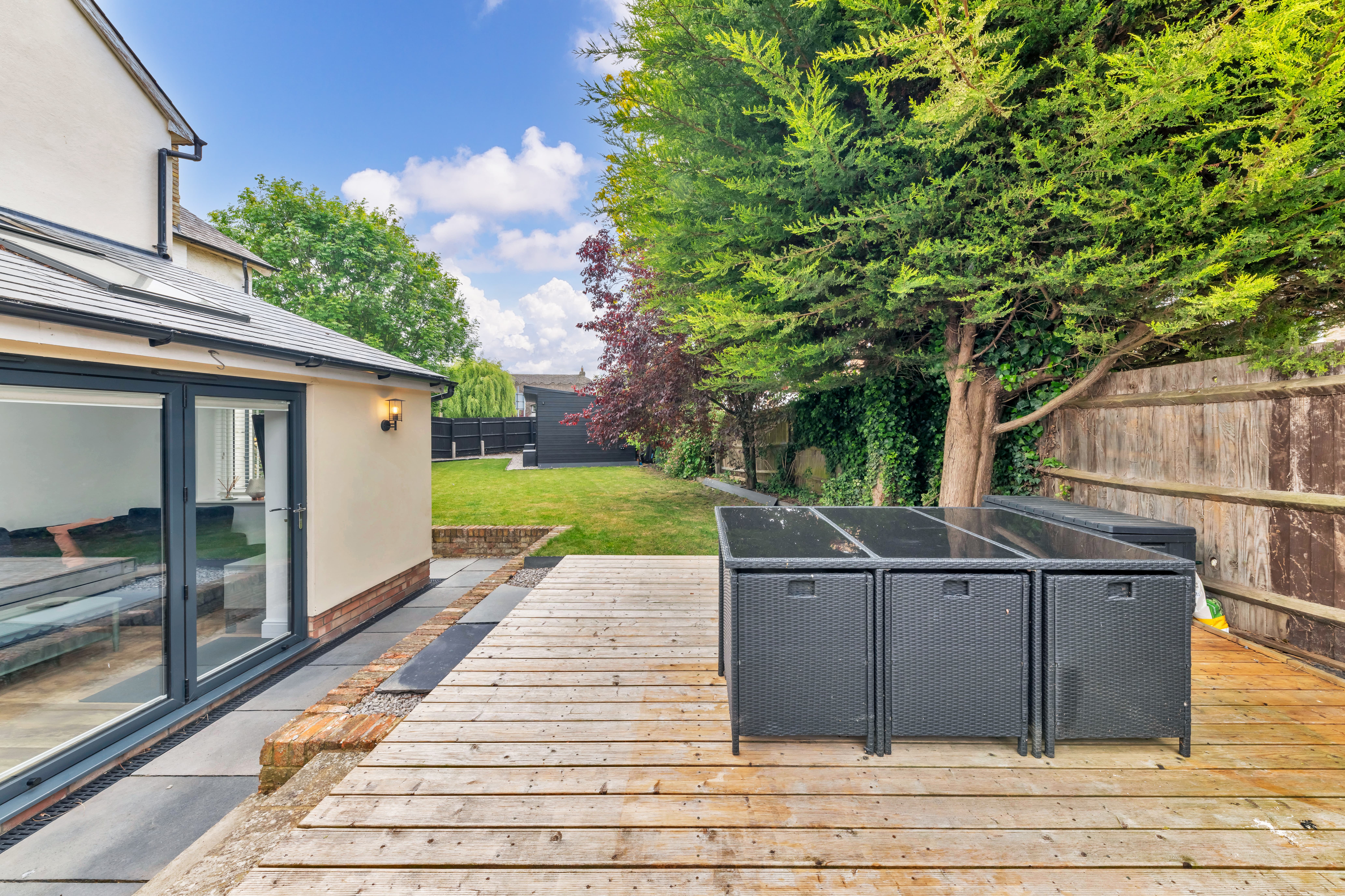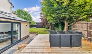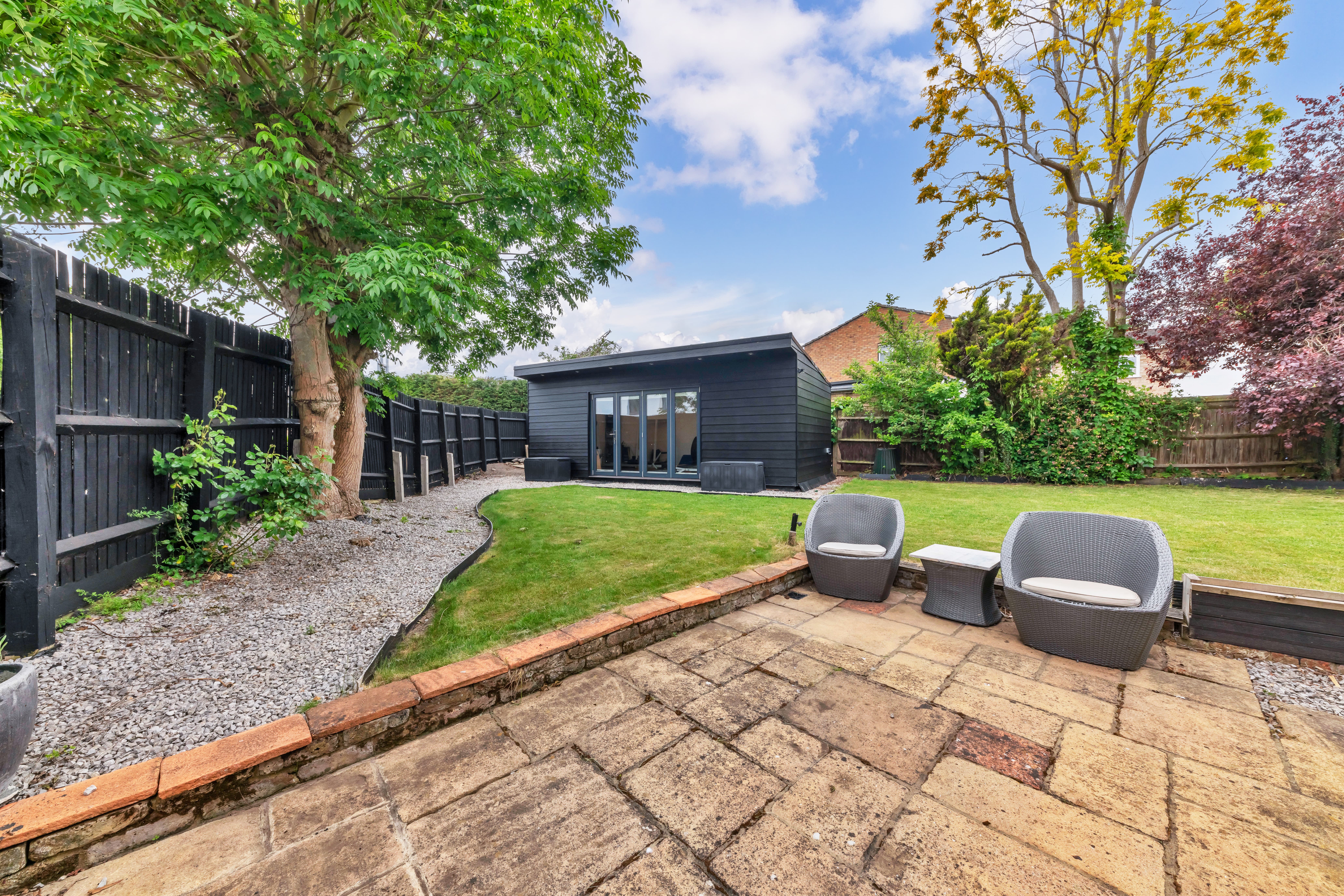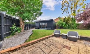 Outside, to the rear, the landscaped garden is a wonderful size, fully enclosed by fencing and offering a lovely private spot to sit and relax after a busy day. It is laid mainly to lawn, with paved patio and decking areas providing lots of space for garden furniture, enjoying meals and entertaining guests. There are well-maintained borders, with shrubs, mature trees and decorative stones, and access to a fantastic garden studio, with bi-fold doors into the garden, wood flooring, inset lighting and vast amounts of space for furniture/gym equipment.