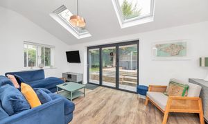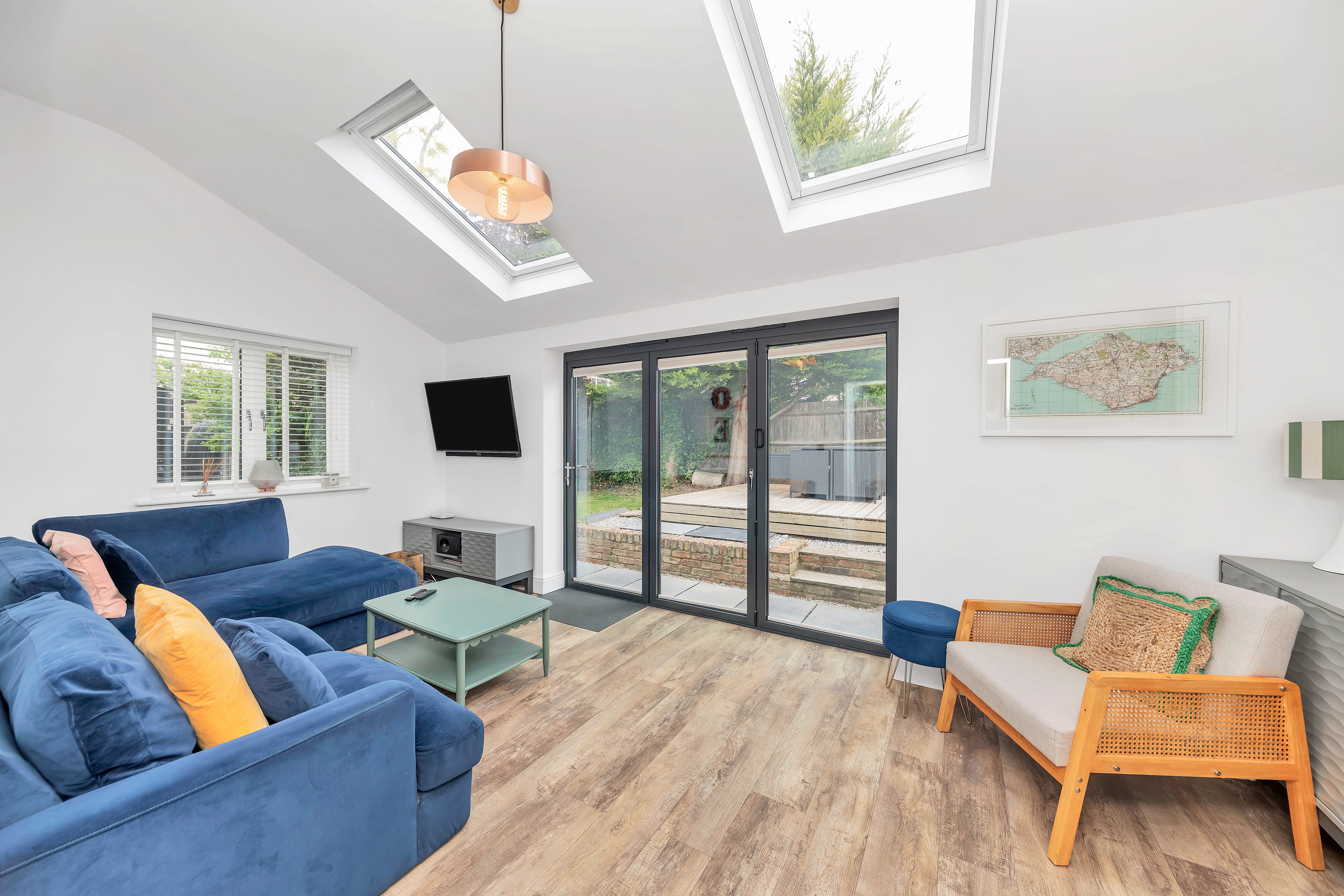 Adjacent, the dining room is a very good size, boasting a window to a front aspect, lovely wood flooring, pendant lighting, stylish decor, and space for a large dining setting and storage furniture. Across the hallway, the lounge is bright and comfortable, enjoying a window to a front aspect, double French doors to a garden aspect, a feature fireplace, carpets, pendant lighting, and ample space for a variety of lounge and storage furniture. The garden room offers further excellent reception space, with Velux windows, bi-fold doors to the rear, lovely views of the garden, and lots of space for furniture. A door leads through to further storage space, as well as access to the garage and to the large study, which could be used as a 4th bedroom if desired.
