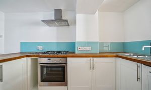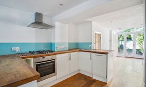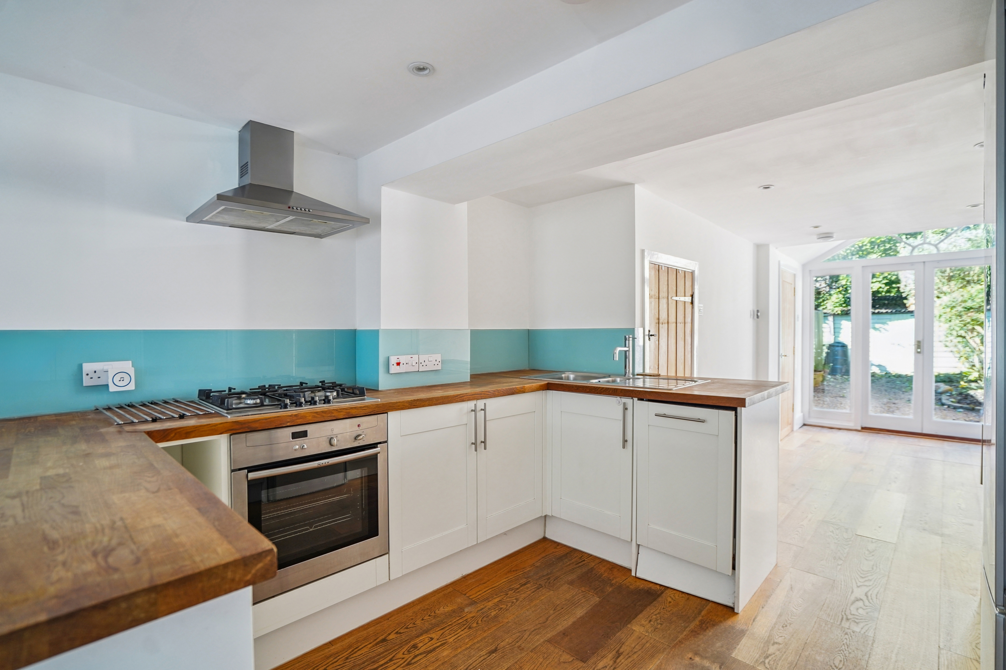 The living room leads through to a compact, fully fitted kitchen with a range of base and wall units, wooden worktops, and integrated appliances including an electric oven and a four-ring gas hob. There is space for a dishwasher and a fridge-freezer. Adjacent to the kitchen is a bright dining area with space for a table and chairs, and French doors opening onto the rear garden.