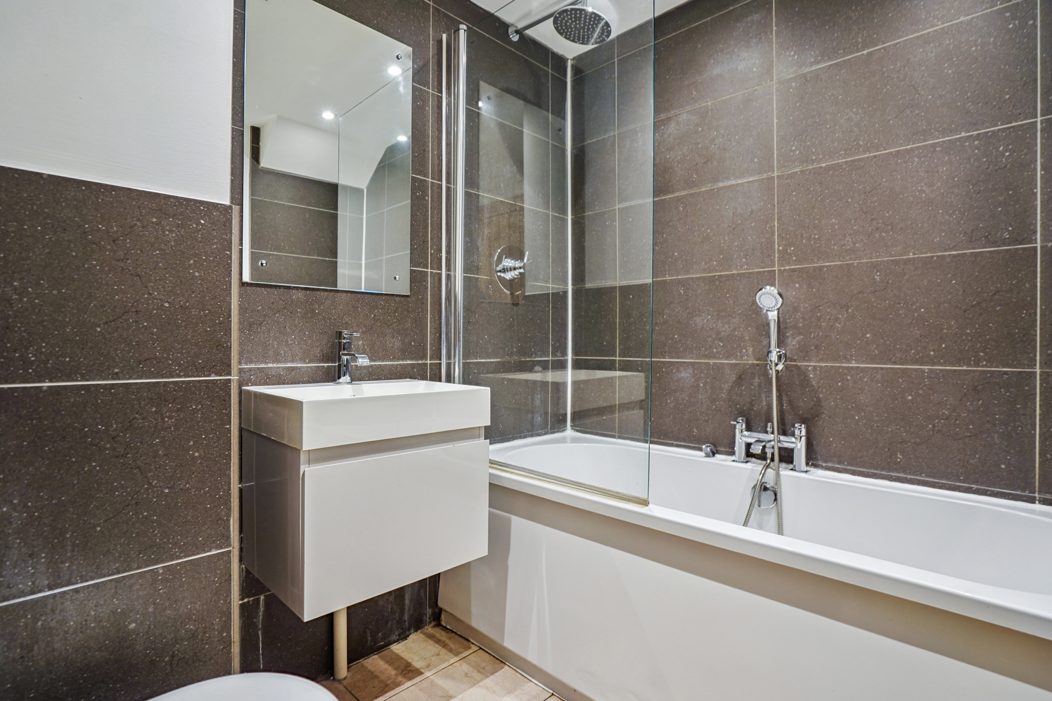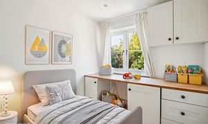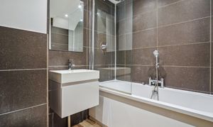 On the first floor, there are two well-proportioned bedrooms, one of which includes built-in storage. The family bathroom is modern and stylish, comprising a panelled bath with a monsoon showerhead, WC, a floating vanity unit with storage below, and a heated towel rail.