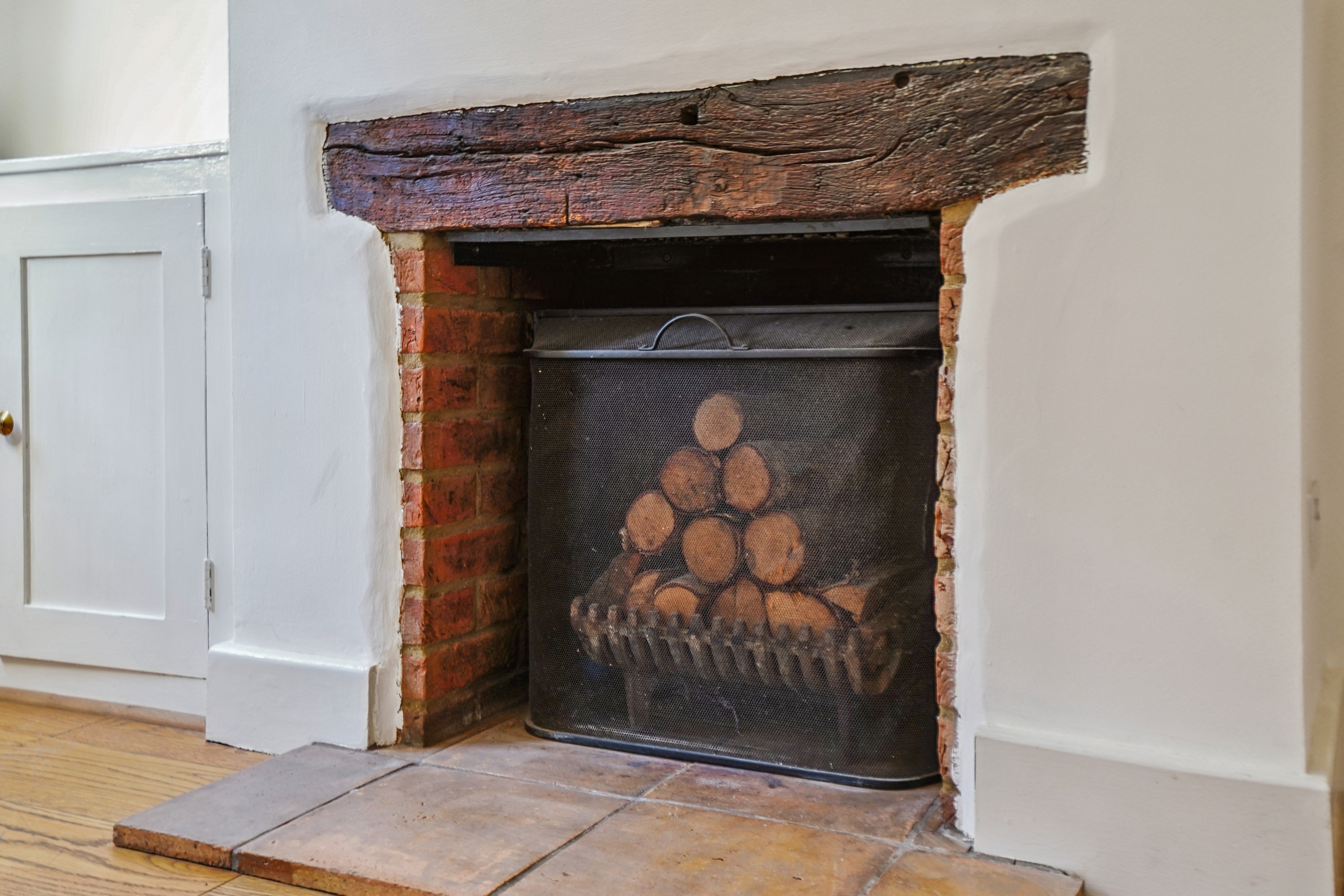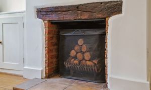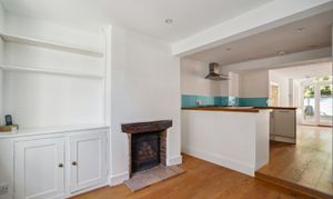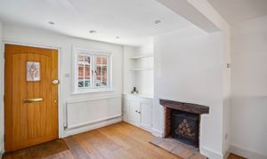 Upon entering the home, you're welcomed into a cosy yet spacious living room, featuring a working fireplace with an attractive exposed brick feature, integrated shelving and a useful storage cupboard. The room is finished with stylish engineered wood flooring, adding warmth and character.