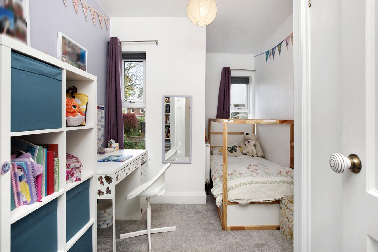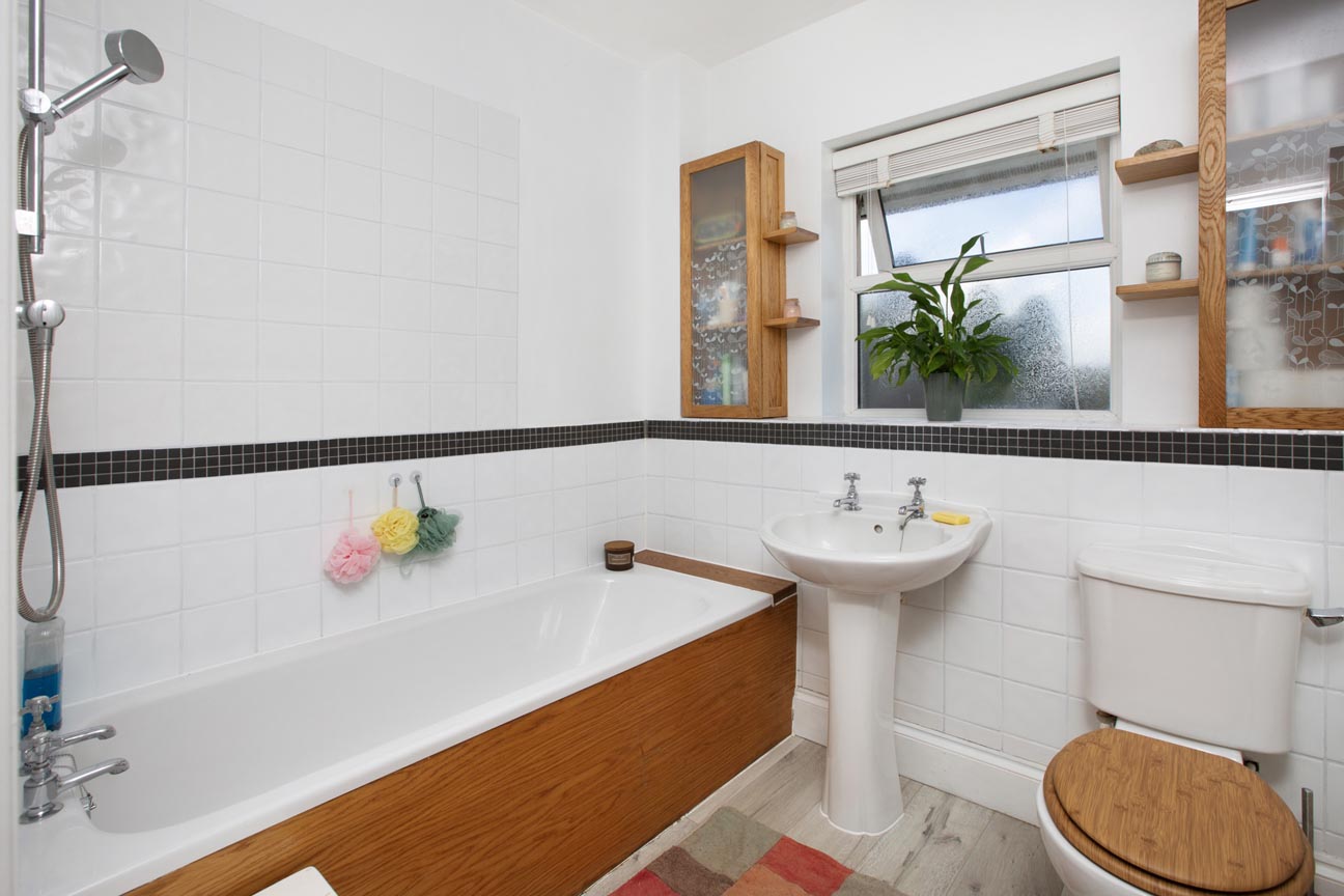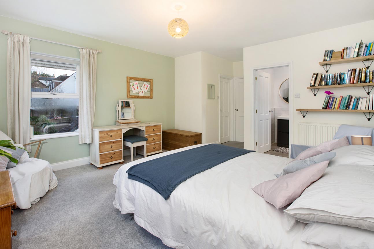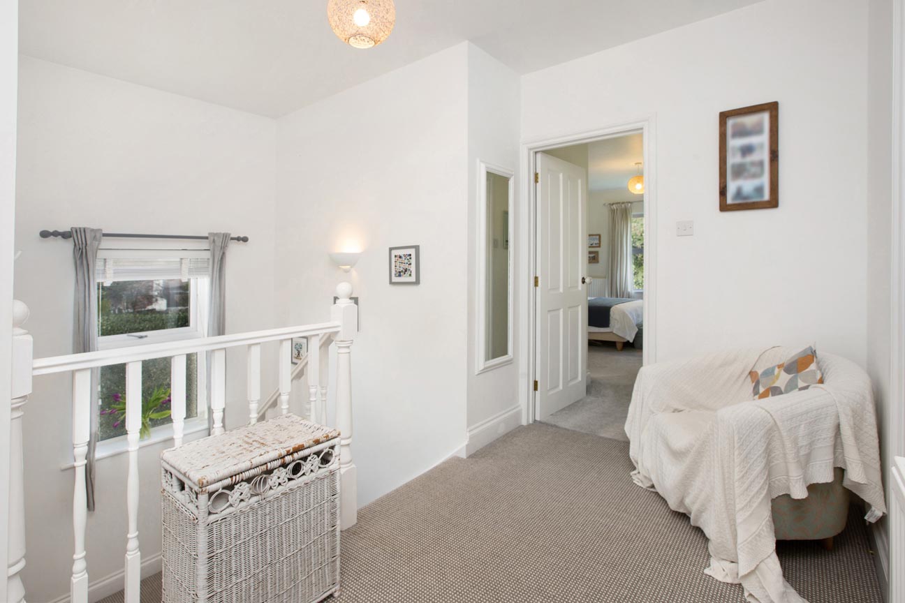 The first floor continues the home’s light and airy feel, with a window illuminating the landing and creating a bright, welcoming space. The principal suite is particularly impressive — a generous double bedroom enjoying dual-aspect views across the rear garden. This room is complemented by a stylish En-suite shower room, recently updated with contemporary fittings, and a spacious walk-in wardrobe offering excellent storage and organisation. Bedrooms two and three are both well-proportioned doubles, each offering ample space for furnishings, with bedroom three further benefitting from a built-in wardrobe. The fourth bedroom is a comfortable single room, enhanced by dual-aspect windows and a substantial built-in cupboard, making it ideal as a child’s room, guest room, or study. The family bathroom is tastefully appointed, featuring a bath with overhead shower, WC, and wash basin.