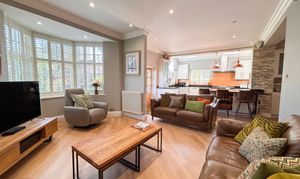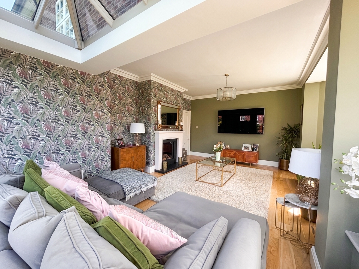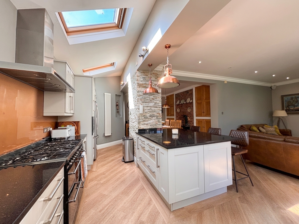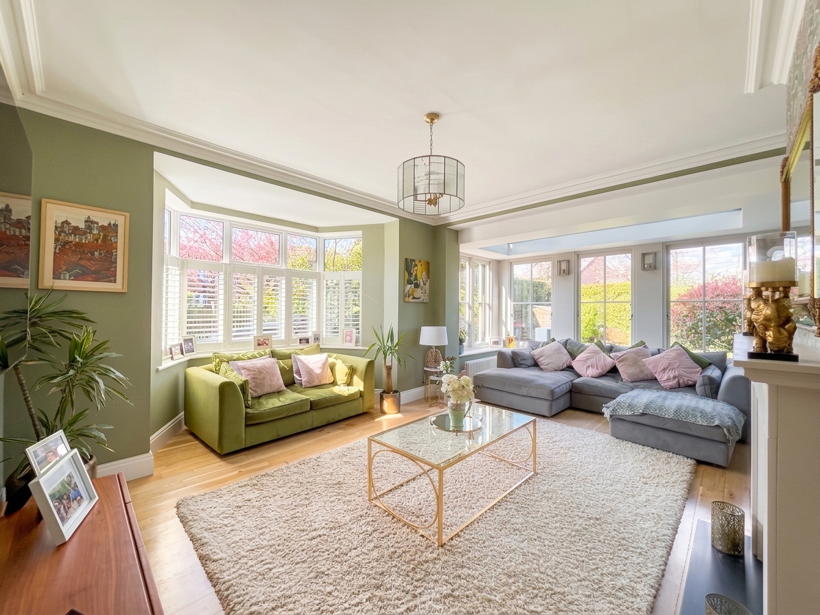 The spacious layout includes a large welcoming porch through to entrance hall, multiple reception rooms, a spacious kitchen/lounge/diner, and well-proportioned bedrooms, 2 of which are en-suite, providing ample space for comfortable living. The property features tasteful décor that enhances the sense of space and light.