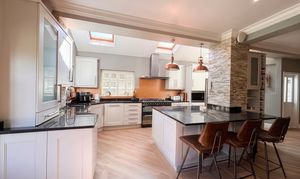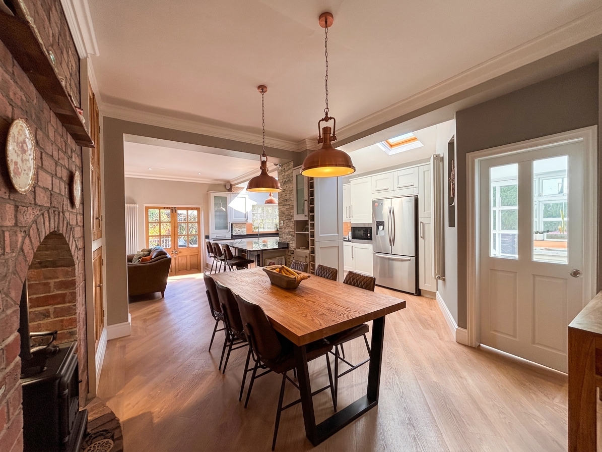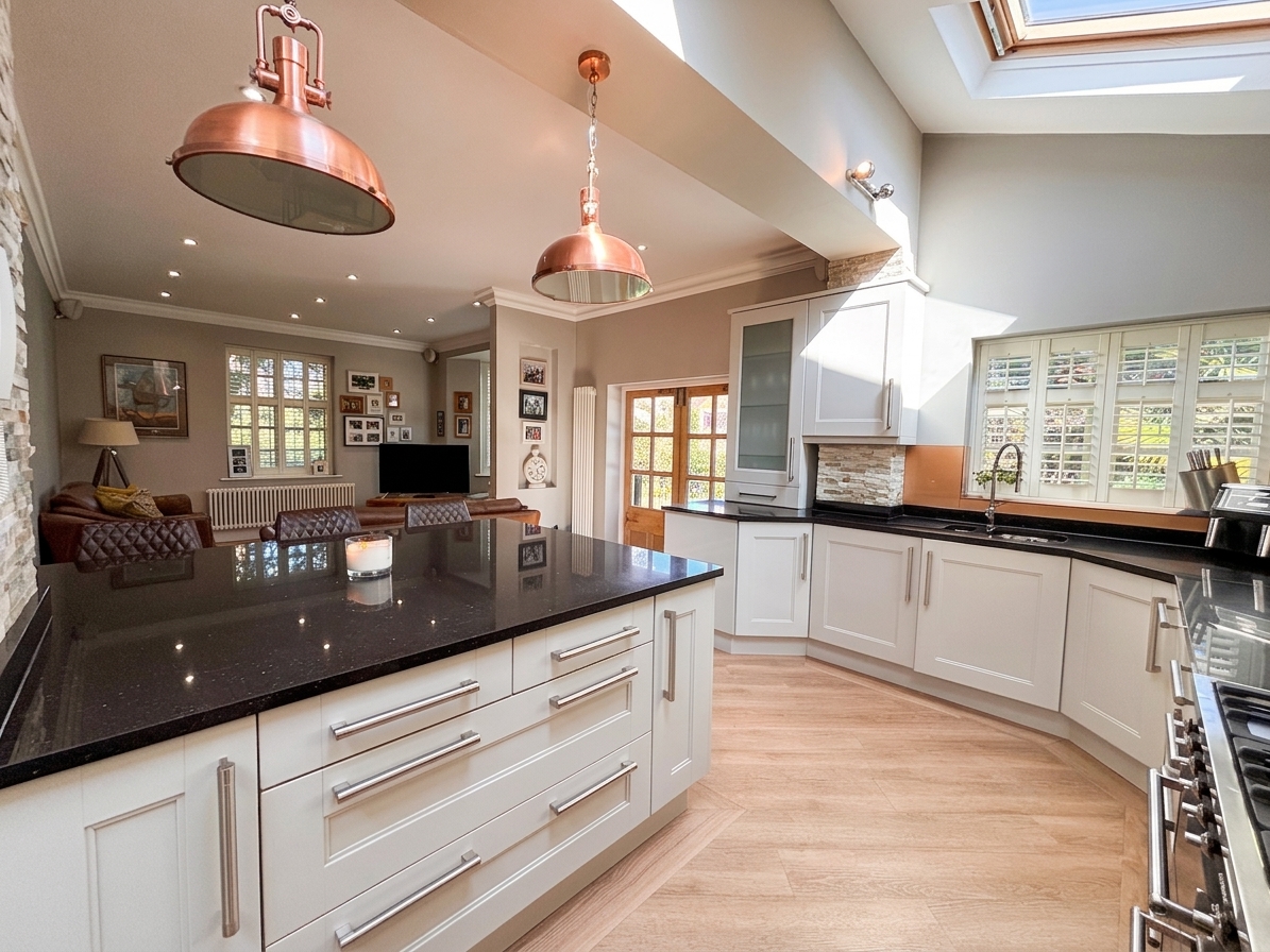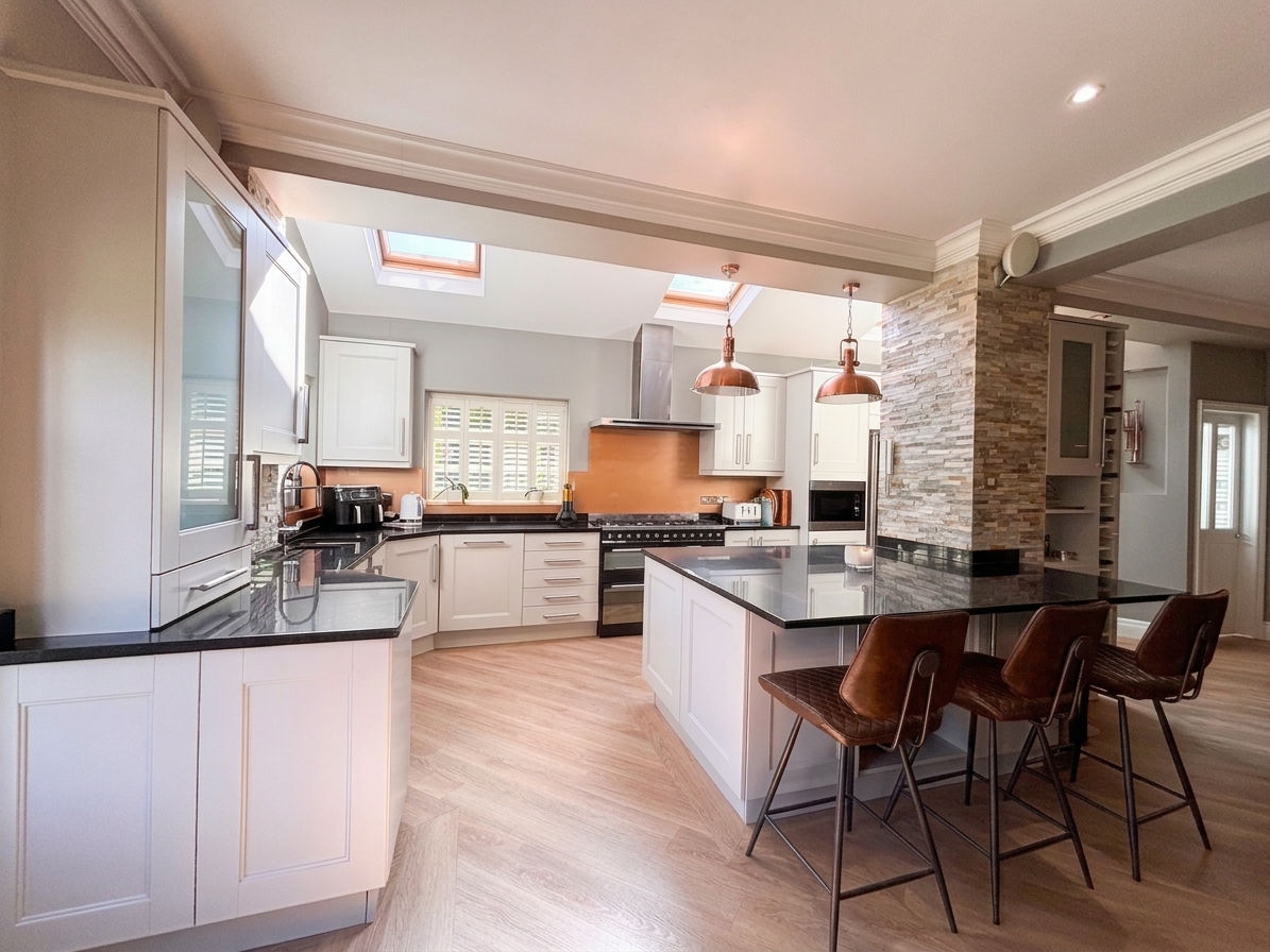 The spacious layout includes a large welcoming porch through to entrance hall, multiple reception rooms, a spacious kitchen/lounge/diner, and well-proportioned bedrooms, 2 of which are en-suite, providing ample space for comfortable living. The property features tasteful décor that enhances the sense of space and light.