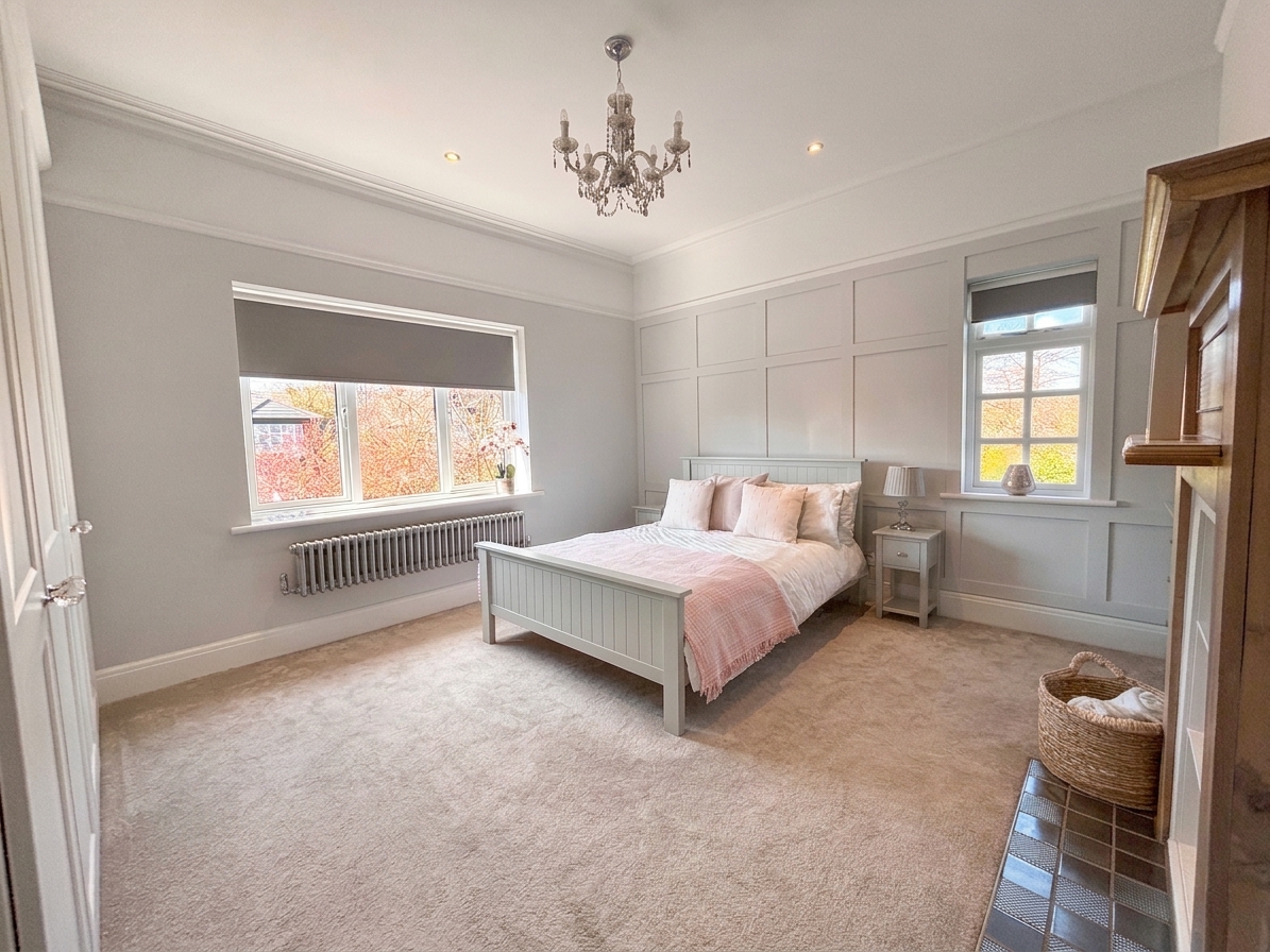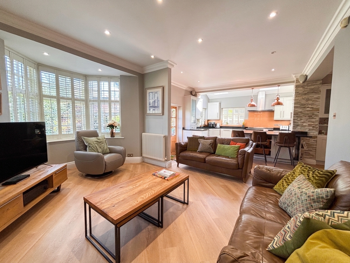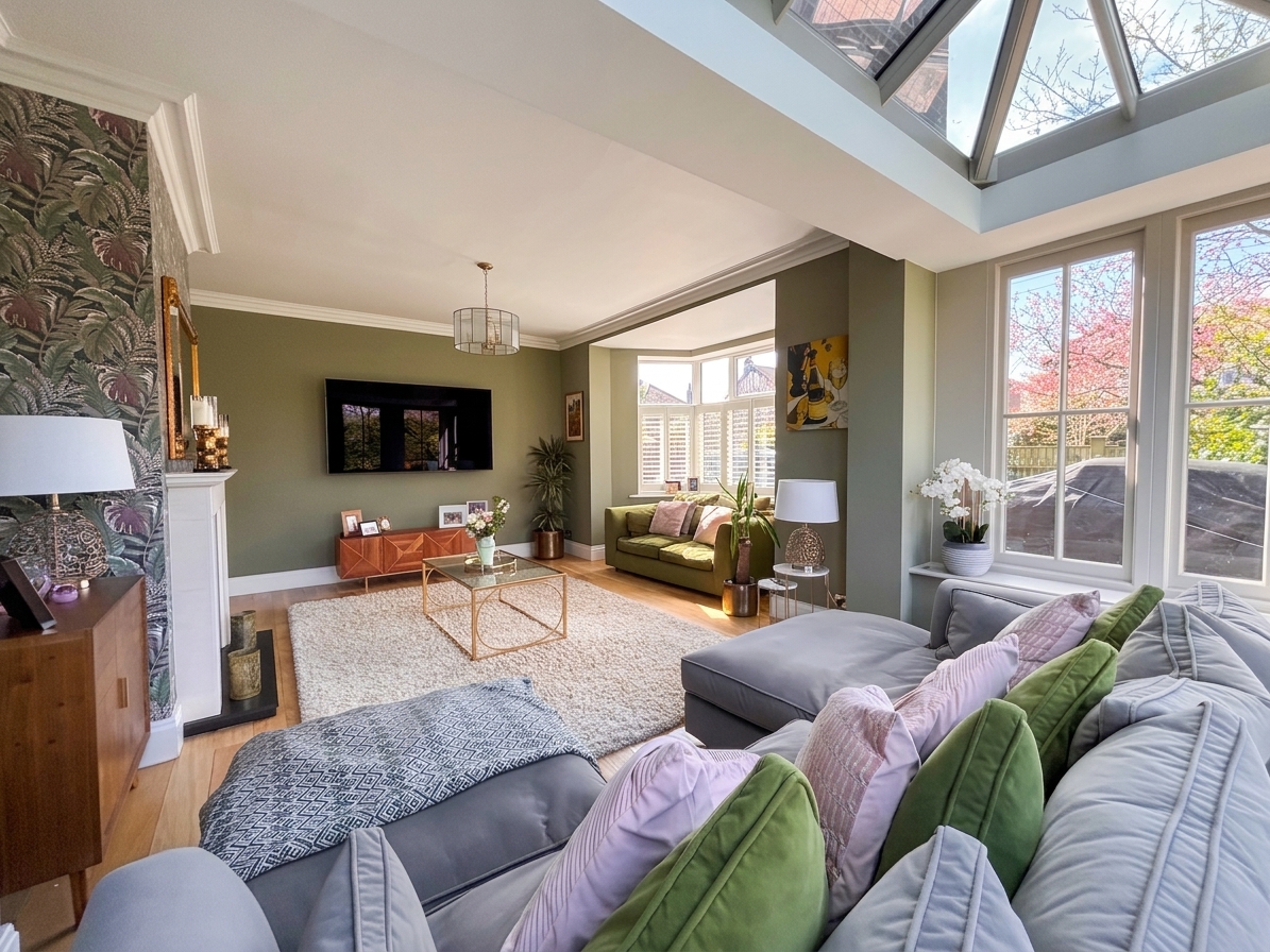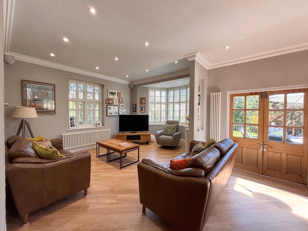 Bay window to the front elevation with fitted plantation shutters. Sky lantern. Windows to the side and front elevation. T.V point. Ceiling coving. Solid wood flooring.
