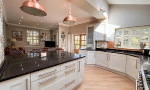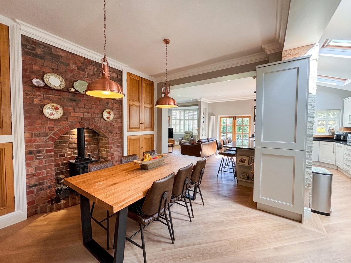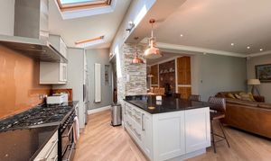 Dual aspect with windows to the rear and side elevations. Vaulted ceiling with three sky lights and French doors to the rear elevation leading out onto a decked seating area. Fitted with a range of wall and base units complete with black granite work surfaces with integrated dishwasher and spaces for a range cooker and American Style Fridge Freezer. Inset spotlights. Original fitted cupboards to both alcoves. Feature exposed chimney breast with log burning stove. Ceiling coving. Open to: