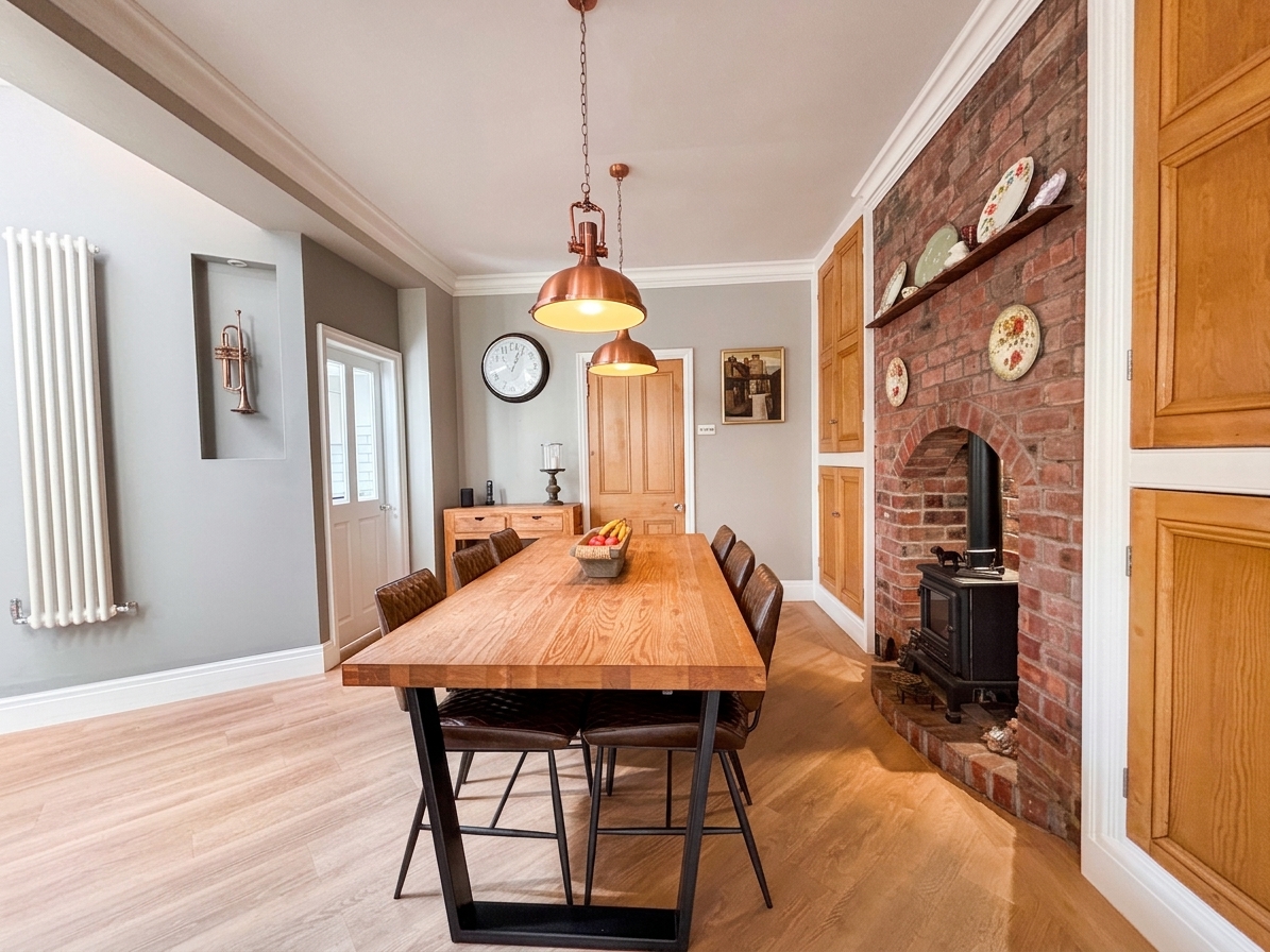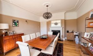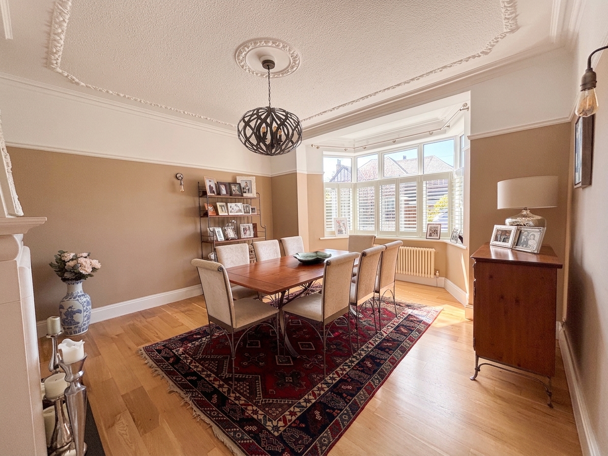 Bay window to the front elevation with fitted plantation shutters. Ceiling coving. Solid wood flooring. Original fire surround complete with a gas living flame fire.