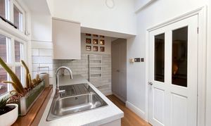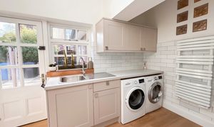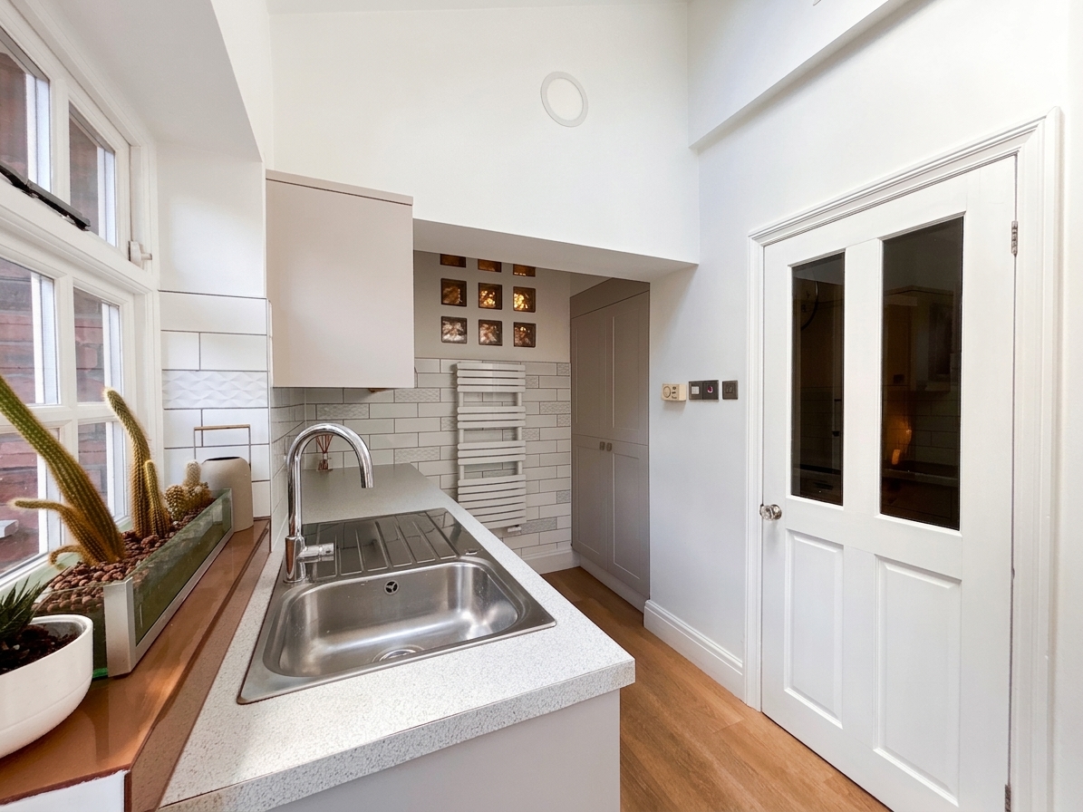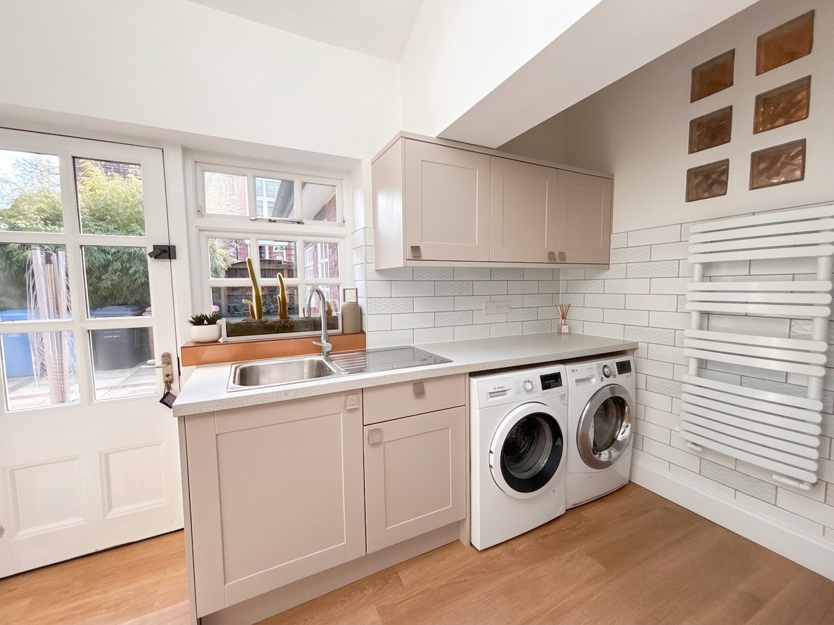 Vaulted ceiling with sky light. External door and window to the rear elevation. Fitted with a sink unit with plumbing facilities for a washing machine and tumble dryer.