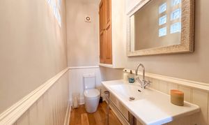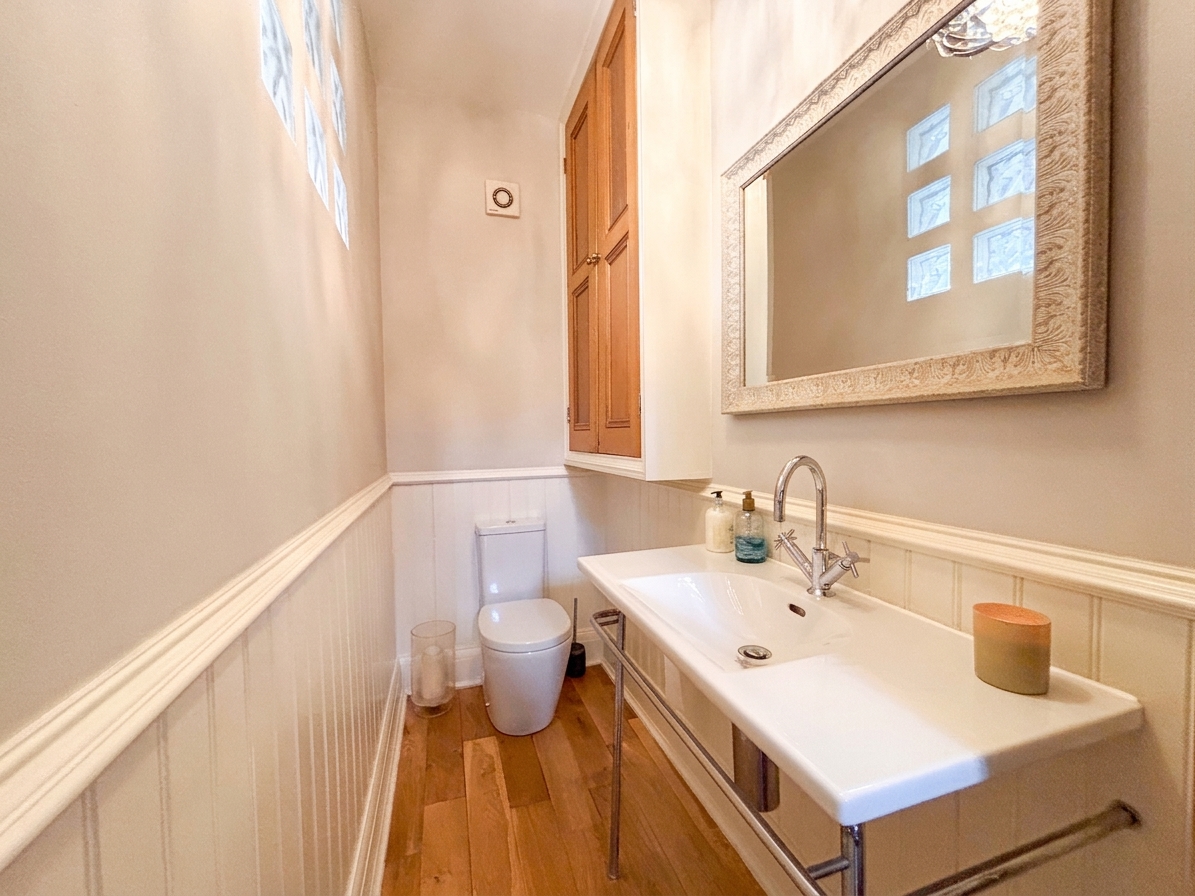 Solid wood flooring. Dado rail. Low level W.C and a wash hand basin.
