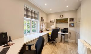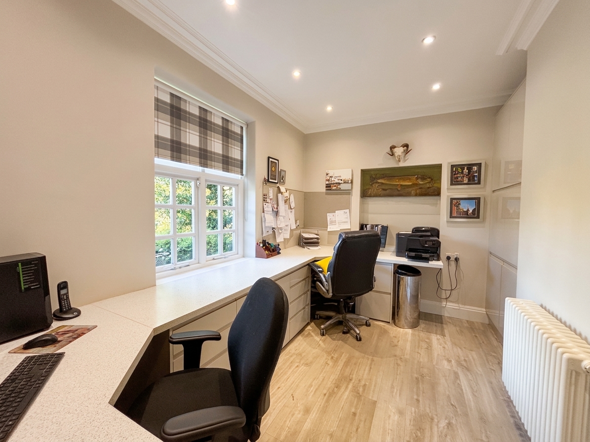 Window to the elevation. Fitted desk and drawer units. Inset spotlights. Fitted cupboards to both alcoves.
