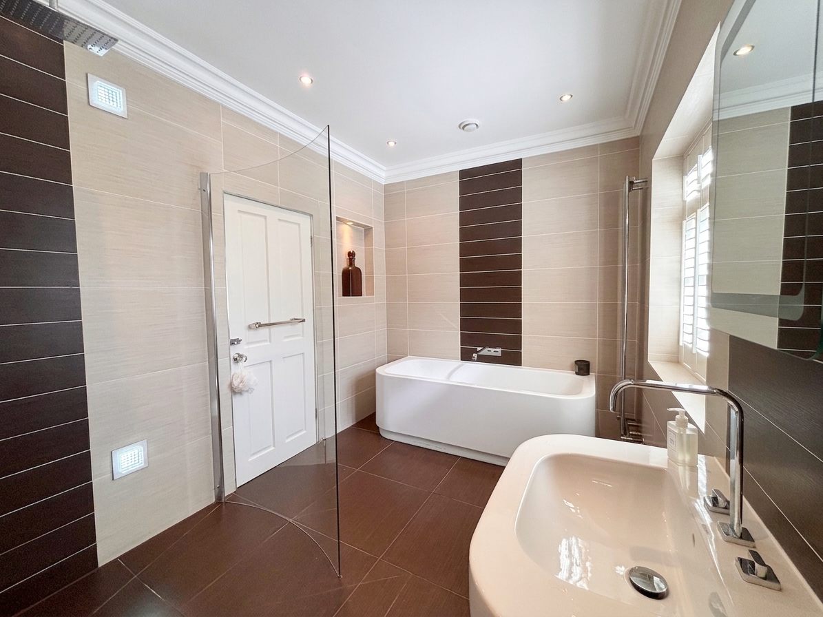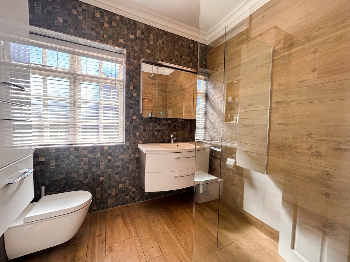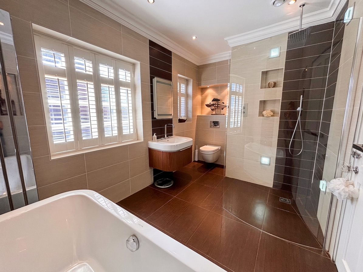 Two windows to the side elevation with fitted plantation shutters. Ceiling coving. Fully tiled walls and floor. Fitted with a bath, a walkin shower, vanity hand wash basin and a low level W.C. Inset spotlights.