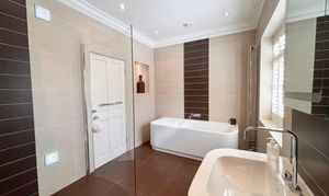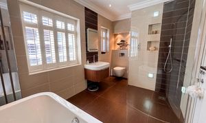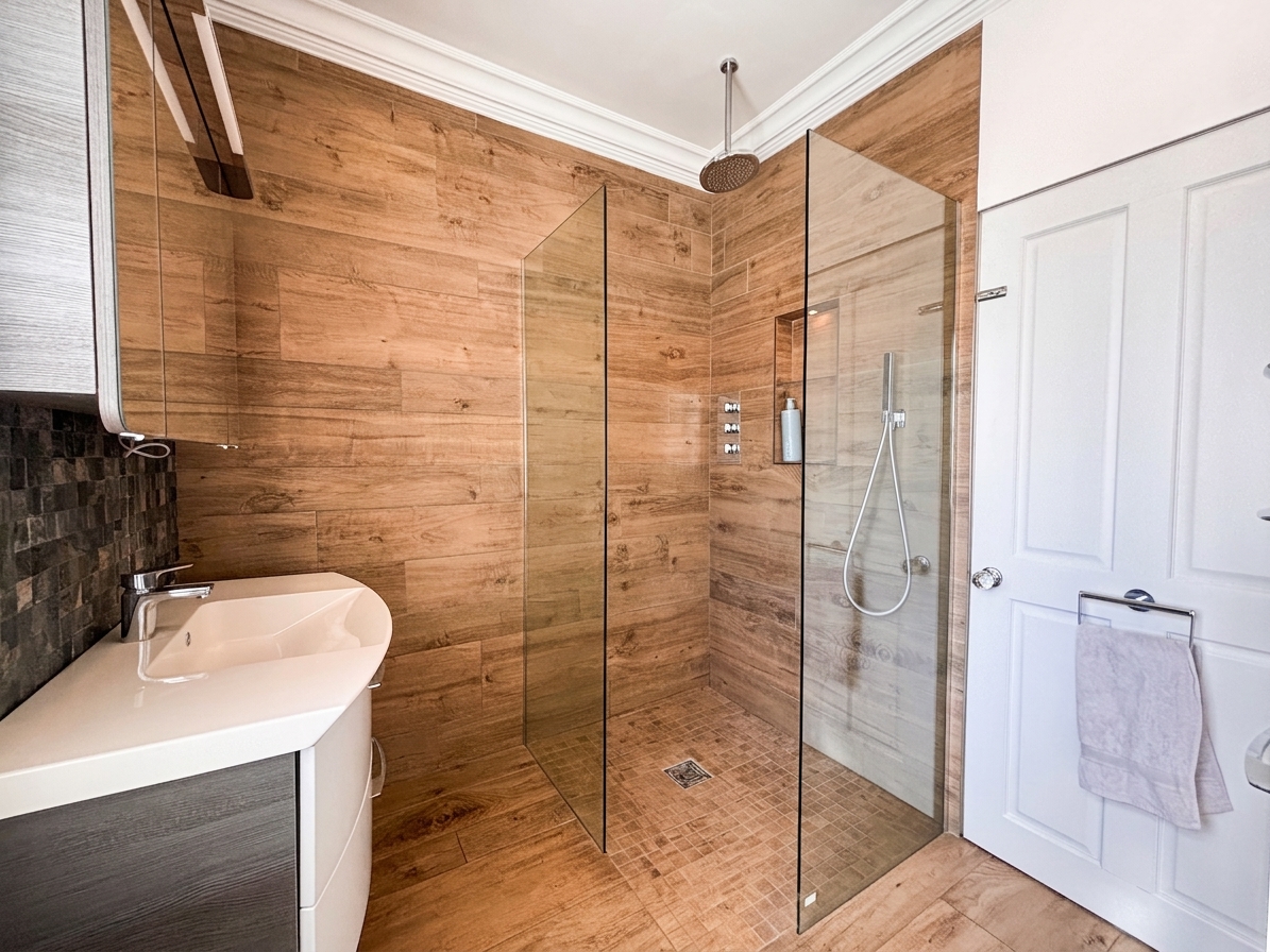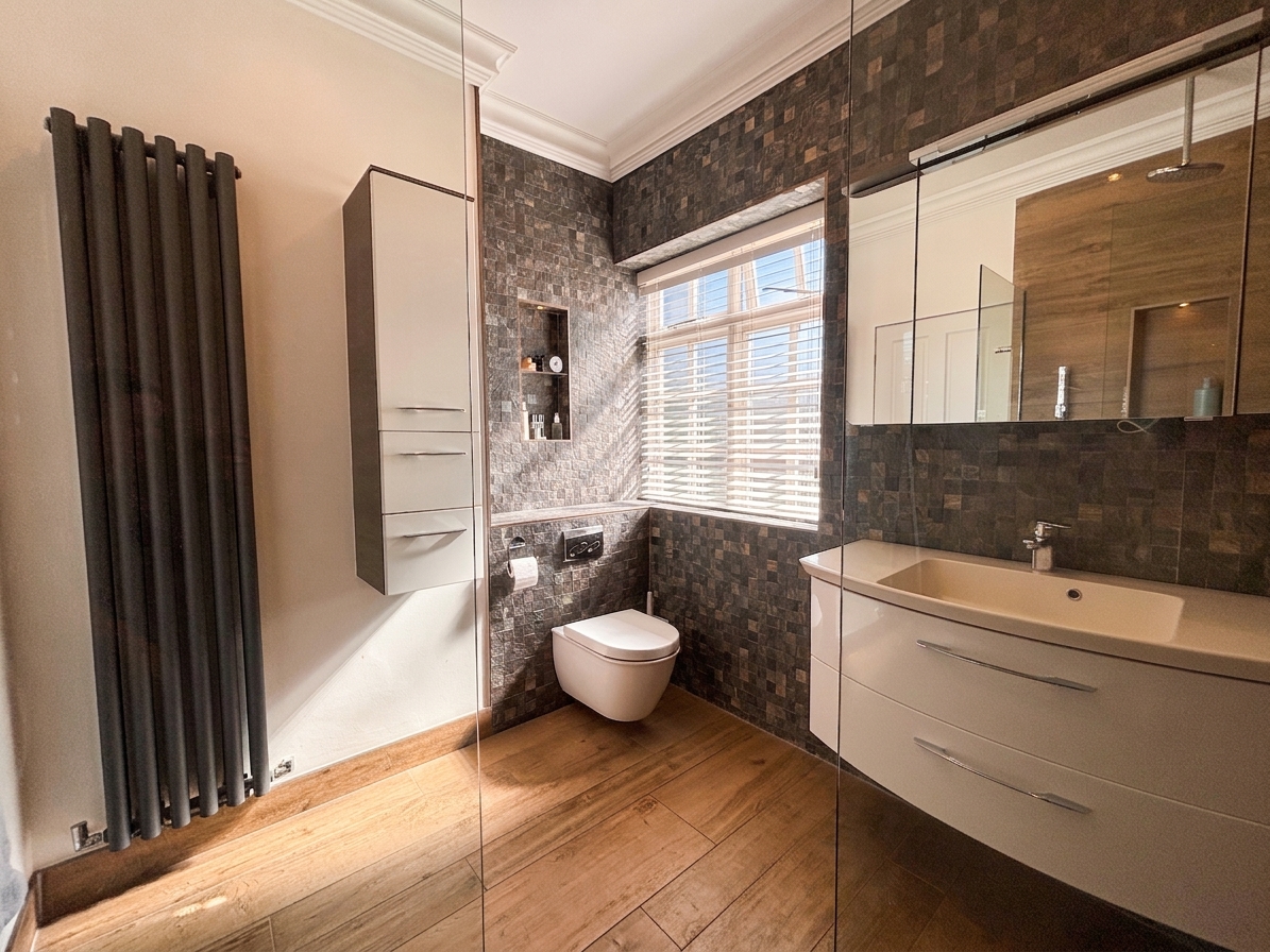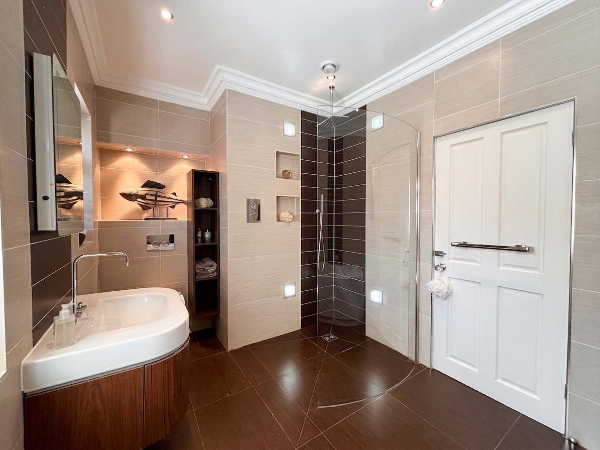 Two windows to the side elevation with fitted plantation shutters. Ceiling coving. Fully tiled walls and floor. Fitted with a bath, a walkin shower, vanity hand wash basin and a low level W.C. Inset spotlights.