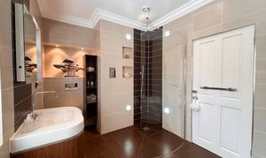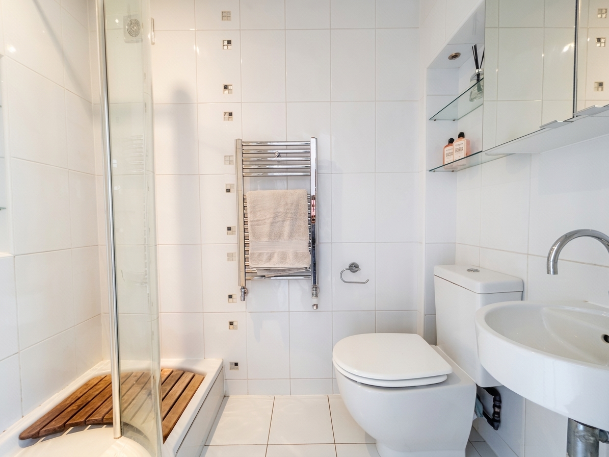 Fully tiled walls and floor. Fitted with a shower cubicle, low level W.C and a wash hand basin. Inset spotlights.