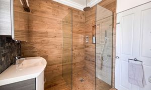 Window to the side elevation. Part tiled walls and floor. Fitted with a walkin shower, vanity hand wash basin and a low level W.C. Ceiling coving. Inset spotlights.