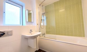 Fully tiled family bathroom with bath, shower over, wall-mounted sink and WC.