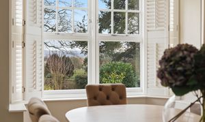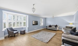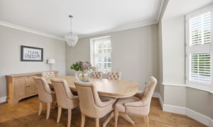 To the front is an elegant dining room with a bay window, traditional fireplace and sash windows with fitted shutters. Also accessed from the hallway is the main sitting room, an exceptionally generous space with a further bay window and sash windows, a log burner, and a wonderful sense of light and space.