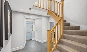 A welcoming porch opens into a partly double-height entrance hall with stone flooring and a striking staircase. The hall benefits from useful storage, a WC and cloakroom, while underfloor heating runs throughout the ground floor. From the hallway, doors lead to the principal reception rooms.